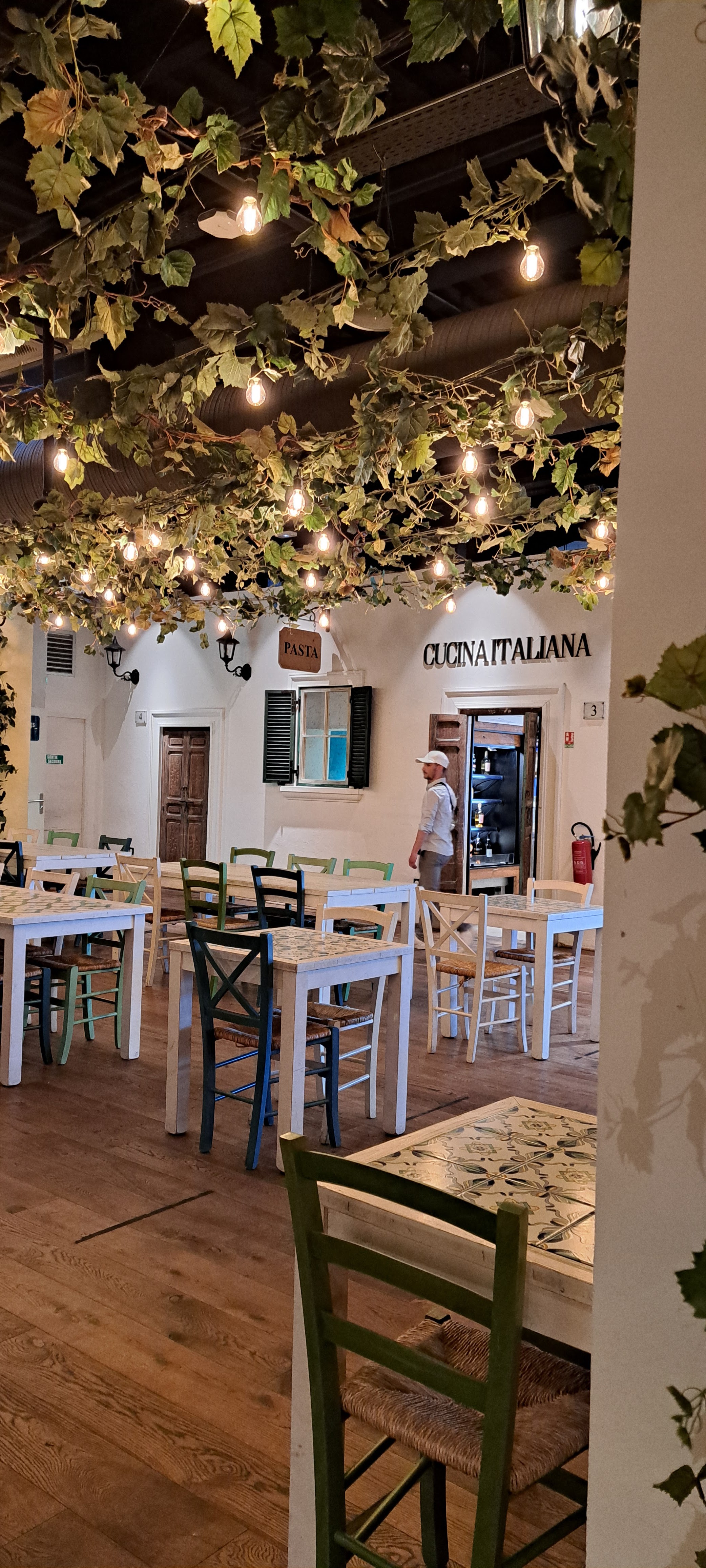 Un restaurant populaire qui permet à tout le monde de manger dans un décor de village italien en intérieur ou sur une terrasse qui permet de voir de voir la méditerranée de st Laurent du Var à Villeneuve Loubet. Des plats simples avec un concept efficace où la va chercher soit sa pizza, ses pâtes ou ses antipasti dans des très jolis stands.