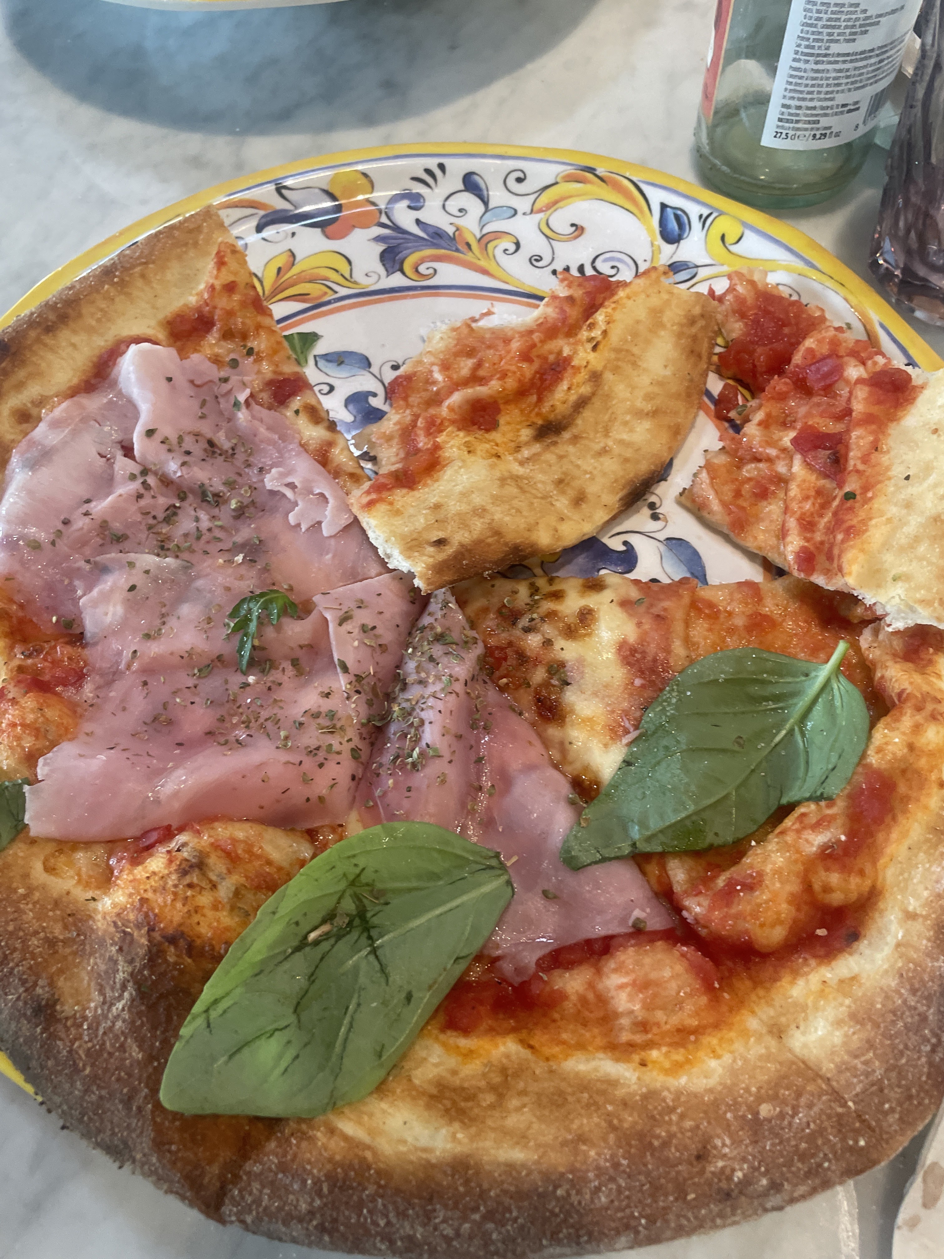 Petite pause après le shopping endroit merveilleux.D origine napolitaine des mon entrée j ai été transportée à NAPLES lieu de naissance de ma mère. Décoré avec soin et minutie tout y est plafond Décoré d agrumes des fenêtres ou du linge est étendu souvenirs de mon enfance.beaucoup d émotions Rien n'a été négligé. En bonne napolitaine j ai pu déguster une pizza ou trônait une burrata di buffala pour réveiller mes papilles.un vrai orgasme culinaire.je recommande vivement.auguri di cuori