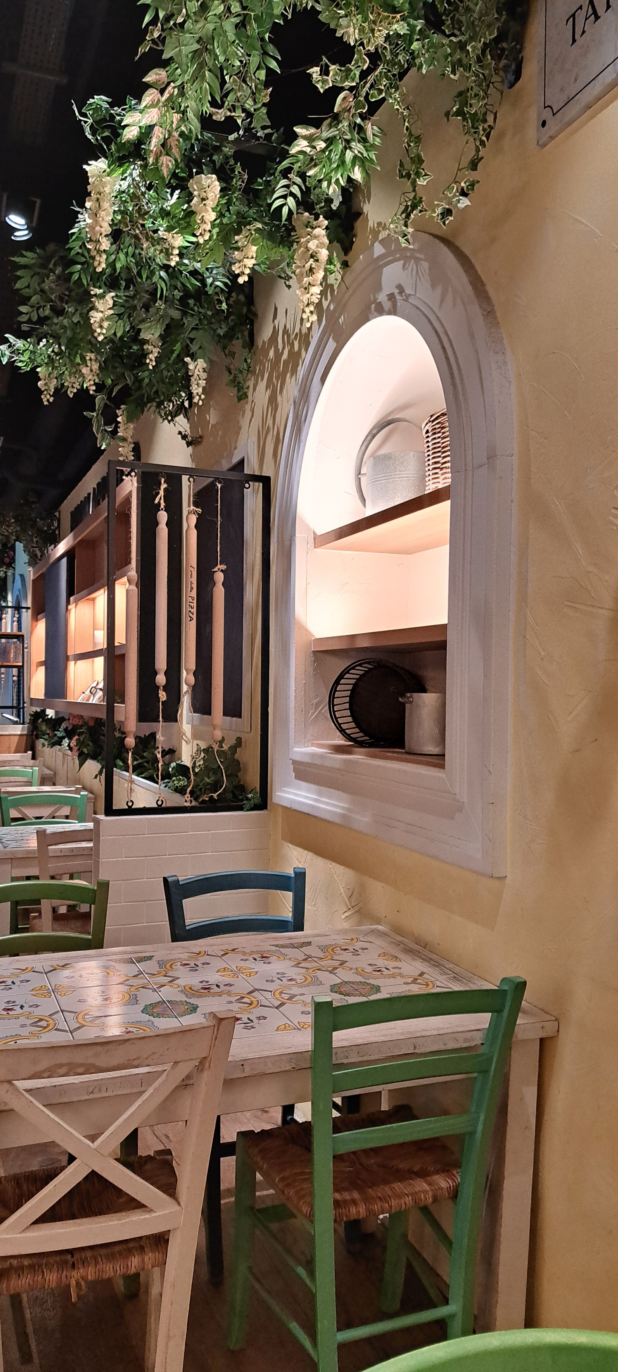 Joli concept. Ils ont réussi à recréer à l'intérieur du centre commercial cap3000 un bout d'Italie. Où on paraît se croit flâner dans les ruelles au détour terrasses et balcon ou le linge y est suspendu, la circulation y est fluide dans les allées des différents points de commande. Tantôt les pizzas, tantôt la pasta, entre antipasti et insalate. Bienvenue au village.