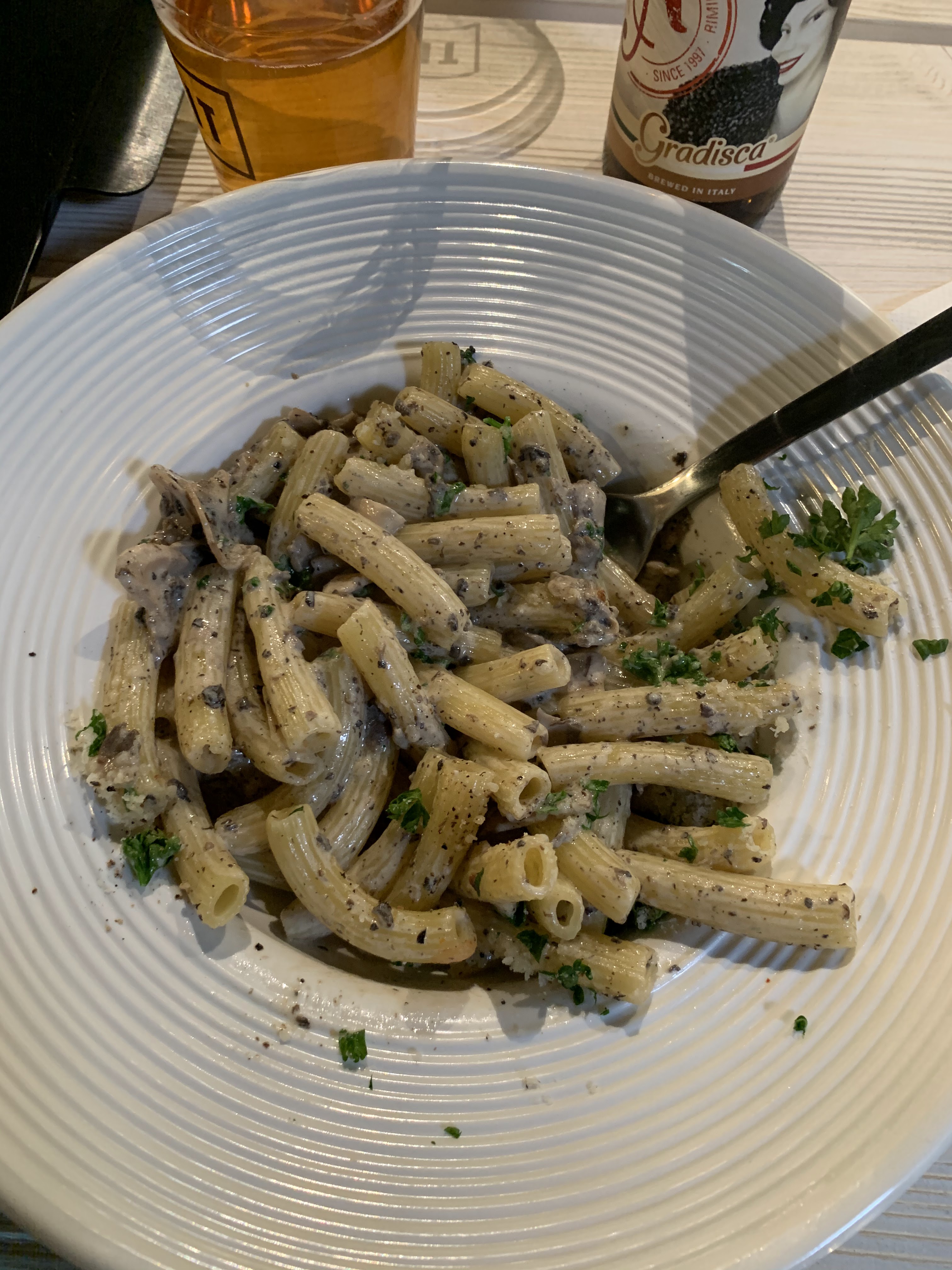 Déçues les pâtes sont vraiment pas bonnes, la preuve de nos assiettes non finies... Le décor est très sympathique. Le personnel n'a rien compris à notre demande. Ça va qu'il y a les bornes ! Personne pour nous orienter. Seul un gentil serveur au bar pour nous donner un verre d'eau. C'était juste mon anniversaire ! Une fois, pas 2...