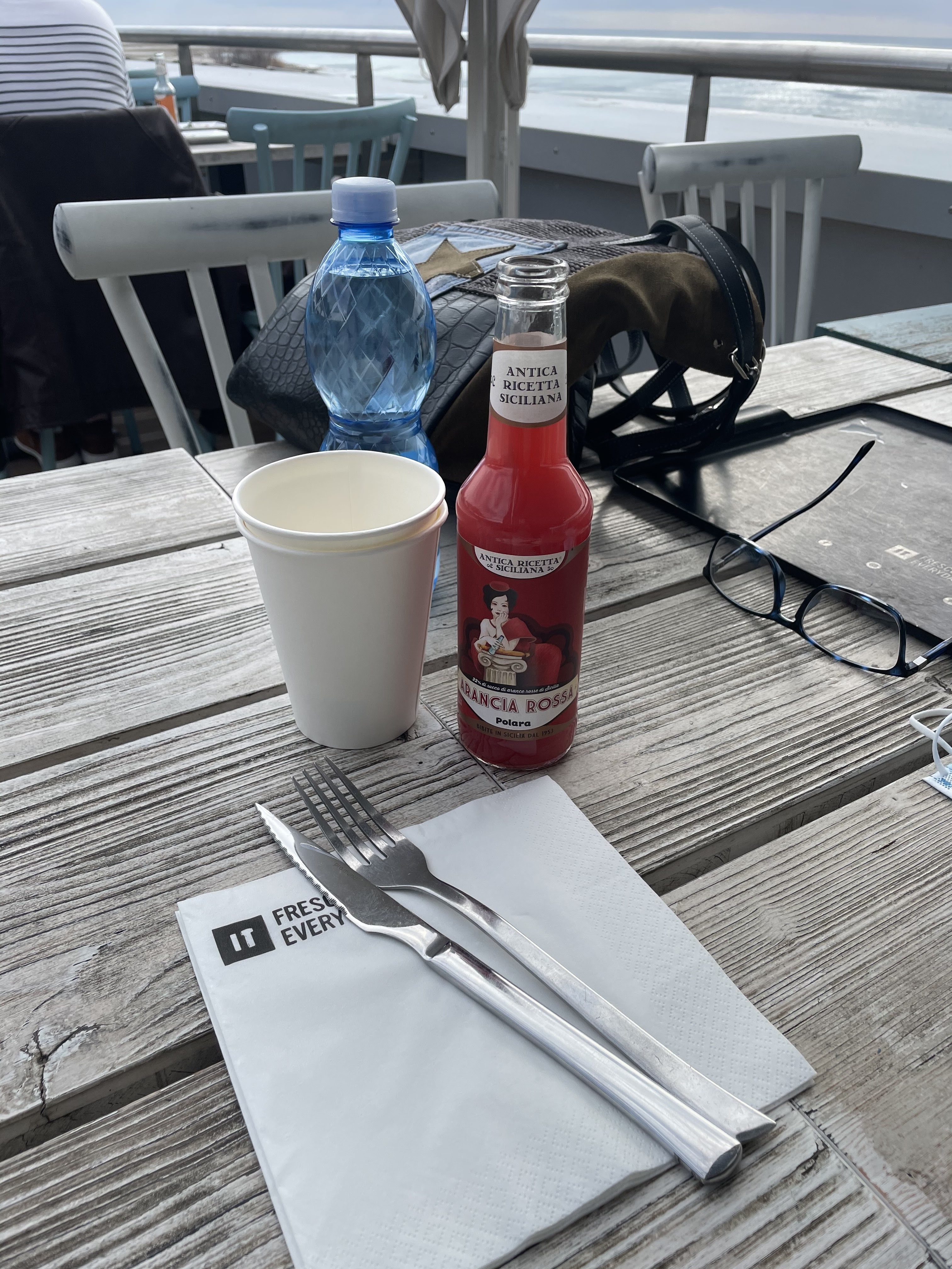 Bonne ambiance, il y a beaucoup de produits italiens. La terrasse est très belle avec la vue mer