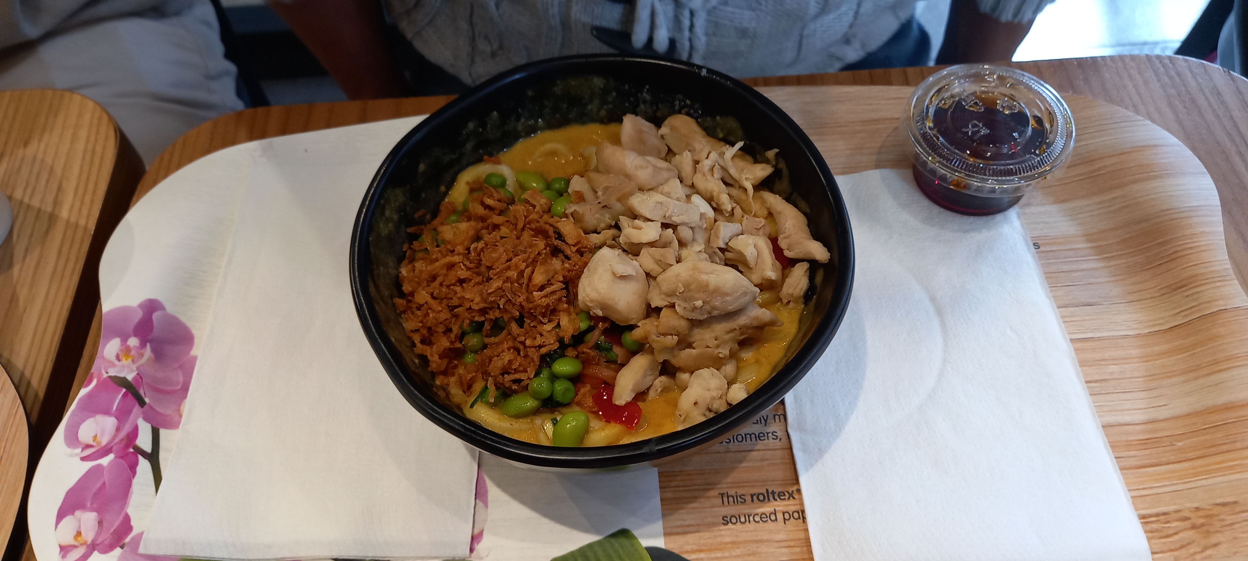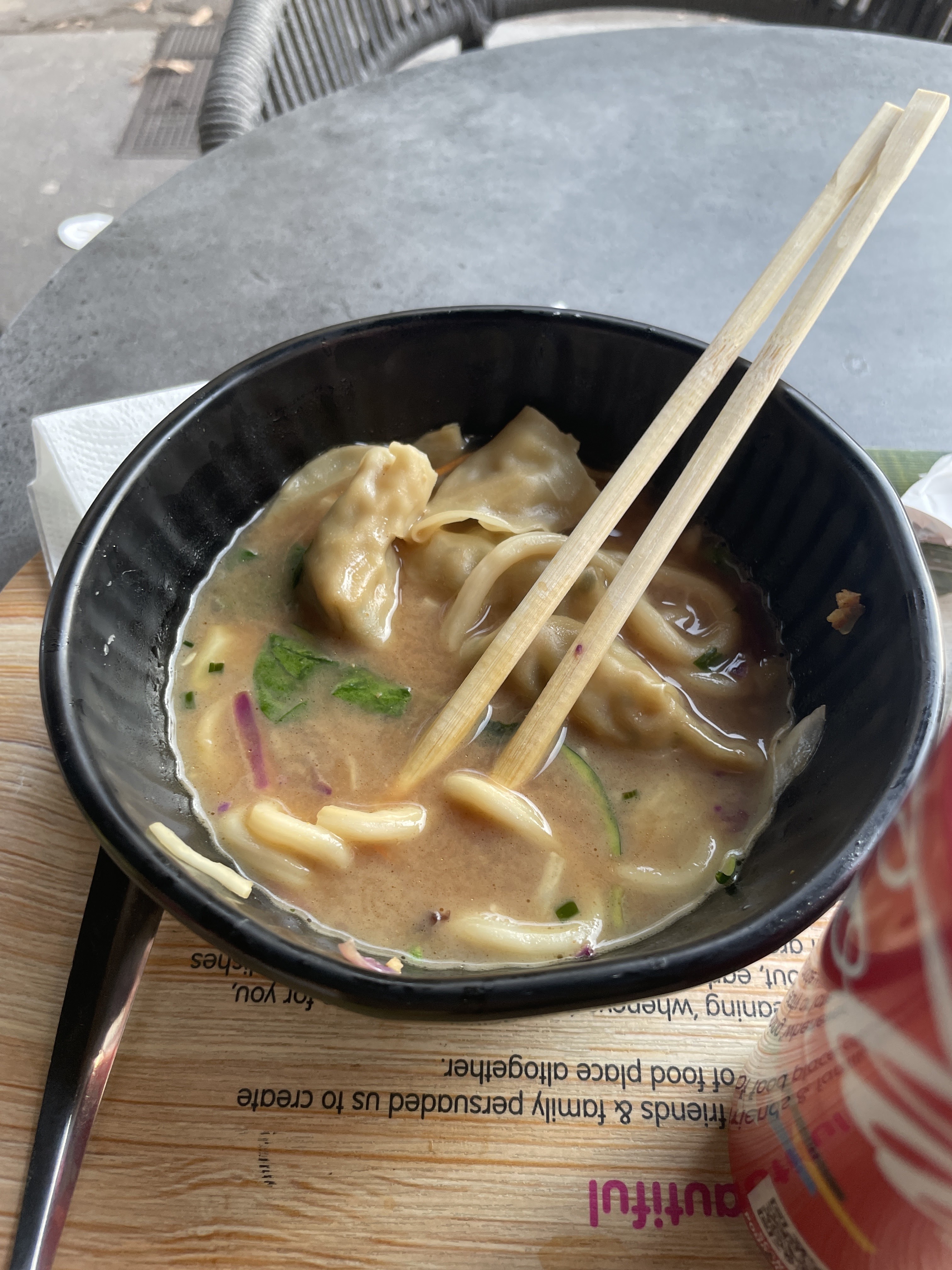 J’ai pris des nouilles avec des gyozas au poulet et c’était très bon. Toutefois, le prix est élevé pour la quantité servie. J’ai détesté le thé bio à la cerise/hibiscus.