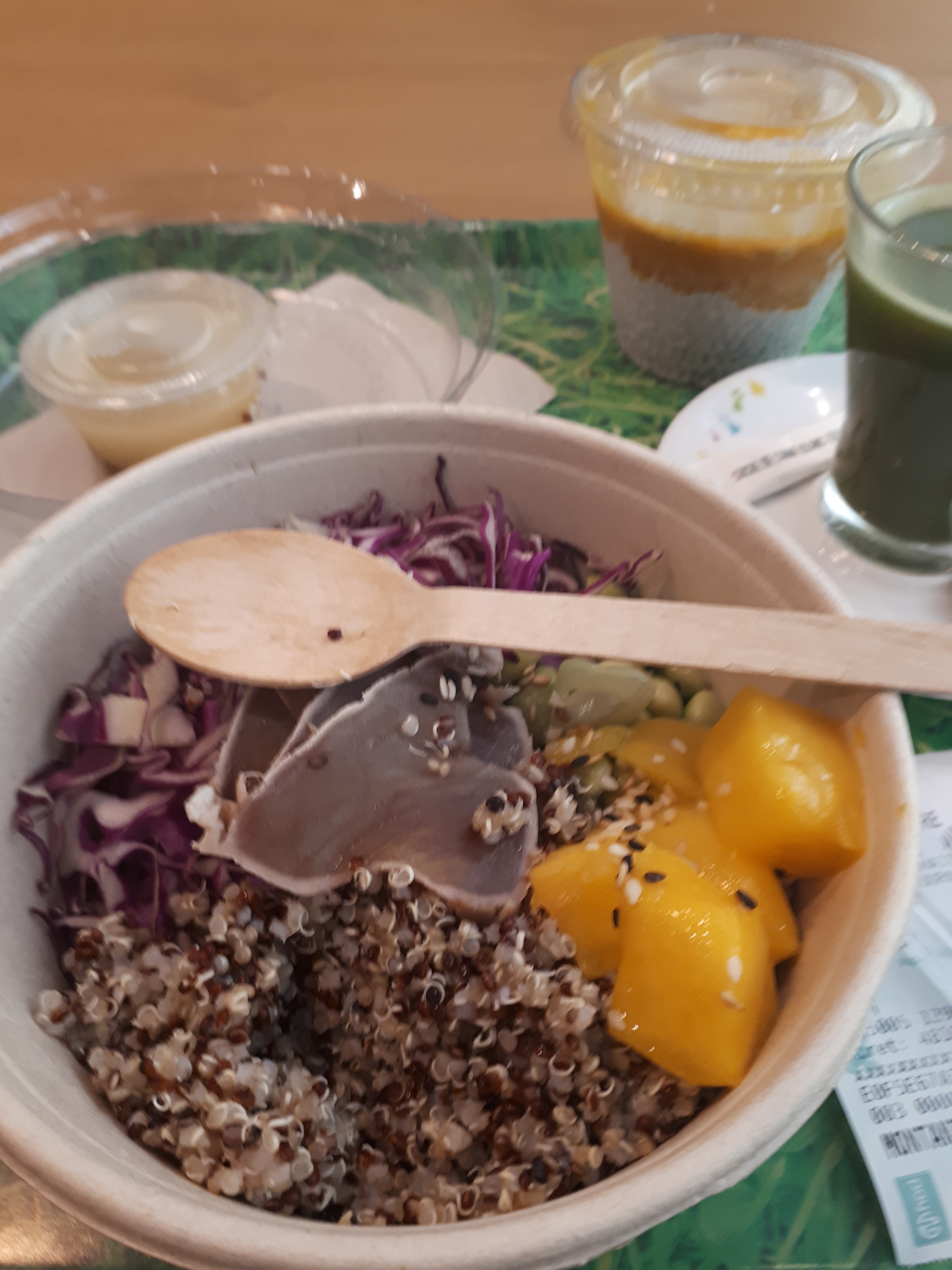 J'opte pour une salade de pâtes, avec des petits pois, des lamelles de carottes transparentes, une boulette de mozzarella, une dizaine de grammes de poulet émietté, 2 cuillères à soupe d'huile et 1 de vinaigre. Le tout dans un bowl à 9€40 !! Et bien quand on mélange des ingrédients fades on obtient un plat insipide.. Bio ne veut pas dire sans goût !! Et vos prix sont exorbitants ! Je déconseille