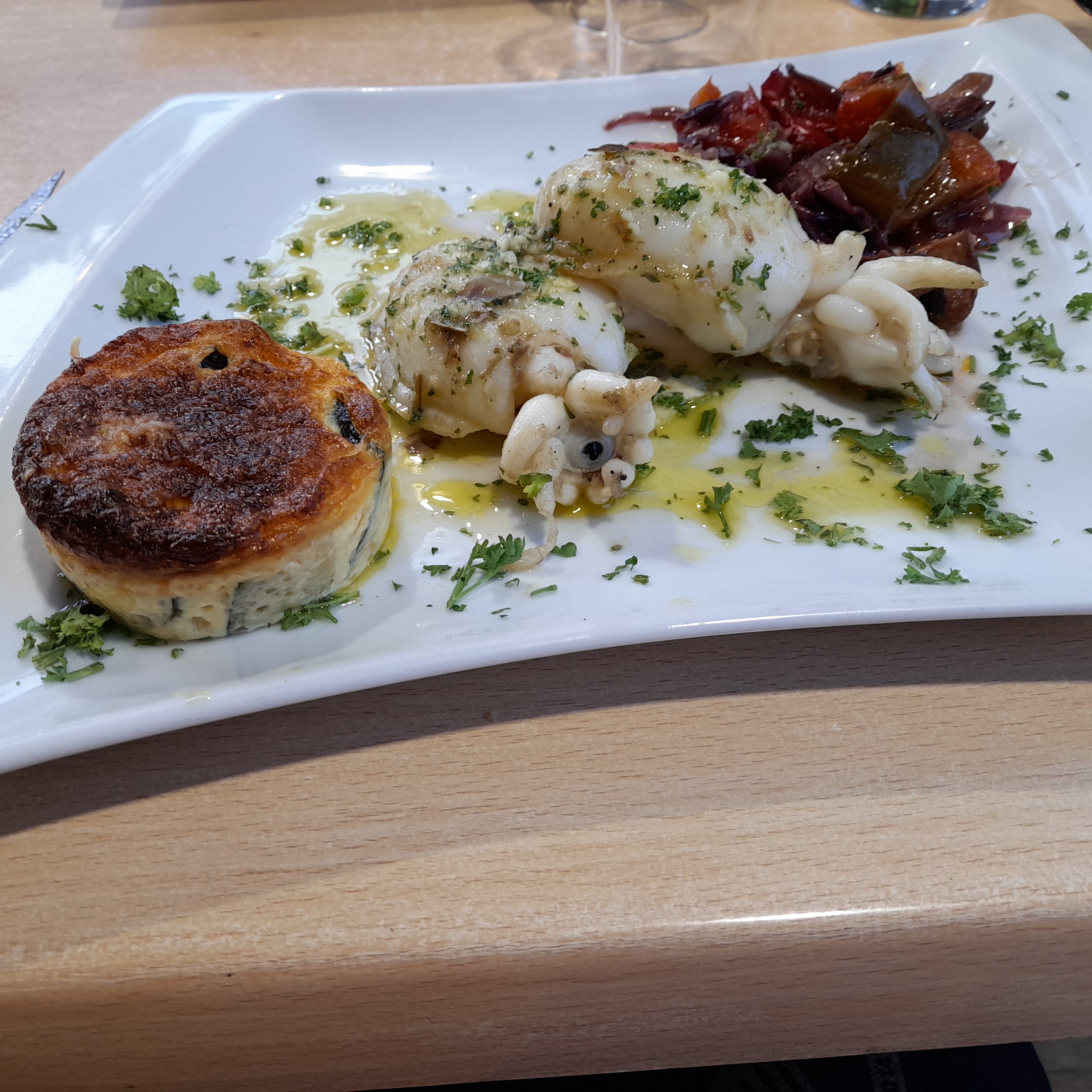 DÉCEVANT! Personnel perdu, plusieurs serveurs pour une même table. Plats mal présentés, pas un peu dd salade de présentation dans l'assiette. Sauce au poivre payante avecl'onglet. Pomme de terre pas cuite avec les seiches. Piège à touristes ! A fuir!!!!!! Jamais nous y retournerons