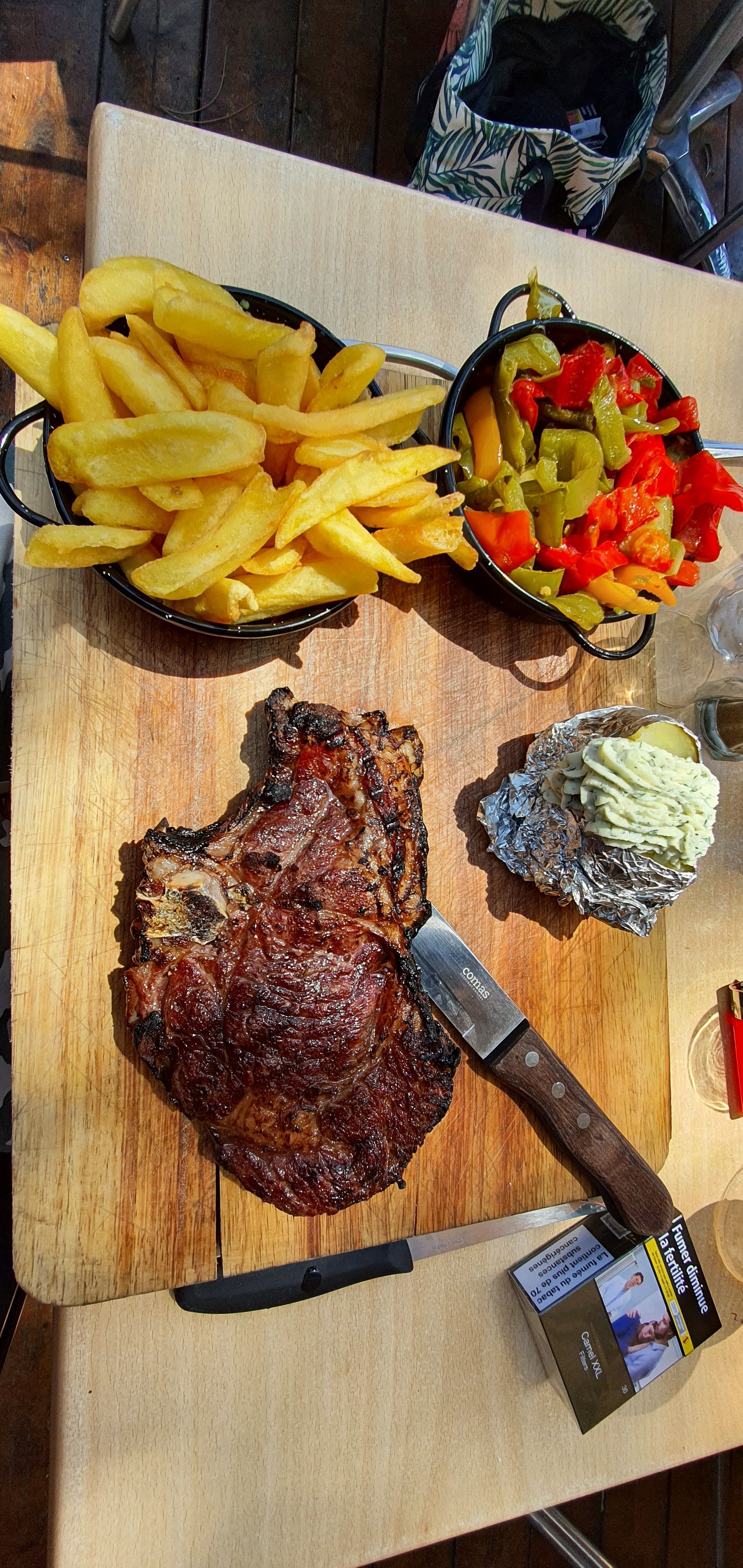 Côté de bœuf de mauvaise qualité très grasse et arrière goût de périmé On coupe devant nous mais on se retrouve vite avec plus que demander car viande au kg 500g demandé à 37.5e et on se retrouve avec 722g à 56e attention ⚠️ Moule moyenne trop cuite ou pas assez cuite pas nettoyer croustille et demande avec sauce poivron chorizo et on a eu une ratatouille en sauce Patron désagréable et hautain ne vaux pas le prix payer à la qualité du repas beau en extérieur mauvais à l intérieur très déçu
