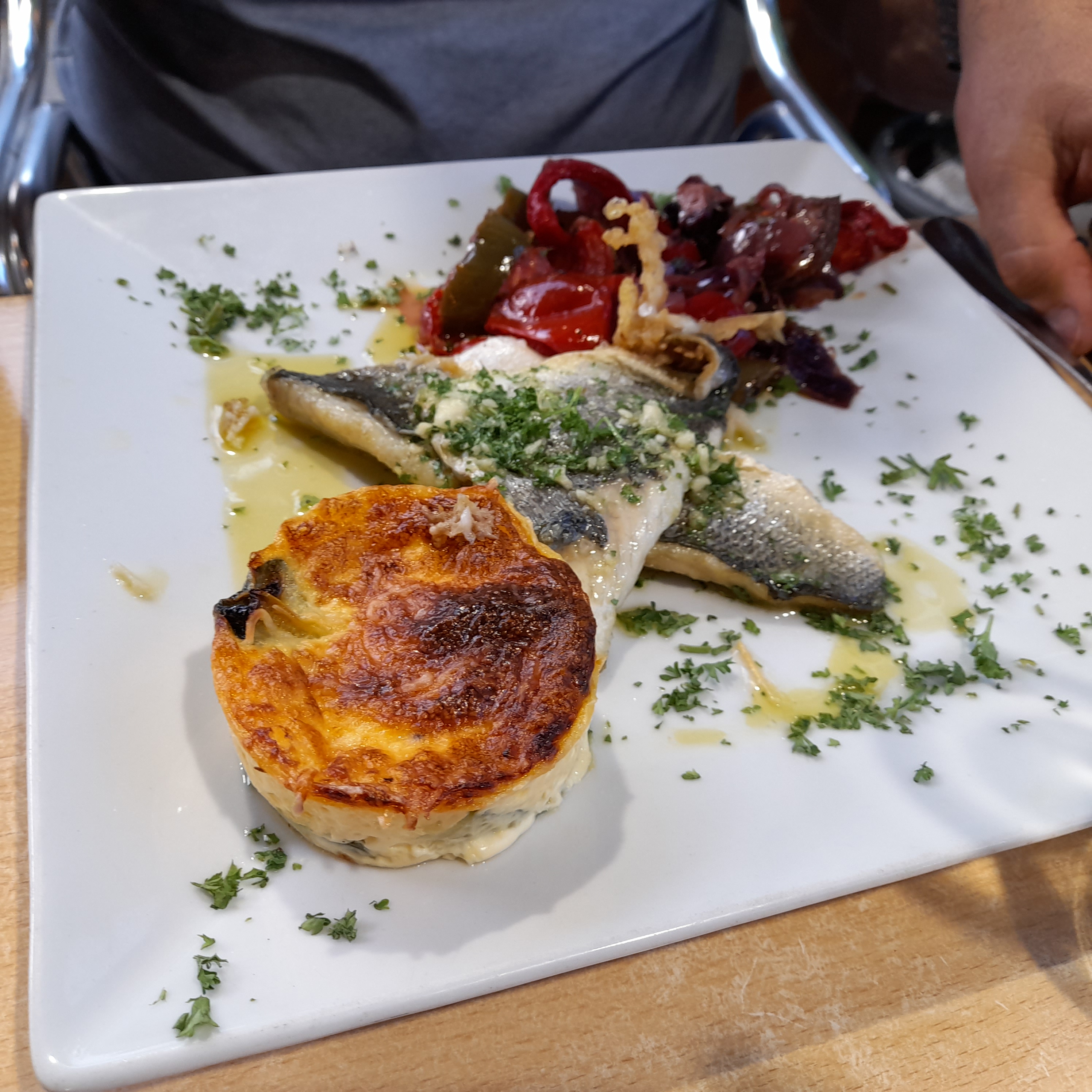 Serveurs super sympa et rigolo, ambiance agréable, cuisine bien préparé et jolie présentation, duo de poissons , pâte girolles cognac fait devant nous et pizza crème chorizo lardons , tout était excellent je recommande vivement