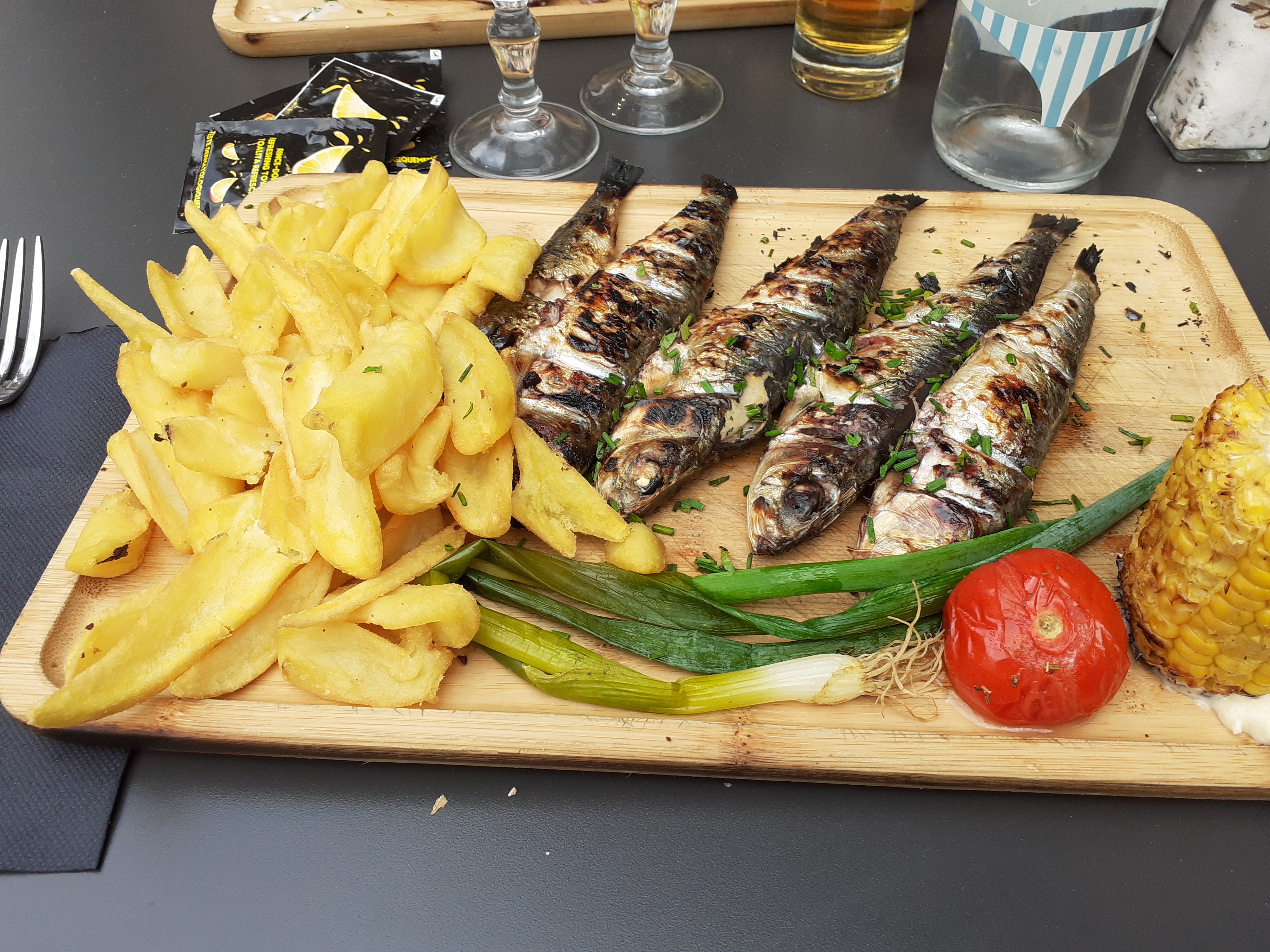 Attente assez longue la pizza bonne. Les sardines bien grillées mais pas ecaillees et les pommes de terre pas bonnes dommage. Le serveur très sympathique.