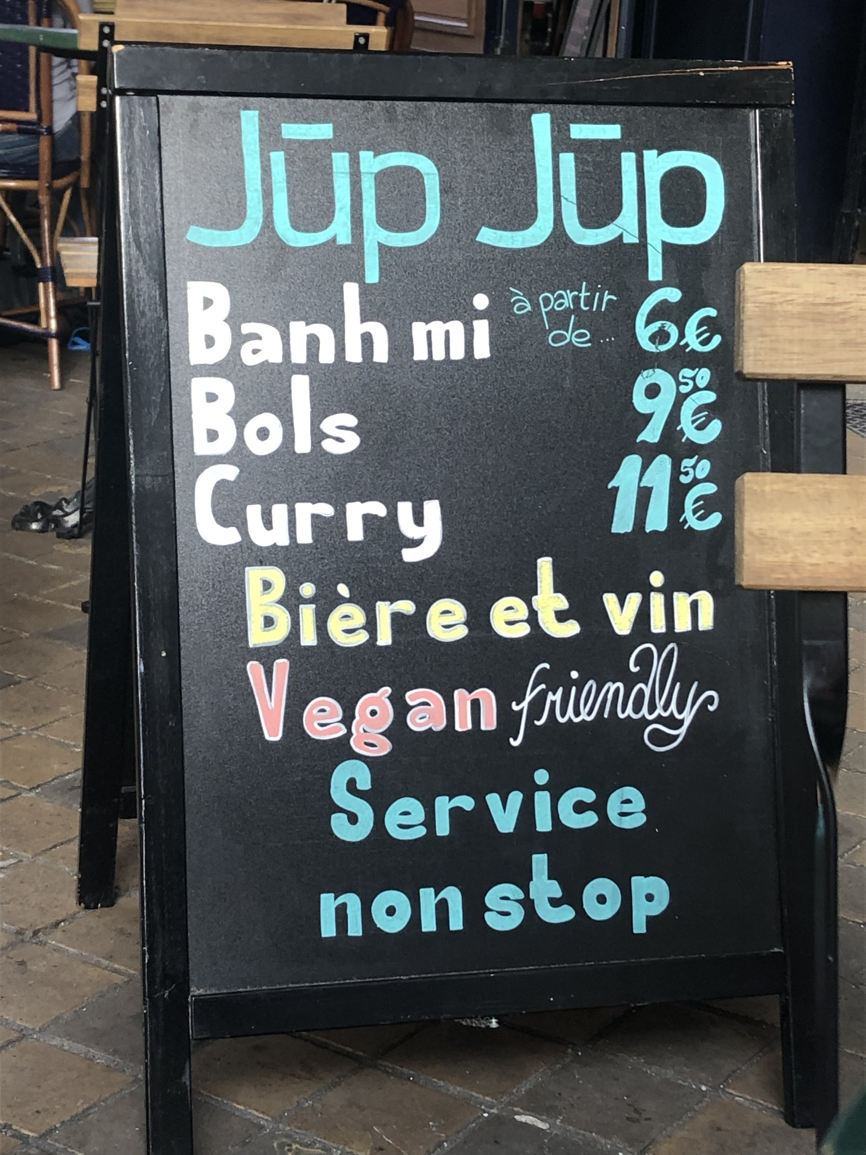 Venez vous régaler chez jup jup ! Cuisine pleine de saveurs , saine et bon marché ! Un accueil charmant et chaleureux de la bonne musique un petit grave agréable ! Tout est bon de l entrée au dessert Les saisons sont respectées , il y en a pour tout le monde Végan ou non On y vient on y revient . Hiver comme été ! La cantine à recommander !