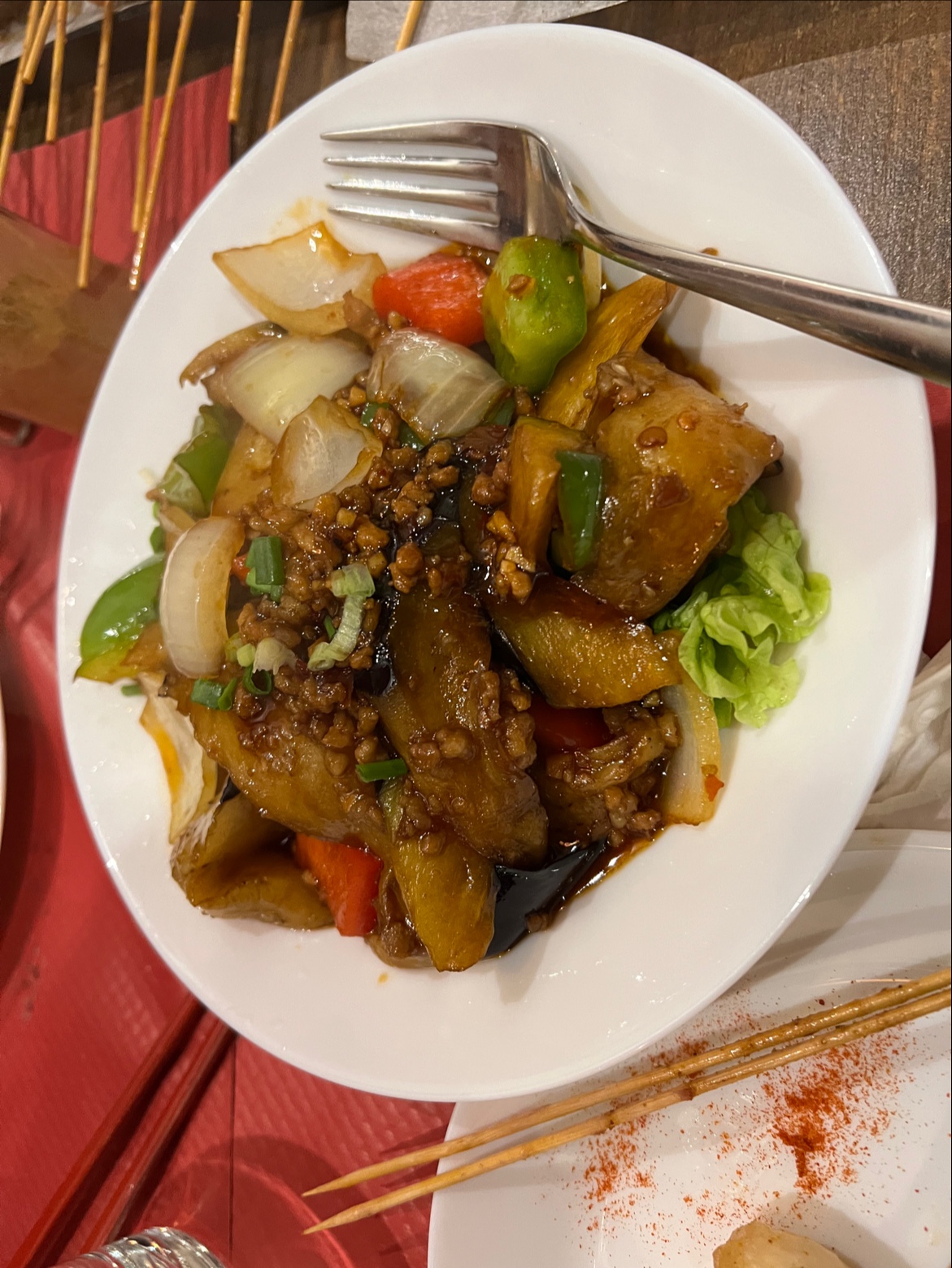 Très bon restaurant chinois ! Un grand choix de brochettes en entrée avec une fine couche de panure bien assaisonnée (exemple : riz glutineux, enoki, lotus,.. ) Le plat en photo est un mélange d'aubergines sautées au boeuf, excellent! Le dosage du piment (faible, normal, fort) permet de savoir à quoi s'attendre sur le piquant !