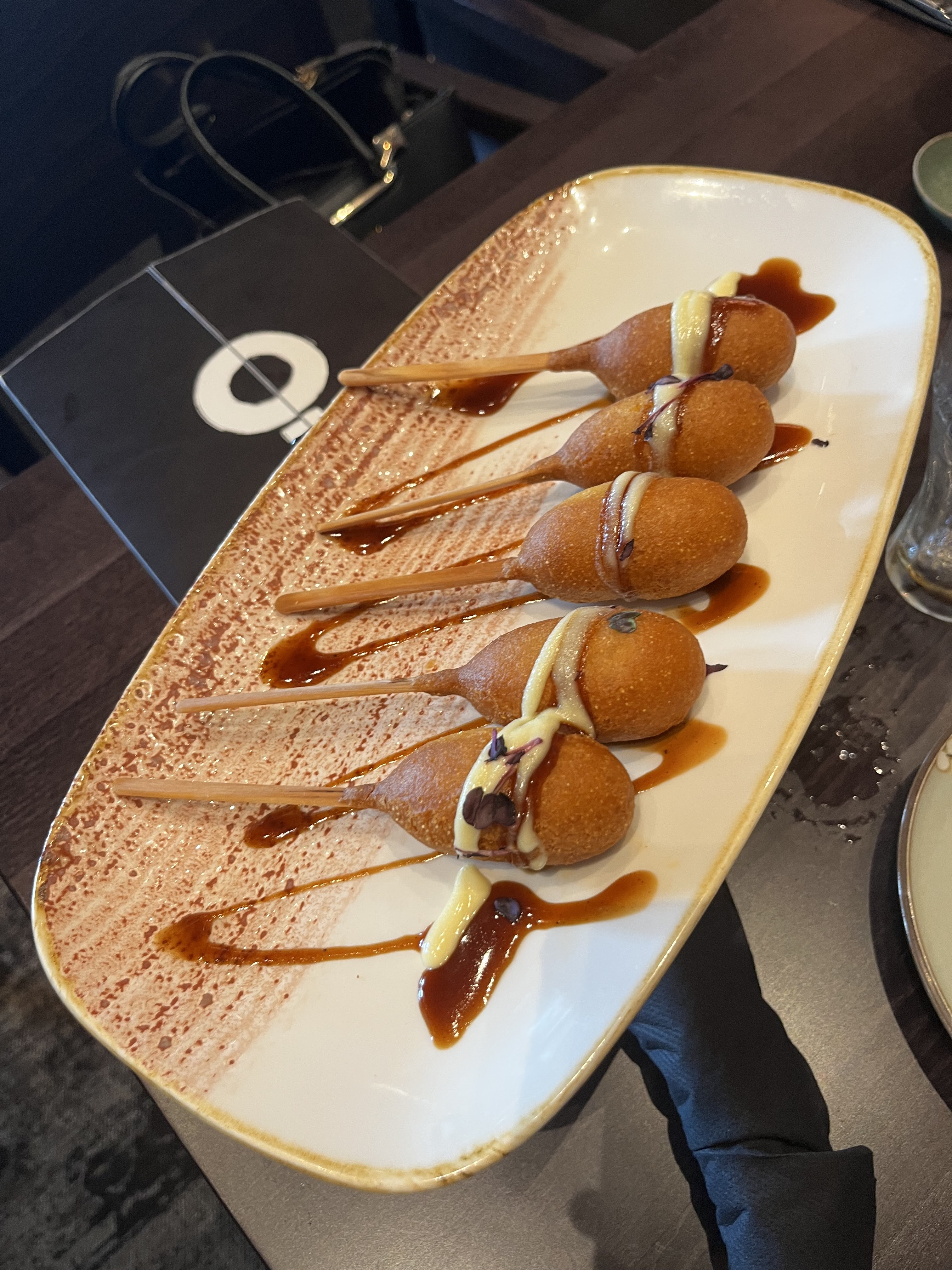 Les corn dog était très bon, le plat nous avons pris le poulet croustillant, excellent. Un peu déçu du dessert, donuts américain qui avait l'air industriel, la glace était bonne.