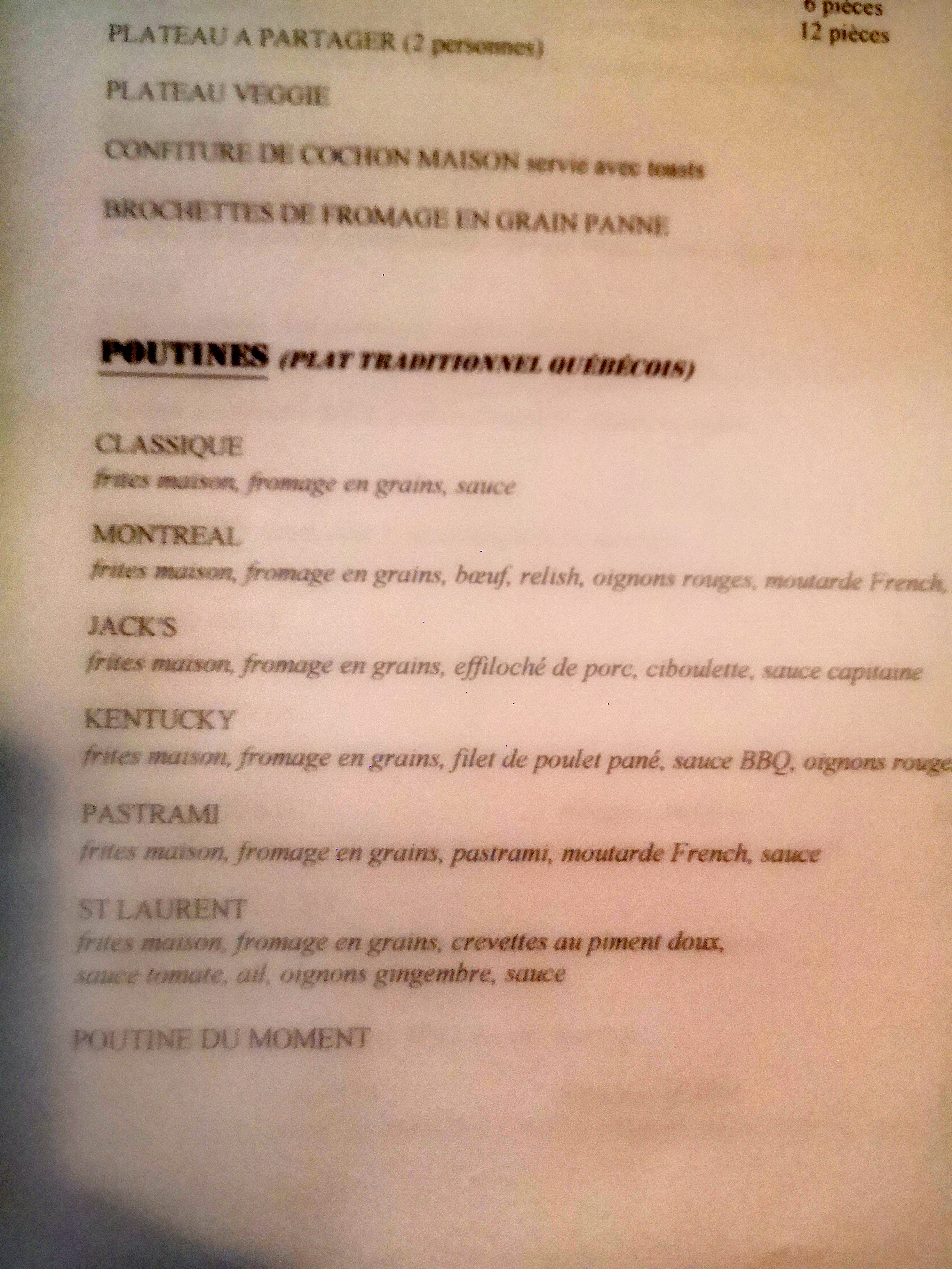 Endroit agréable, serveuse québécoise très sympa, au bar le monsieur est un peu fermé voir désagréable mais on a tous des jours moins bien que d'autres. Niveau bouffe nous avons mangé 2 poutines (la classique et la jack's) vraiment bonne. Très sympa de retrouver des vraies bières québécoises. Et pour le dessert ne passez pas à côté du pudding chomeur