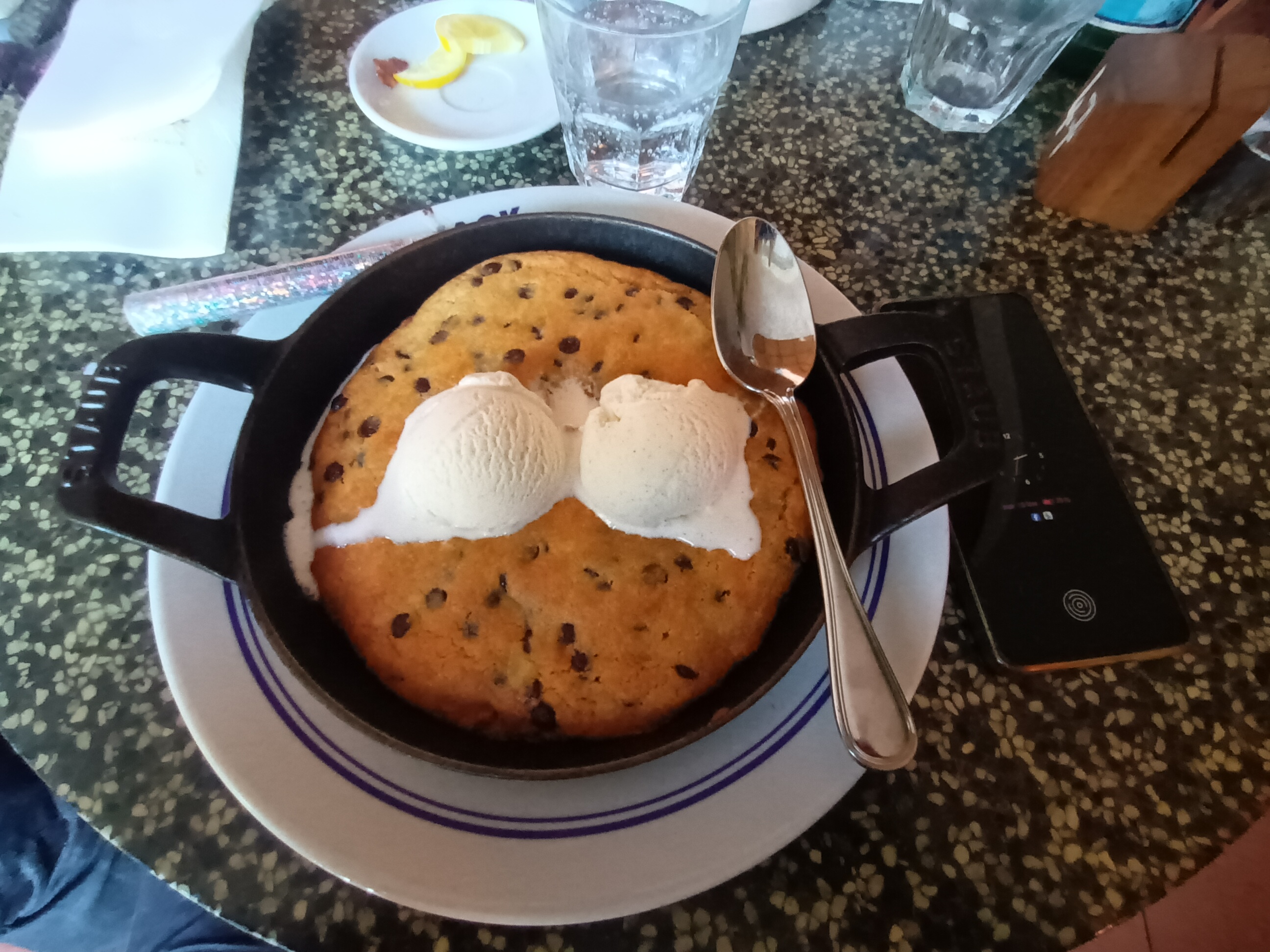 Nous avons pris des plats à partager et un cookie géant dans une très bonne ambiance et une super vue en terrasse. Les équipes étaient au top.