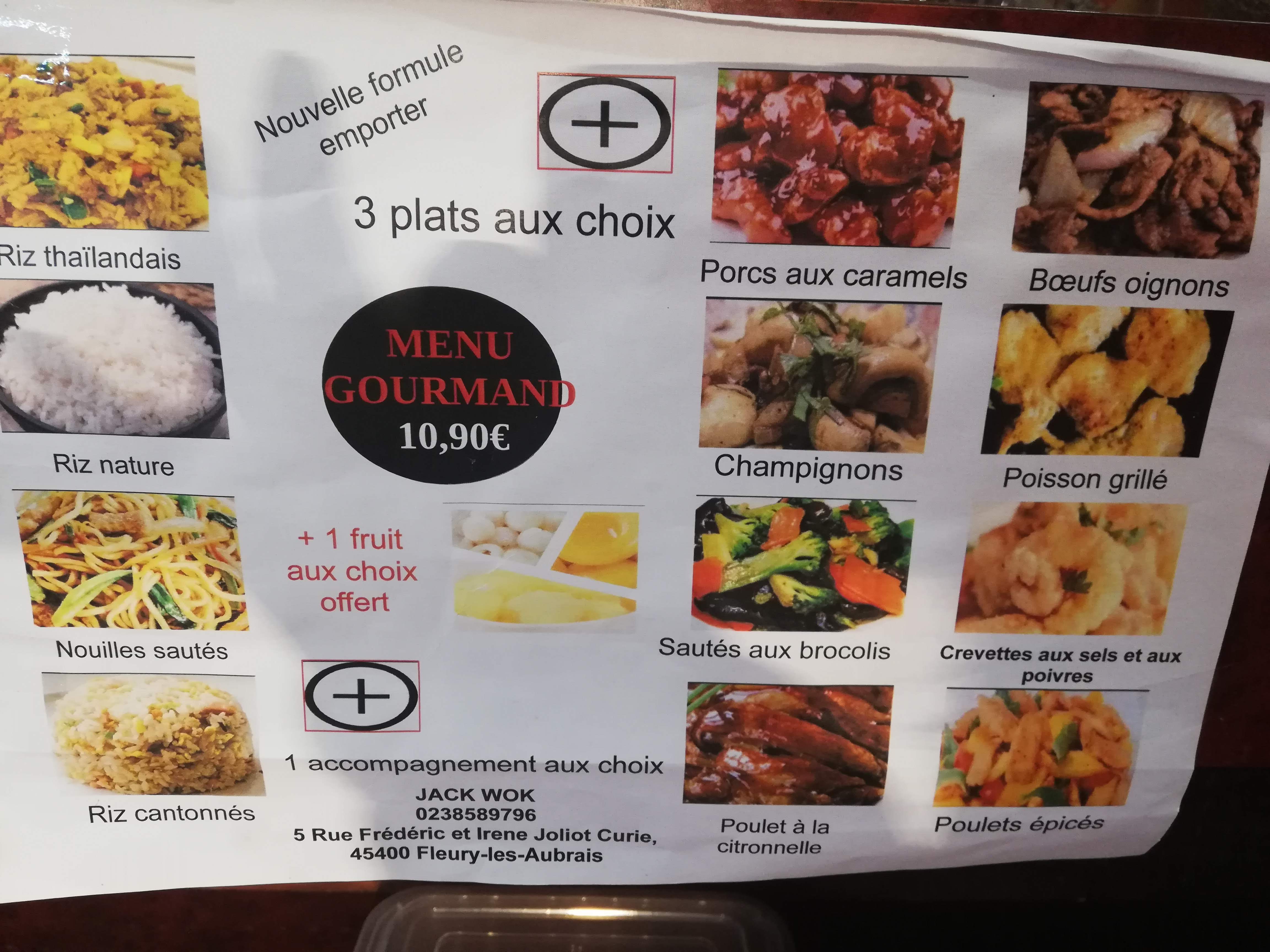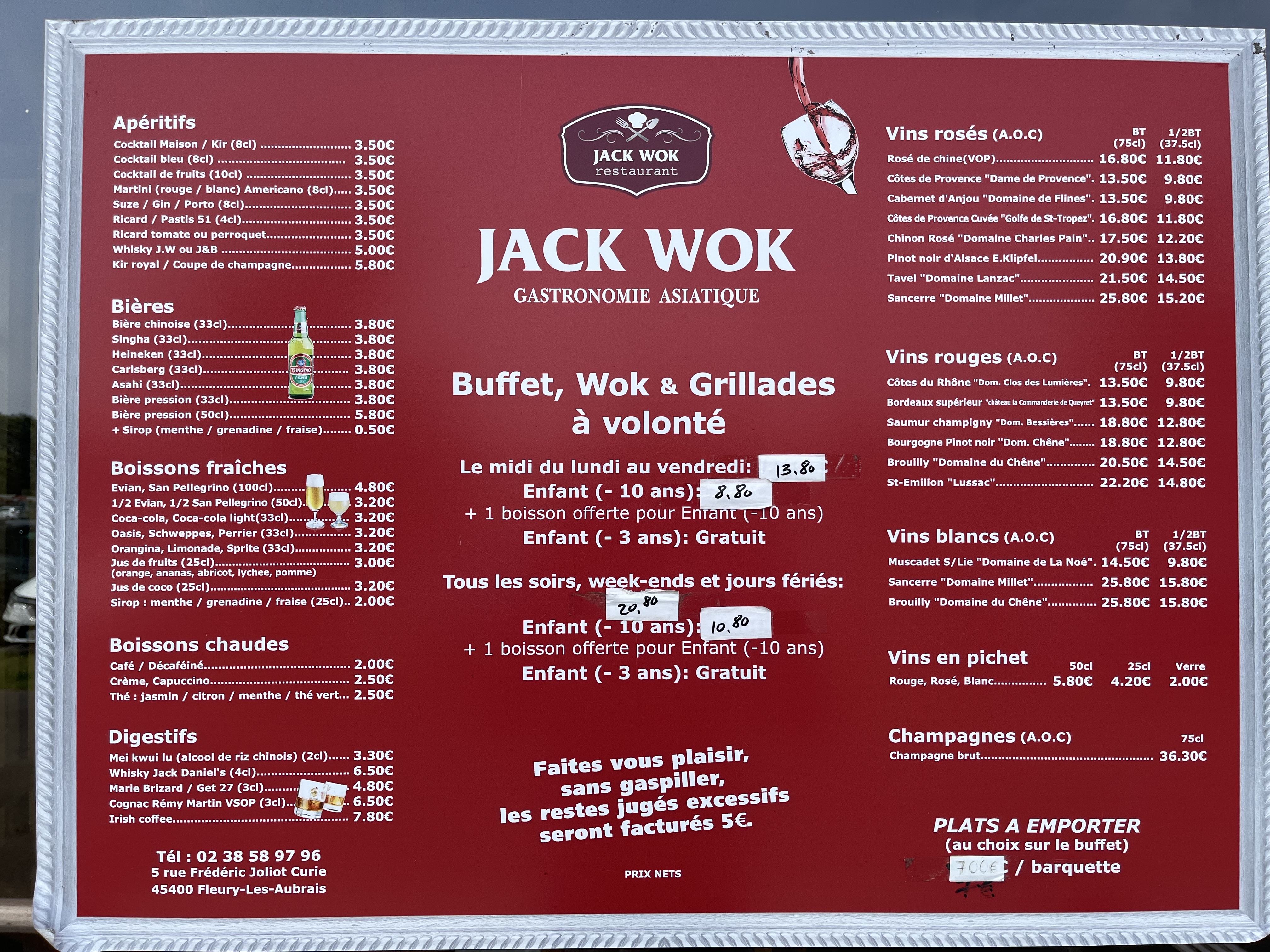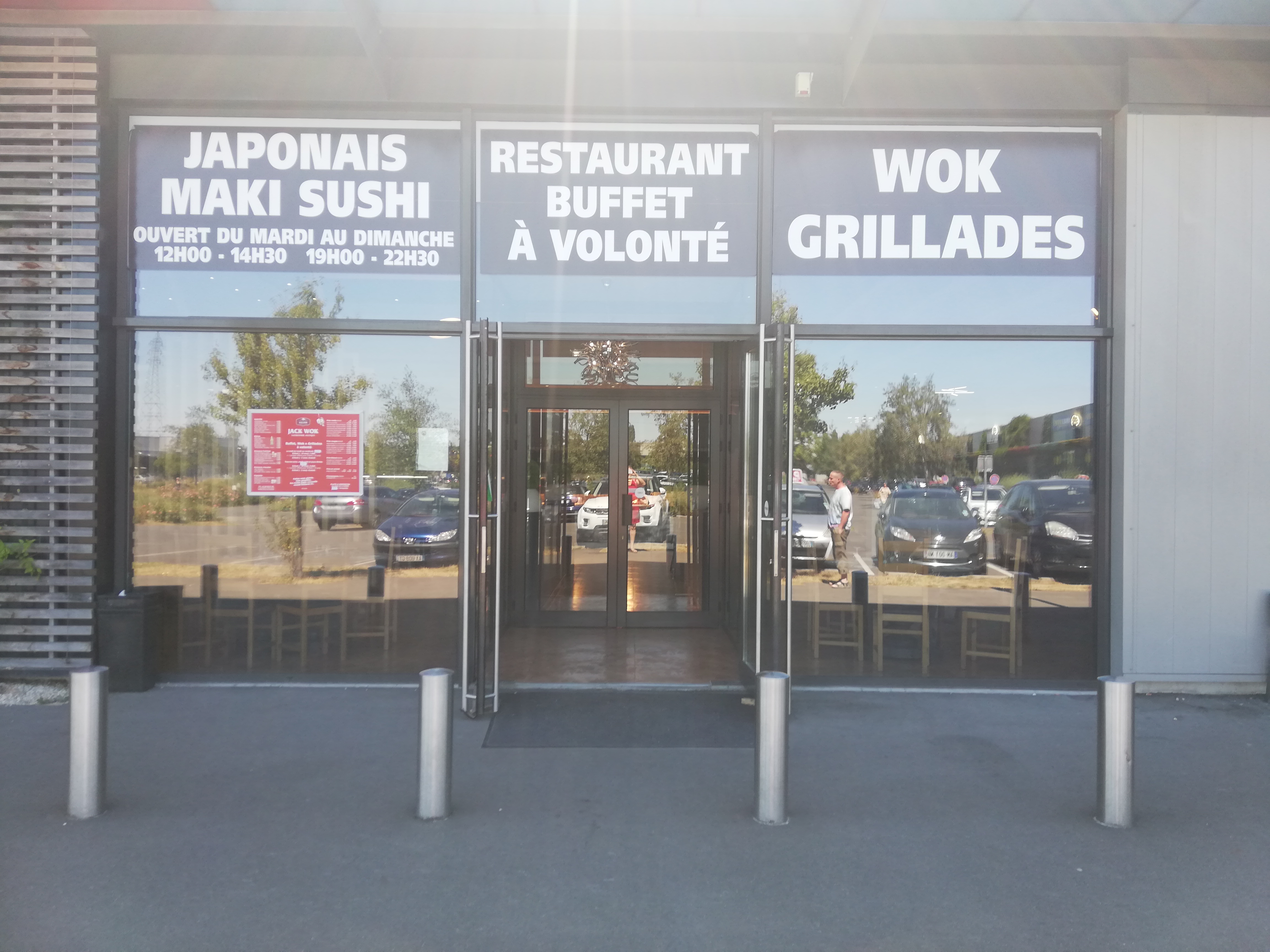 Première visite, le restaurant Jack Wok, après avoir consulté la page google, vu les commentaire et les photos, je suis allé diné samedi soir dans ce restaurant asiatique. Accueil : peu d'attente avant qu'un serveur nous demande le nombre de personne et nous pointe la table, puis 5 minute de solitude et une autre serveuse nous demande si nous voulons boire qu'elle que chose, mais pas d'explication sur le concept, bon il ne faut pas être idiot un grand buffet se tiens devant nous. Premier assiette, comme dans tous restaurant asiatique de buffet à volonté, des nems à penne tièdes, des salades, des rouleaux de printemps un peu sec et pas à la bonne température et les sushis bien confectionné mais pas assez froid ( attention au risque dû à la mauvaise conservation ) pour les plats chaux sans extase. les woks : viandes de porc, poisson, fruits de mers …. tous ébouillantés dans la même eau avant d'être poêlé dans un wok comme normal ! petit bémol sur les steaks hachés surgelé qui décongelé dans le buffet avant d'être grillé (pour info les steaks hachés surgelé doivent être cuits surgelé). Dessert : je savais que cela n'est pas le fort des restaurant asiatique mais delà a faire que du surgelé non indiqué sur la vitrine cela manque un peu d'originalité. Le service : que dire malgré le peu de client, il est inexistant à part le passage du serveur avec un chariot pour débarrasser les assiettes. Je pence que cette établissement manque un peu de vie, d'hygiène autant sur la propreté des lieu que sur la température des buffets et je parle pas des enfant des propriétaires qui se servent avec les doigt les bonbon des buffets avec leur table au dos de celui ci et de la serveuse qui mange une nectarine et remplissant les buffets. Les prix 11.80€ le midi en semaine et les soir et Week end 16.80€. Pour moi c'est un 3 sur 10😕 3 pour le cadre Et comme toujours ceci est mon retentis.