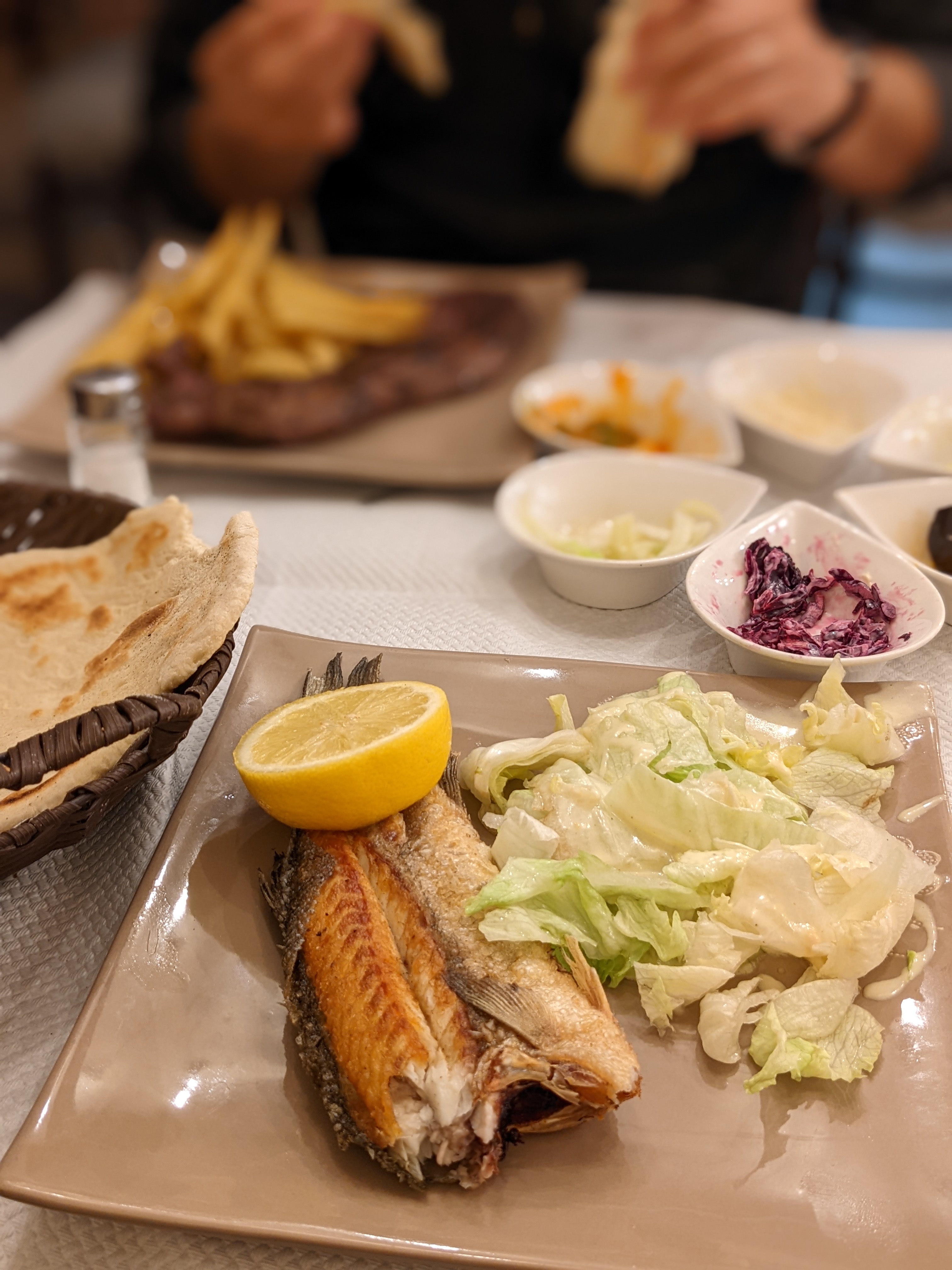 Endroit familial et accueillant, assez propre à l'intérieur. J'ai vu des salles de bains plus propres et je n'ai pas pu verrouiller la porte. Accompagnements - 3,5 étoiles L'aubergine était 4,5 étoiles, tout le reste était correct. Poisson loup (24 euros) - 4 étoiles Bien grillé avec une peau croustillante et pas sec à l'intérieur bien que ce ne soit pas un poisson gras. Je suis venu avec de la laitue. Boeuf (26 euros) - 3,75 étoiles La graisse n'est pas bien marbrée. J'ai dû couper autour des zones grasses. Assez cher cependant.