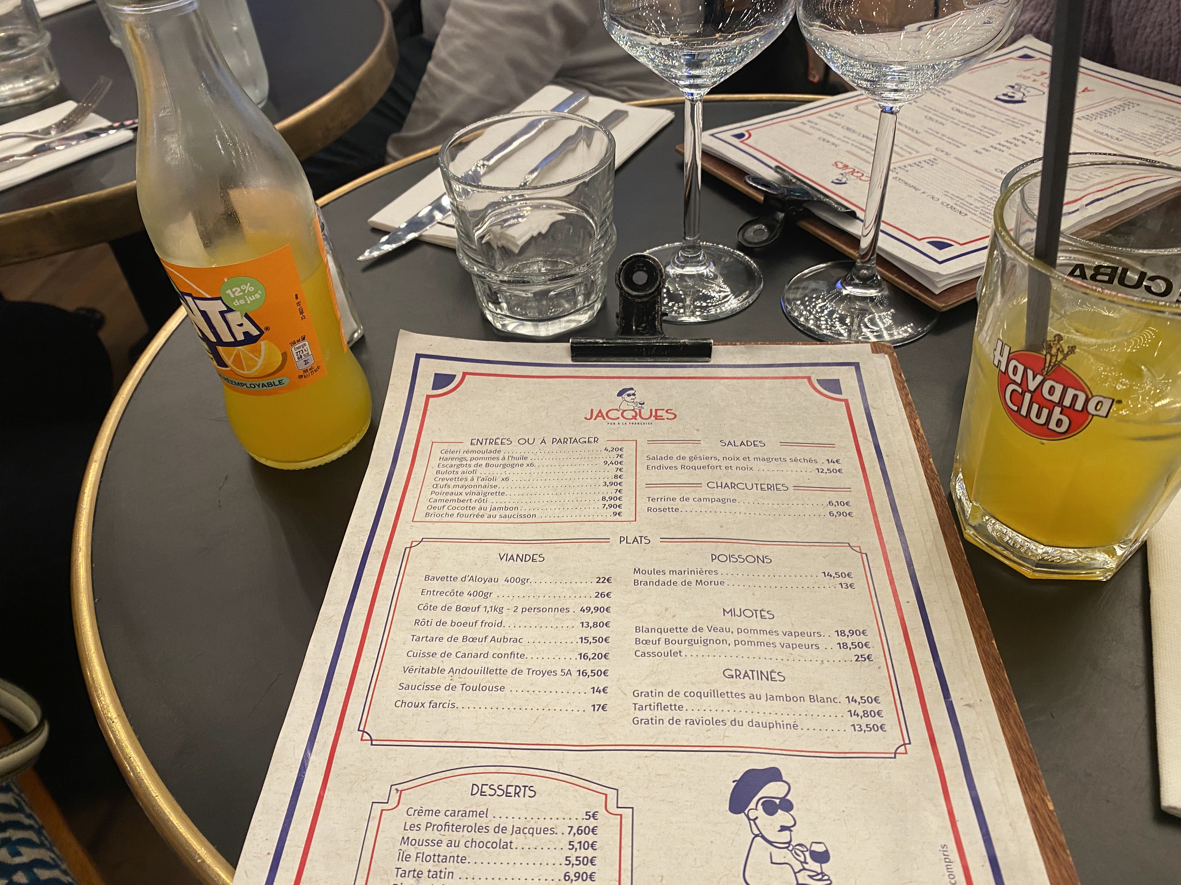 Première fois chez Jacques et je suis satisfaite. Plats français, la carte parfaite, les plats simple mais très bon, et les tarifs corrects. Niveau qualité/prix je recommande vivement. C'est vrai que c'est un peu bruyant , dù certainement au haut plafond de la chaumière. Mais comme indiqué, c'est un Pub a la Française, Donc qui dit Pub dit ambiance !