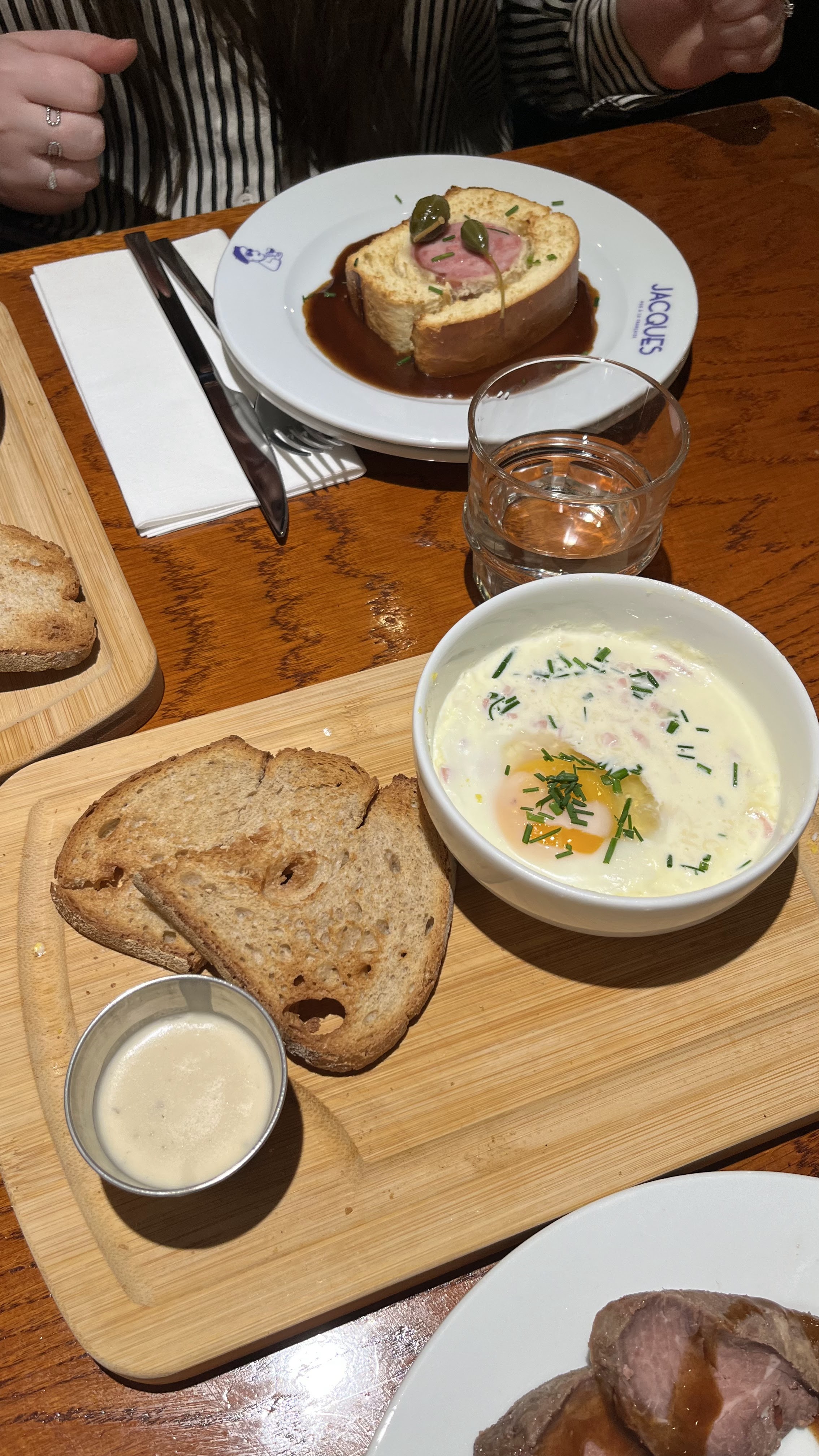 Pour la première depuis l'ouverture nous avons retenu une table chez Jacques. Excellent accueil. Lieu agréable. Cassandre c'est très bien occupé de nous. Elle a été très attentive à nos souhaits. Entrées pour moi et mon mari : oeufs mayonnaise qui au passage était excellente et pour moi chipirons persillés, très bien cuits et suivi d'une côte de bœuf pour deux, viande hyper tendre, gouteuse accompagnée de deux sauces roquefort et poivre tout ceci présenté dans des petits ramequins, avec salade verte et frites qui étaient bonnes. Nous nous sommes régalés. Bravo à toutes votre équipe nous reviendrons. Je vous conseille d'aller y manger.