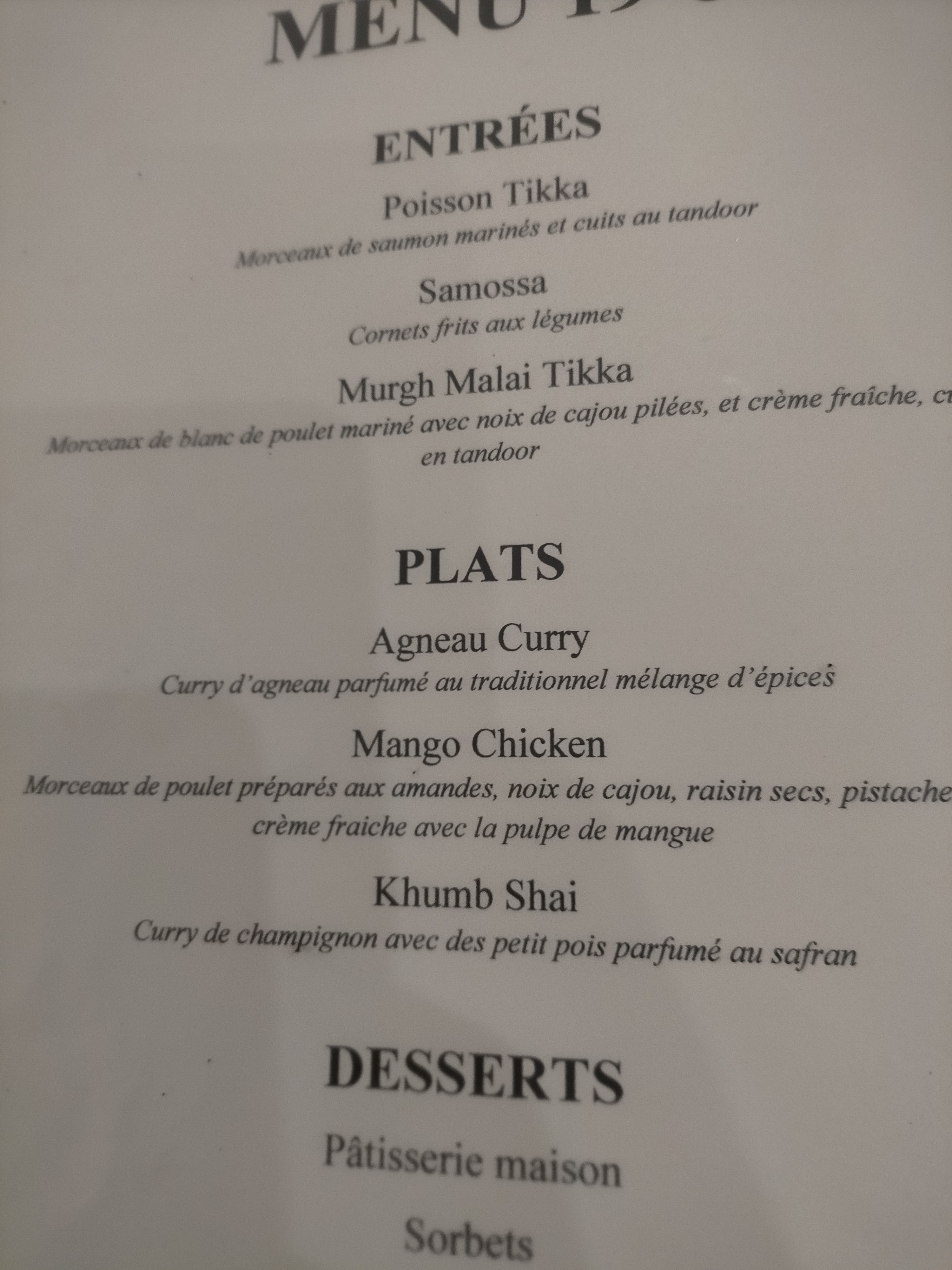 Bon restaurant indien, une carte avec des choix et un menu pour tous. Personnel aimable, et courtois