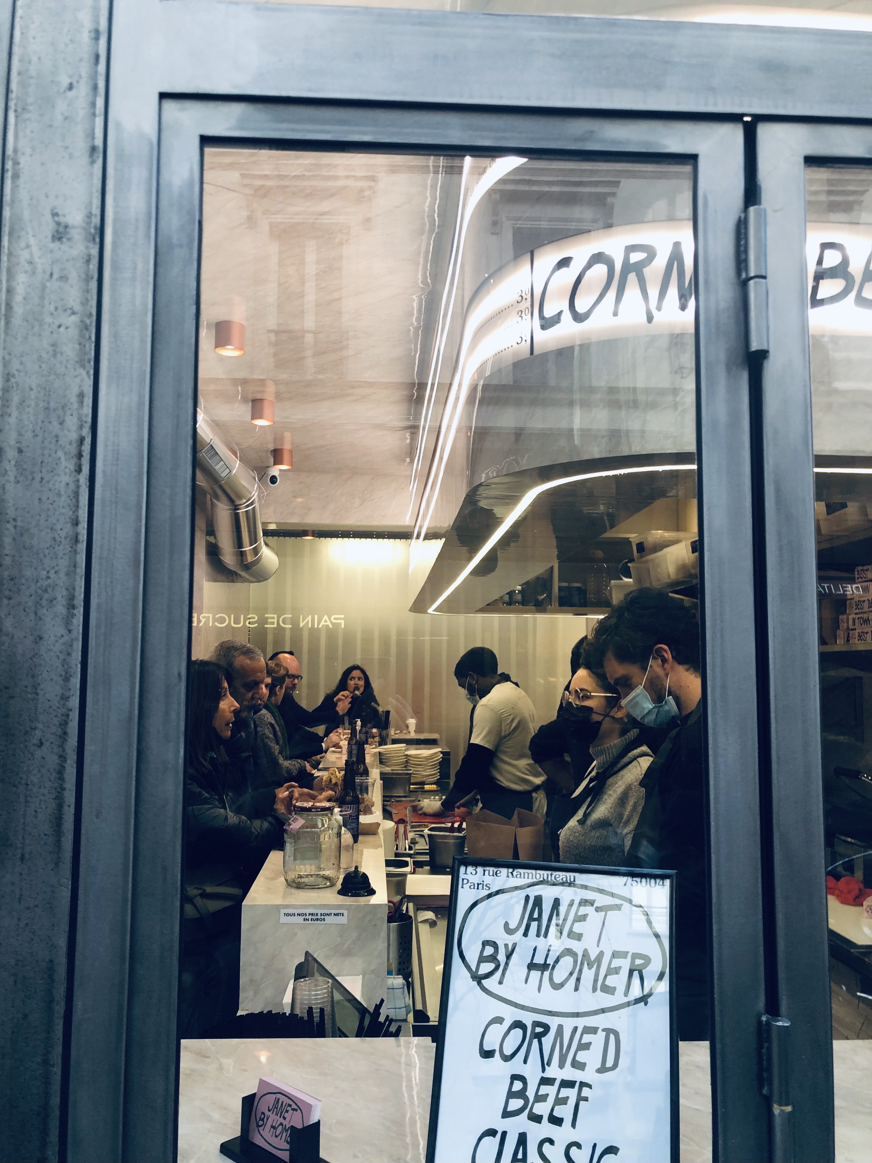 Samedi 23 mars, tête à tête avec ma fille, elle me donne rendez-vous chez JANET. Dans son message elle dit Je pense aller déj chez Janet rue Rambuteau parce que j'adore et c'est régressif... Allons-y pour le régressif ! J'arrive un peu en avance, c'est Noam qui assure l'accueil, vif, souriant, à son affaire pour expliquer l'inspiration Deli de son établissement et la carte riche en hot-dog, sandwichs au thon, au pastrami, à la dinde fumée sans oublier les egg sandwichs. La carte n'est pas sans rappeler le Deli Kats de New-York, en beaucoup plus petit et certes moins historique. Nous avons faim, nous commandons 2 hot-dog, un club sandwich, un egg & pastrami une IPA maison. Préparés avec soins par Alex qui exécute sa partition devant nous, les sandwichs arrivent à la minute, chaud, visuellement gourmand et richement garnis. A la présentation du menu, Noam précise que tout est fait maison et oui c'est bien le cas, pains, viandes, condiments, sauces sont très réussis. Le pain brioché, trempé dans le beurre fondu avant d'être toasté, est assez addictif, mais à consommer avec modération pour respecter ses artères ! Les hot-dog sont classique, bon pain, bonne saucisse craquante et bon assaisonnement. Il assurent et se mangent en un éclair ! Dans le sandwich egg & pastrami, l'omelette est soufflée, le pastrami fondant, bien assaisonné, la sauce cocktail équilibrée et ne venant pas masquer les autres composants. Idem pour le club sandwich classique, celui de Moise Sfez, le fondateur de Homer et de Janet, le pain, la dinde fumée, la mayo, s'équilibrent parfaitement. Pour conclure, Janet est un delicatessen comme à New York pour l'inspiration culinaire mais en plein centre de Paris. C'est bon avec un excellent rapport qualité/prix pour la qualité des produits, la générosité des garnitures et la bonne humeur du service. Une très bonne adresse de street food à Paris ! Paris qui n'est pas la mieux équipée des capitales du monde en cuisine de rue au regard de la prolifération des mauvais kebab, asiat, sandwicherie de chaine et autres médiocres terminaux de cuissons et vendeurs de pizza faisant honte à l'Italie et la gastronomie en générale. PS/ Ils ouvrent bientôt un coffee shop juste en face !
