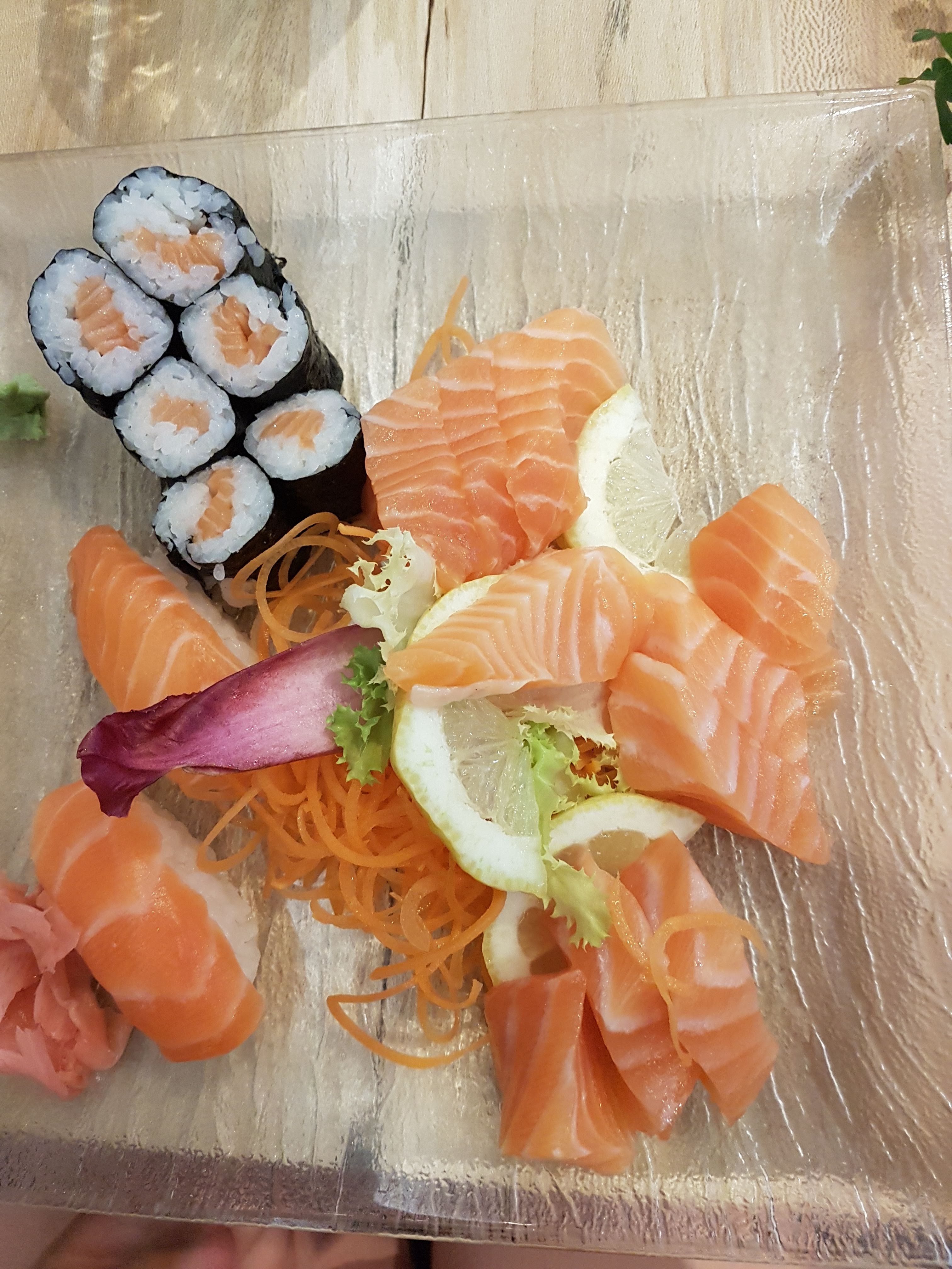 VRAIMENT DECUE PAR CE RESTO. VOUS TROUVEREZ MIEUX ET MOINS CHER AILLEURS. Les sushis et sashimis étaient tièdes. Les california sont énormes (le double d'un vrai california avec plein de riz). Je suis venue car j'ai été attirée par les différentes variétés de poissons proposées mais lorsque je commande mon plat, je remarque que ce n'est pas exactement ce qu'il y avait sur la photo du menu. Il manquait des variétés de poissons et on m'a mis principalement que du saumon et du thon. (Plat qui était à la base à 24-25€ avec poulpe, maquereau daurade saumon thon) Je leur demande donc et ils me répondent qu'ils n'avaient pas ces poissons donc ils l'ont remplacé par du saumon. Euh OK ? Qui a dit que je voulais du saumon en plus ? Personne ne m'a prévenu et le gérant n'a pas même pas fait un geste commercial. Je ne reviendrai pas c'est sûr. Vraiment trop cher pour ce que c'est.
