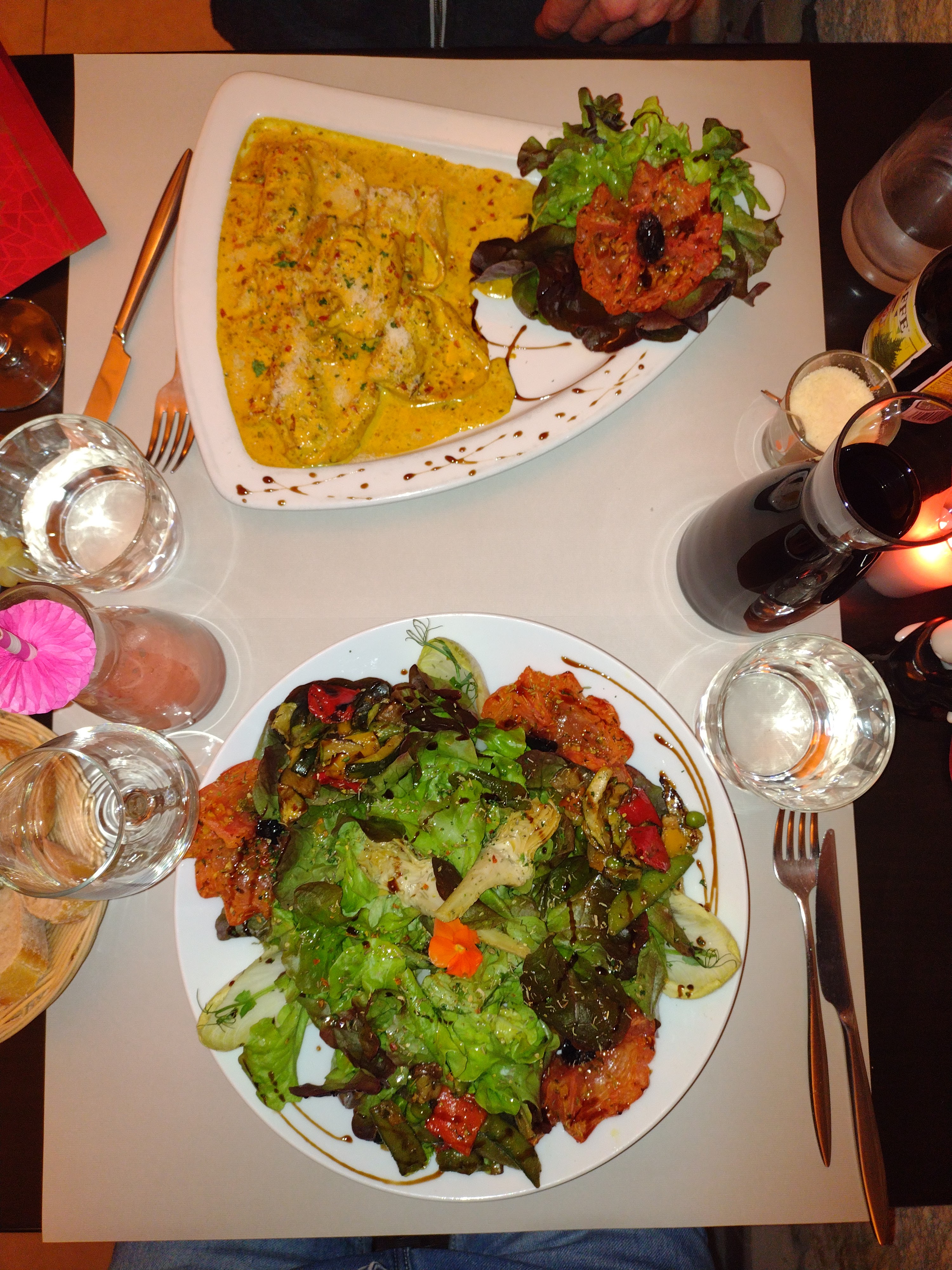 La salade essentiellement verte en grandes feuilles cachent 5 petits pois 3 morceaux d aubergines, quelques morceaux de poivrons et 3 haricots. Très décevant par rapport au prix. Service sympathique.