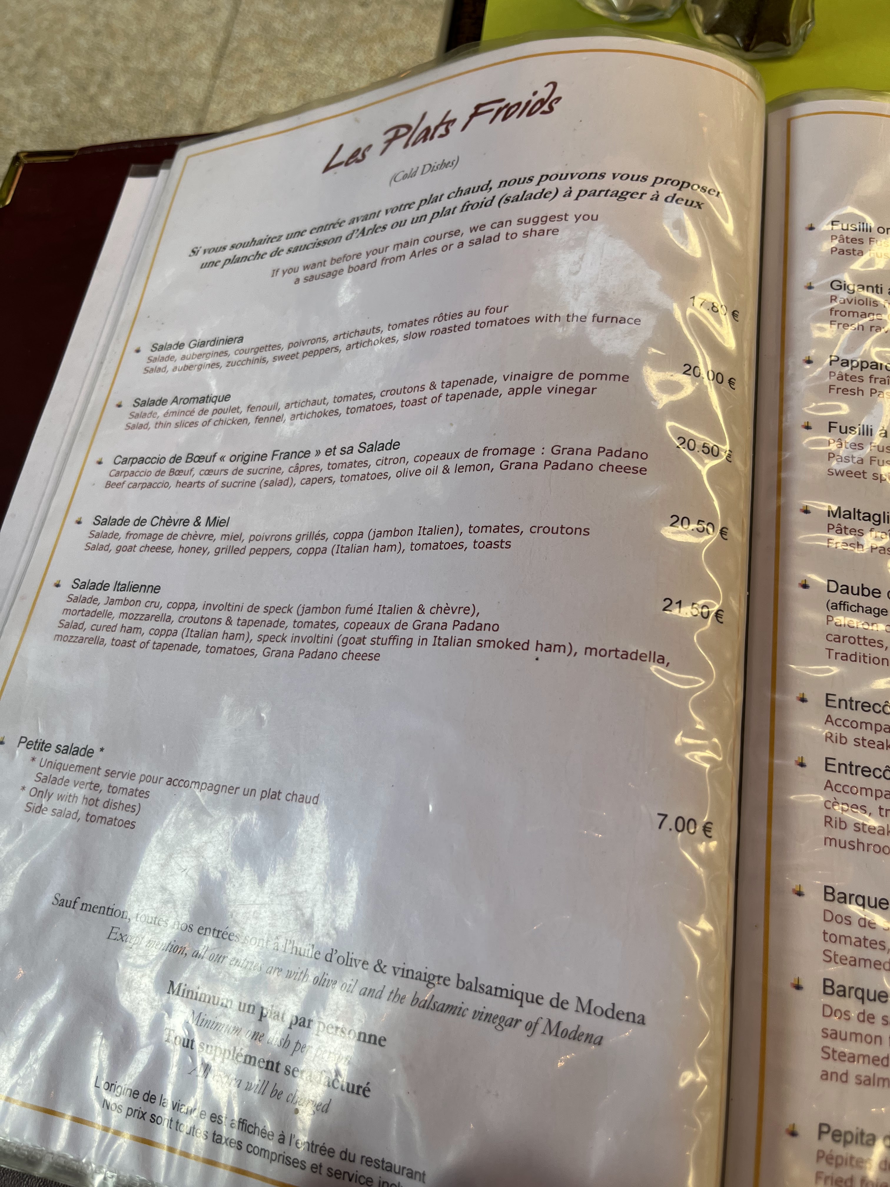 Je connais ce restaurant depuis de nombreuses années vous pouvez y aller et manger de bons plats de pâtes. Au fur et à mesure des années nous avons pu voir que les assiettes étaient moins fournies(mais pas moins bonnes il faut tout de même le reconnaître)cependant je regrette cette flambée des prix presque 10 euros par plat(nous parlons de pâtes...)et même si ce restaurant est sympa j'ai du me lever de table avant de prendre commande car le menu enfant(tout de même à 14 euros pour de simple pâtes....) n'est pas admis pour les enfant de plus de 8 ans!!donc étant venu avec mes 3 filles de 4,11 et 12 ans la politique du restaurant imposant à mes deux plus grandes de choisir entre un plat de pâte ( entre 20 et plus de 30 euros pour certain )ou une salade a plus de 20 euros!!!c'est exagéré au niveau des prix c'est pourquoi je n'y reviendrais malheureusement plus et même sans les enfants car même si les prix et les charges ont augmenter vous avez sur Arles des restaurants généreux avec des produits locaux et rafinés pour moins cher et ou vous n'avez pas l'impression de vous faire avoir....