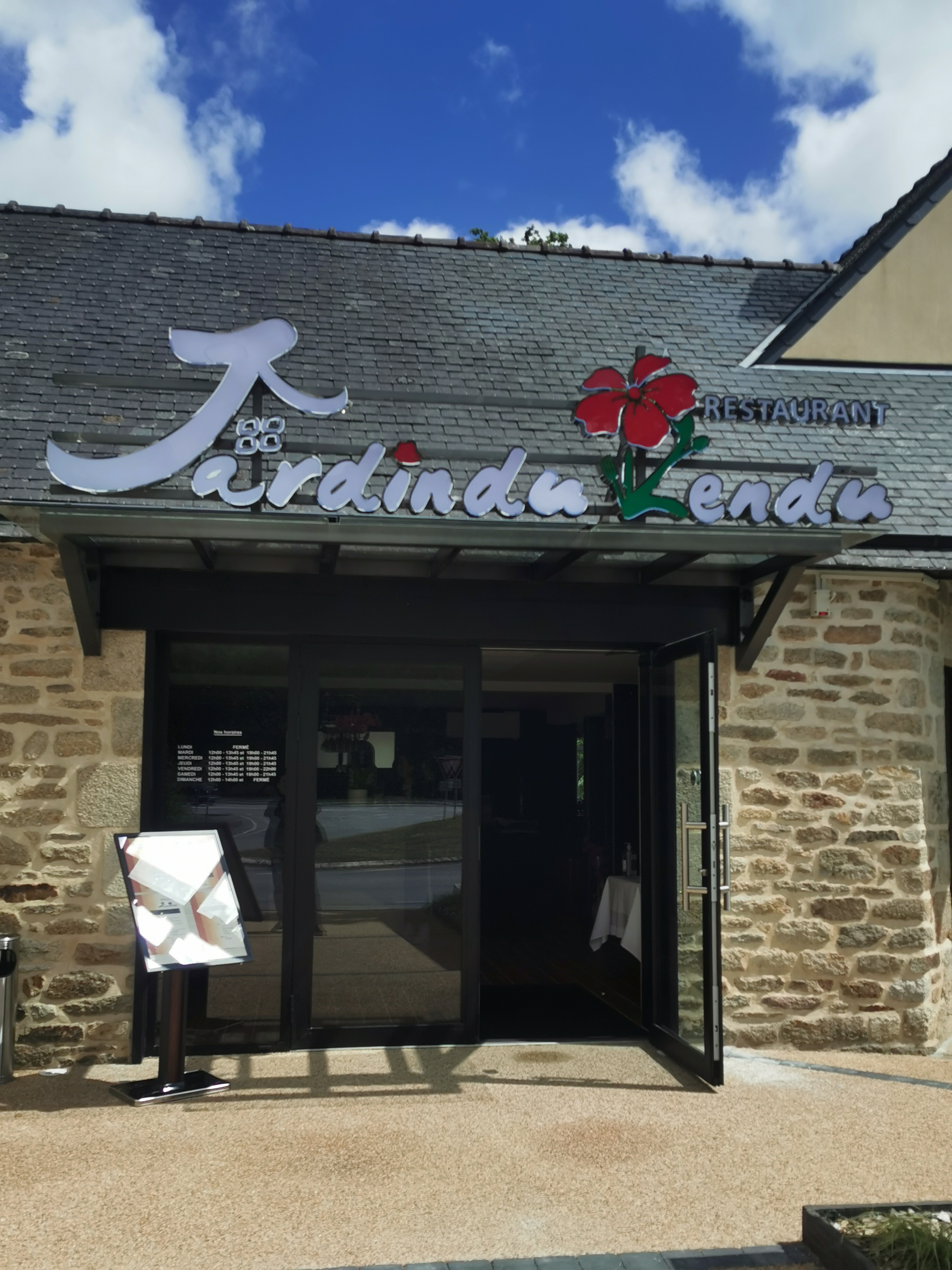 Définition du restaurant Jardin du Lendu: . L'entrée: pain raci, salade comblant les trous . Le plat: frite molles et cuisse de poulet digne de chez KFC, extérieur brûler et intérieur pas cuit. . Le dessert: brownie congéler et glace basique. Bref, ce repas était guigougua (terme breton signifiant ma déception), le personnel n'est pas aimable et humour insipide. Ma seule étoile revient au cadre.