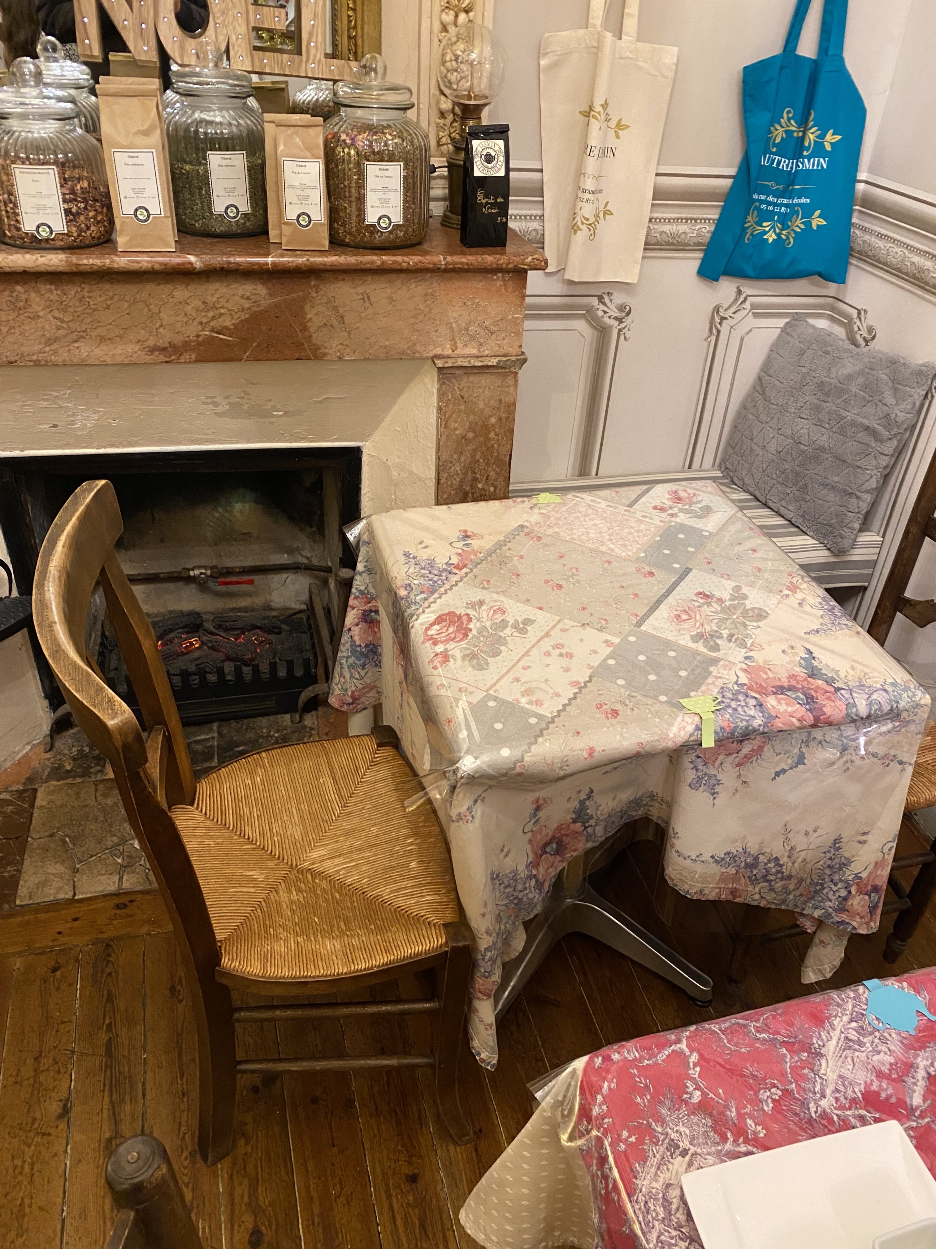 Nous avons pris un goûter en couple vers 17h. C’est sans doute le meilleur endroit de Poitiers pour cela. On entre dans un nouveau monde si paisible ! C’est vraiment une pause avec la vie extérieure. L’odeur des thés est très agréable. Tout ce qu’on a pris était excellent. Aucune déception. - Chocolat chaud 75% avec des scones (confiture de mangues, beurre demi-sel et crème Juliette, cette dernière absolument délicieuse !). - Thé Esprit de Noël avec crumble aux pommes avec crème fraîche. Nous avons eu des petits bonbons au chocolat en partant :)