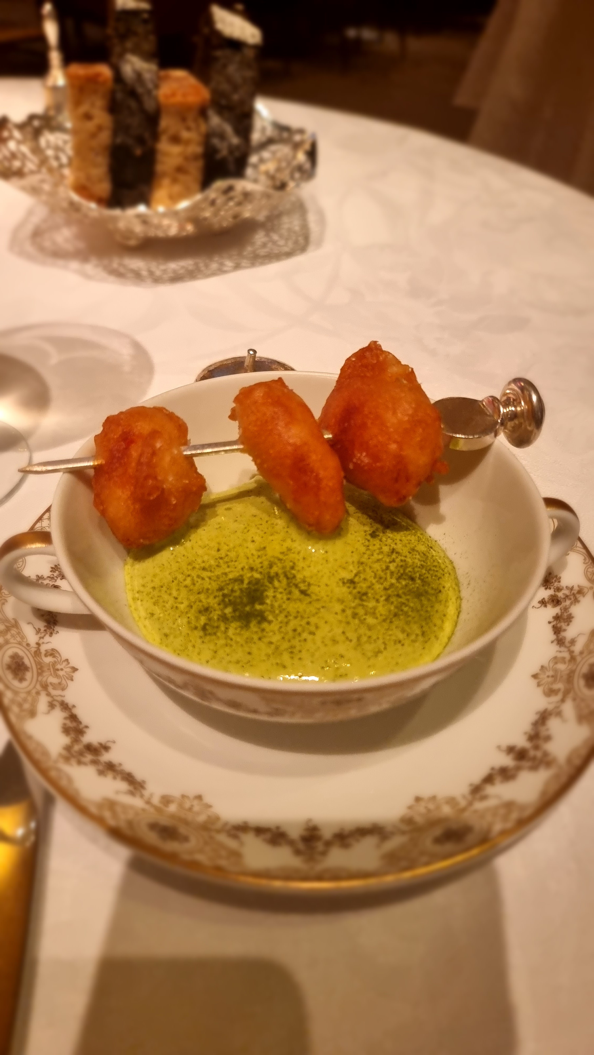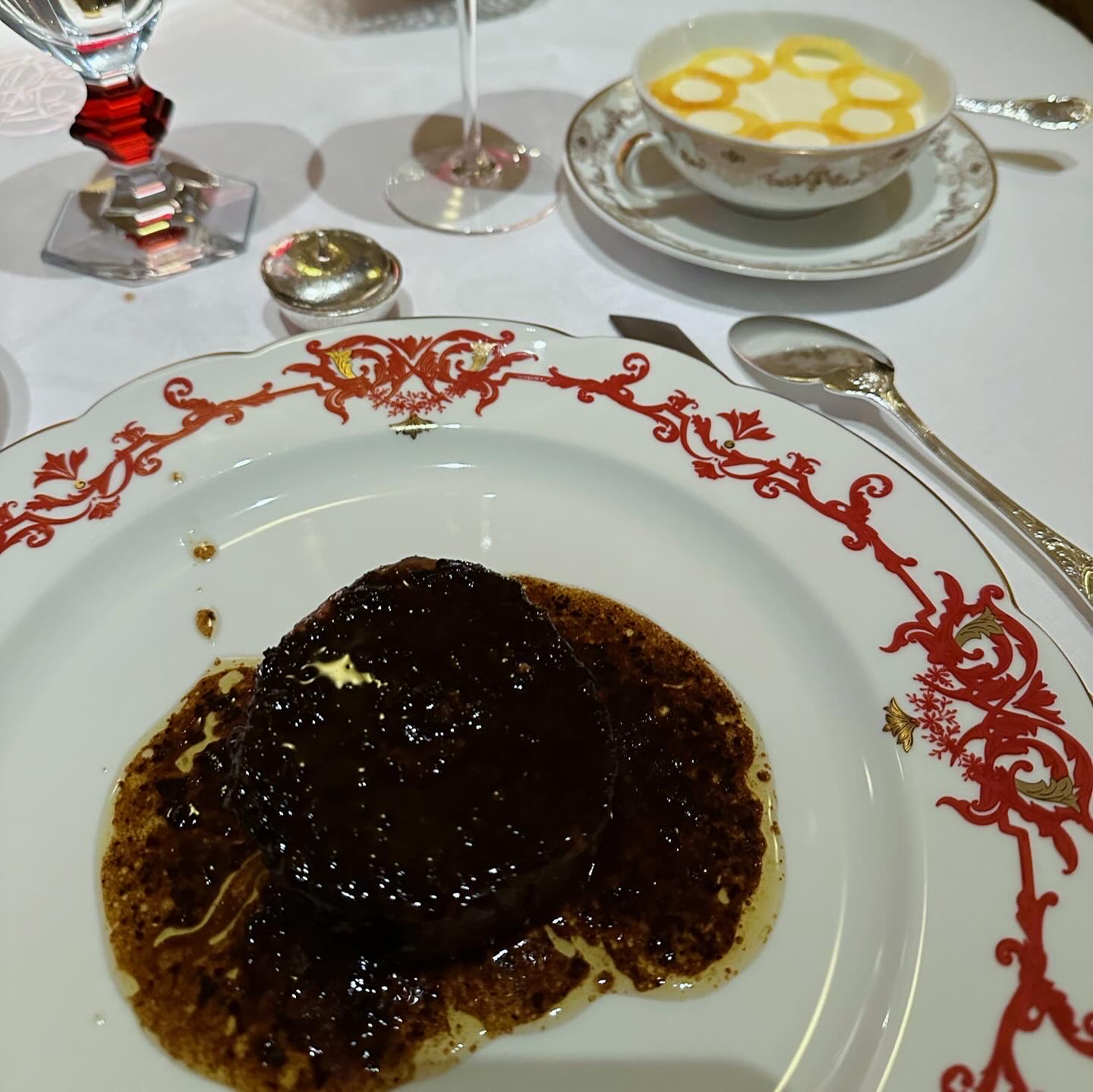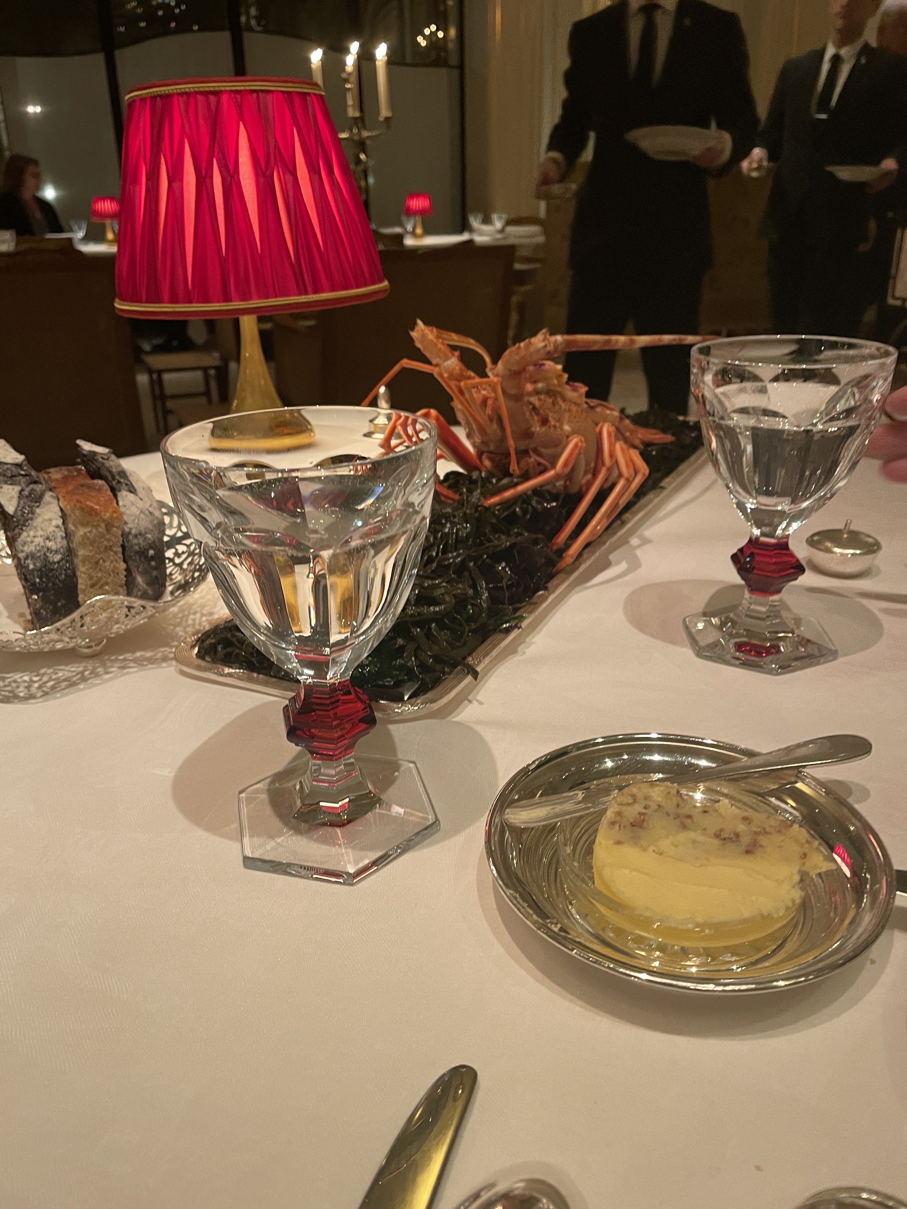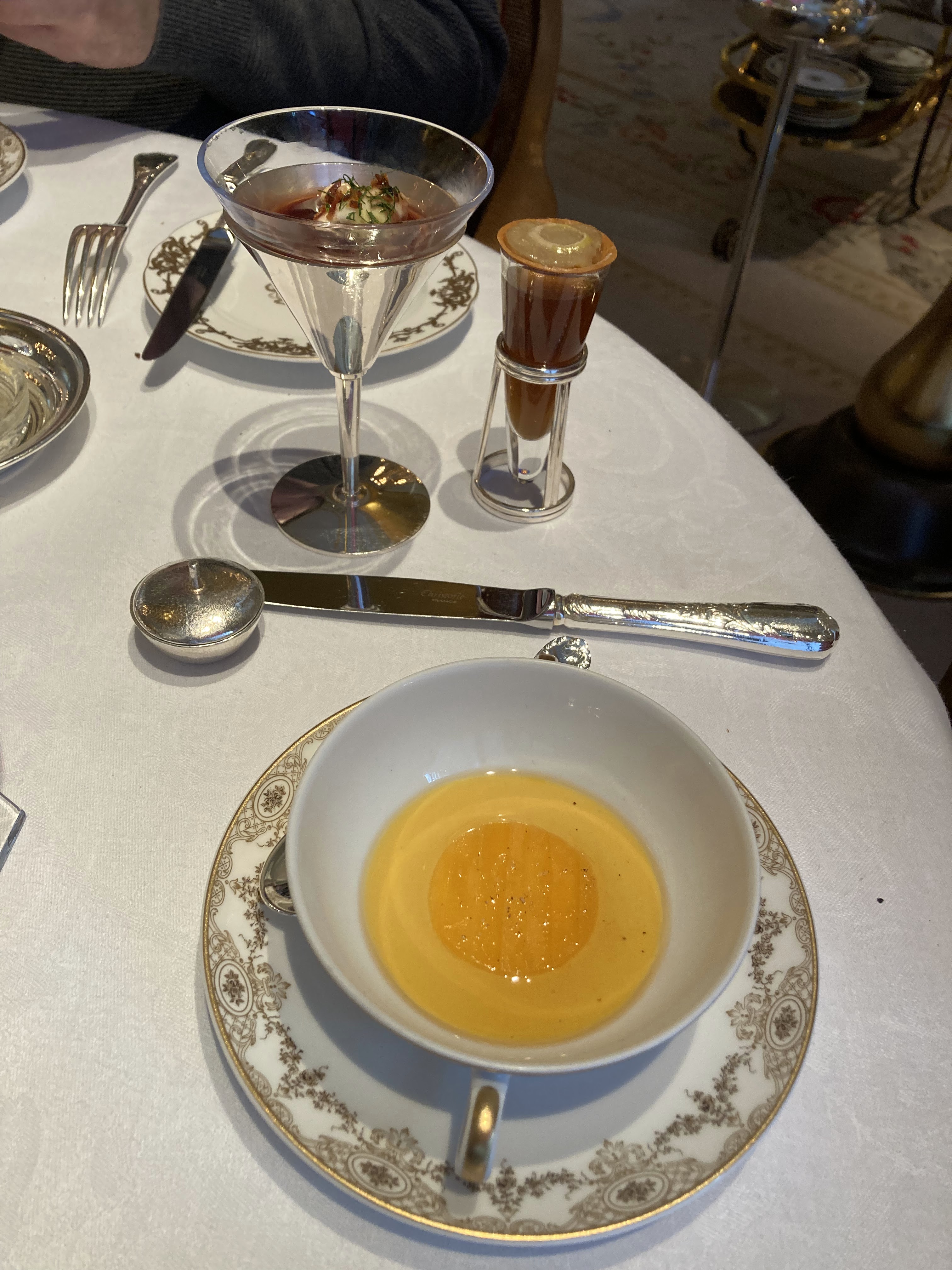 Nous avons fêté mon anniversaire. Nous avons pris le menu de Jean. Concernant le turbot, moi et mon frère avons eu 6/7 arrêtes chacun dans nos assiettes ce qui nous a beaucoup gêné pour la dégustation du plat. Lors du dessert un des serveurs allait enlever le bol pour la glace de mon père sachant qu’il ne s’était pas encore servi mais au dernier moment un autre serveur lui a dit de ne pas le faire. Concernant de façon plus globale l’arrivée des plats nous avions des fois des difficultés à comprendre la description donnée par les serveurs. Lors du repas le personnel s’est également adressé à nous à 2 reprises en anglais. Il n’y a pas de réel souci mais dans un endroit de ce standing nous aurions aimé une meilleure prise en compte des clients et donc de notre nationalité. À part le principal problème des arrêtes, ce sont des petits détails mais non négligeables pour un restaurant 1*. L’addition était tout de même excessive quant à l’ensemble des plats proposés (bons mais en deçà d’autres restaurants 1*) malgré le fait que nous soyons dans un palace. Nous avons malgré tout passé un bon moment et la décoration a été faite avec goût. Bonne découverte tout de même mais des points à améliorer.