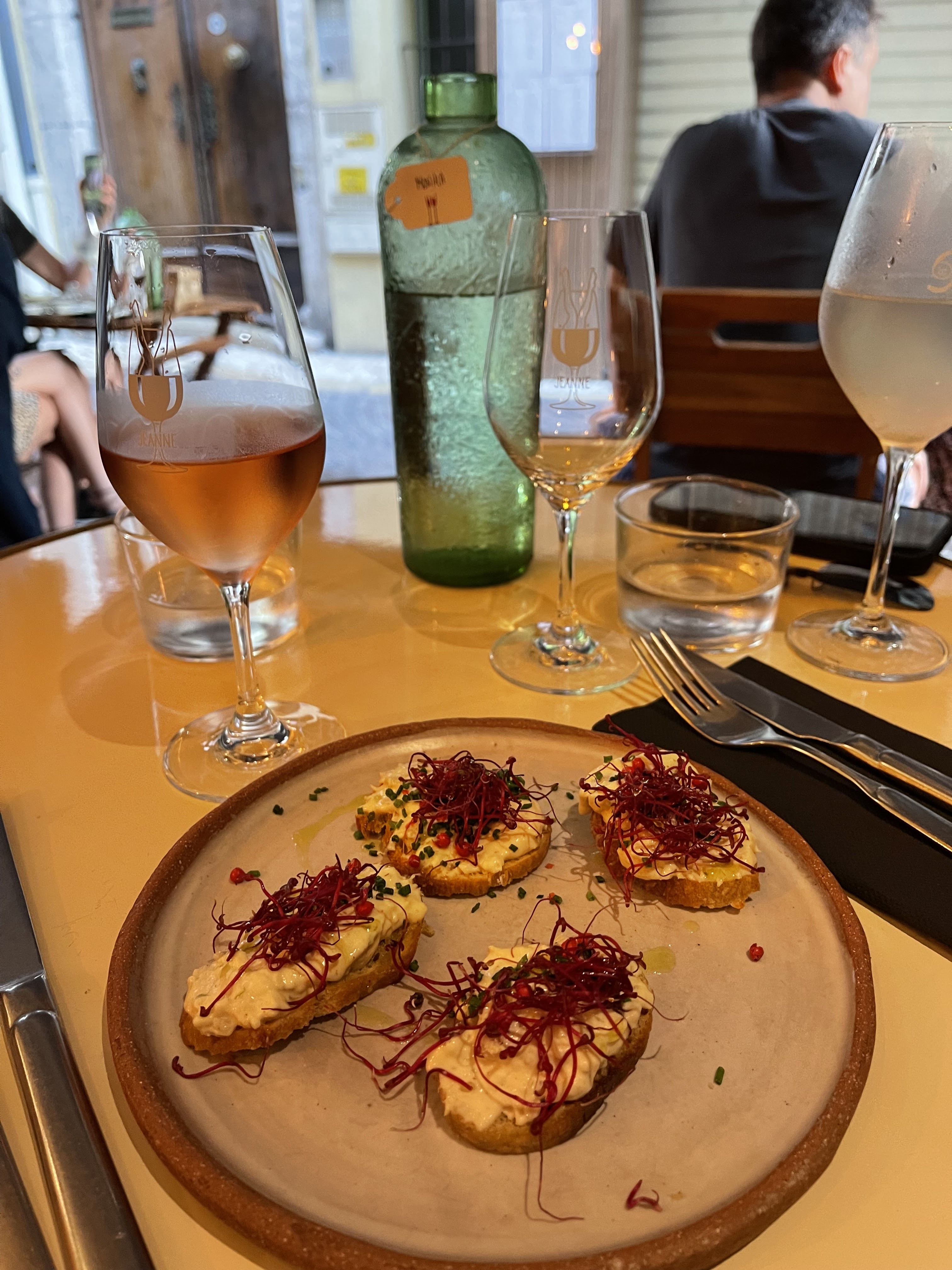 J'ai été époustouflé par cette belle trouvaille inattendue en plein Antibes. Je voulais manger un morceau à la fin d'une journée bien remplie et je me suis arrêté à Antibes pour découvrir certains des restaurants les plus savoureux que j'avais envisagés lorsque je suis passé devant ce bar à vin confortable et chic dans une petite rue de la vieille ville. Ce que j'ai trouvé, c'est un service phénoménal, une excellente connaissance du vin par Marine (l'une des deux sœurs qui dirigent les lieux) et une sélection de délicieuses petites assiettes de salades, terrines et bien plus encore. Je crois que tous les vins qu'ils vendent sont « naturels » (un ou deux au-dessus de « bio/biologique », je crois) ou ce qui a été dit était le vin le plus pur que l'on puisse obtenir. De plus, ce que j'ai fini par payer était une bonne affaire. Je pourrais finir par y aller presque tous les jours !