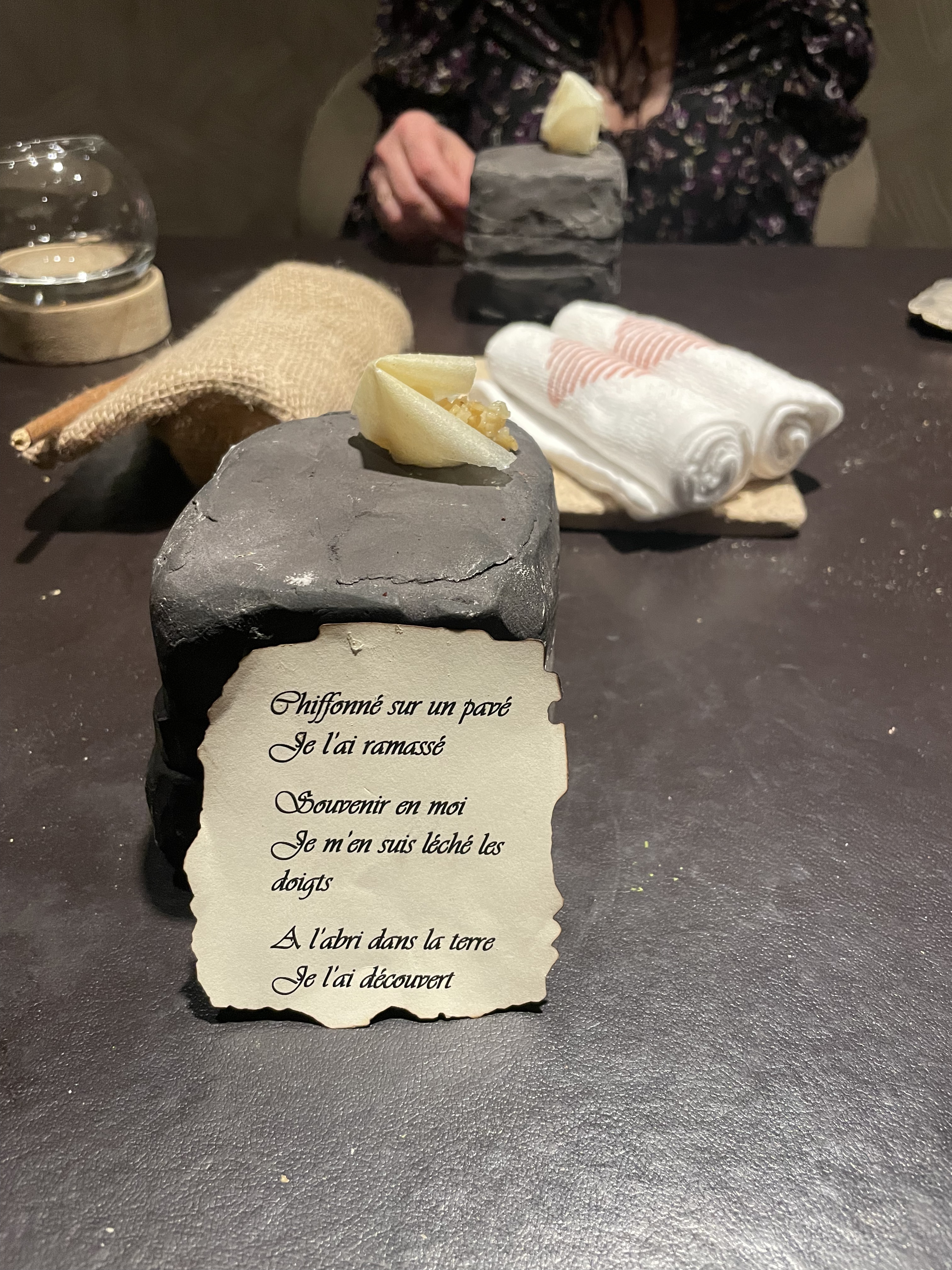 Bien plus qu’un simple diner, nous avons ou vivre une vraie expérience culinaire, deviner les ingrédients et produits utilisés lors de chaque plat, dégustation en musique, appel aux différents sens Les plats se sont enchainés rapidement et nous n’avons pas vu le temps passer !