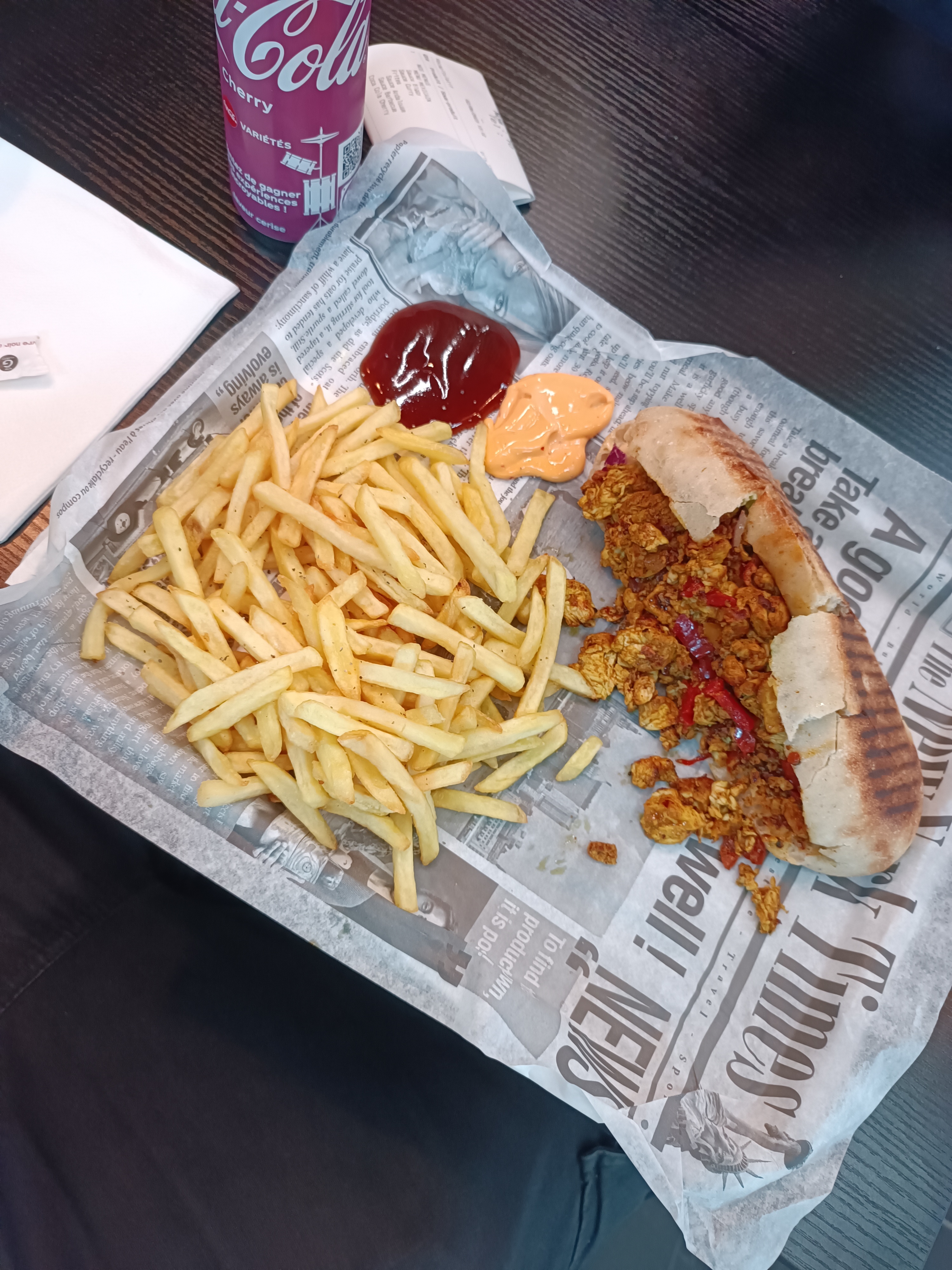 Très copieux , endroit propre et agréable , personnelle très sympa ,c’était très bon je vous conseille vivement, mieux que le Mc do, Burger King, Quick, KFC …