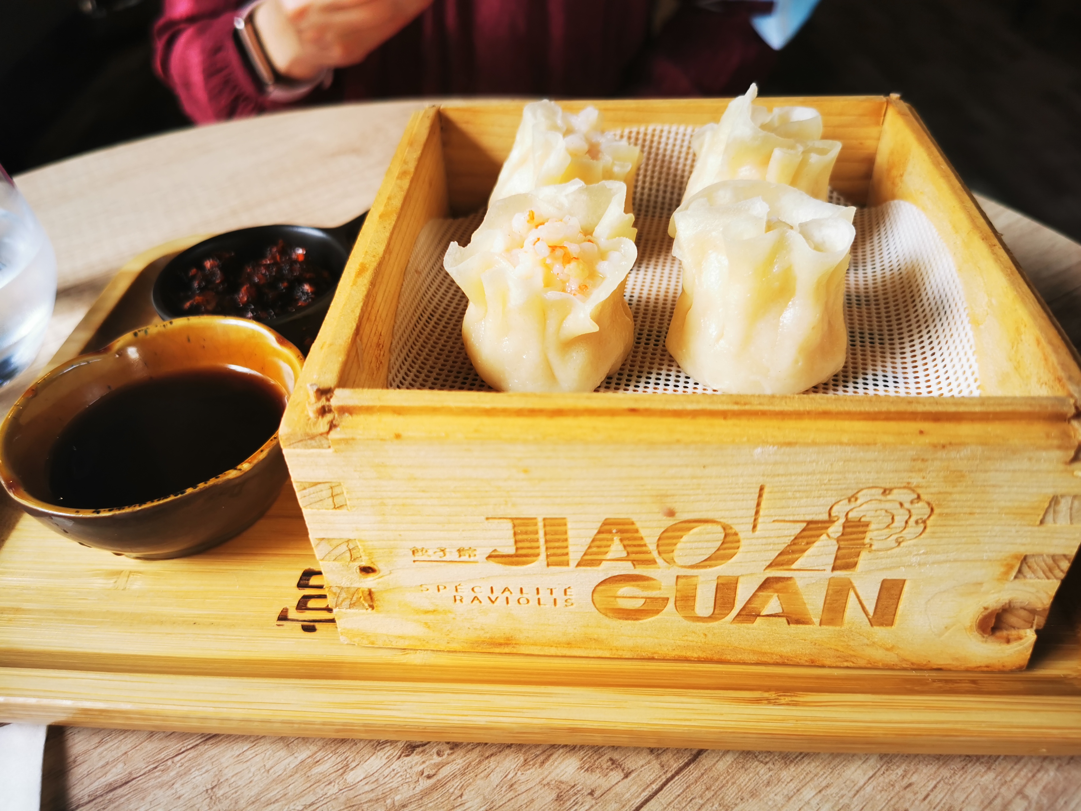 Jiao Zi Guan est une nouvelle adresse à retenir. Attention peu de places , il vaut mieux réserver avant. Pour une première visite , j ' ai testé le menu dégustation qui comprend 8 raviolis vapeurs + 2 accompagnements au choix. Les raviolis sont préparés chaque jour avec de la farine et des légumes bio . Sans gluten. Pour les raviolis vapeurs : Veggie , Crevette , porc et gyoza poulet. Accompagnements : Salade d ' algues , fèves de soja , bol de riz. J ' ai choisi en option une personnalisation pour prendre les raviolis de mon choix . Présentation très sympa ! Les raviolis sont vraiment savoureux . J ' ai particulièrement apprécié ceux au porc et à la crevette. Au dessert 2 mochis glacés. Fleurs de sakura ( cerisier ), l ' autre thé vert matcha. Rafraîchissant et surtout bon. Vous avez également des menus végétarien et sans gluten proposés. Je recommande cette adresse. Merci pour votre accueil et à bientôt pour continuer à découvrir vos spécialités.