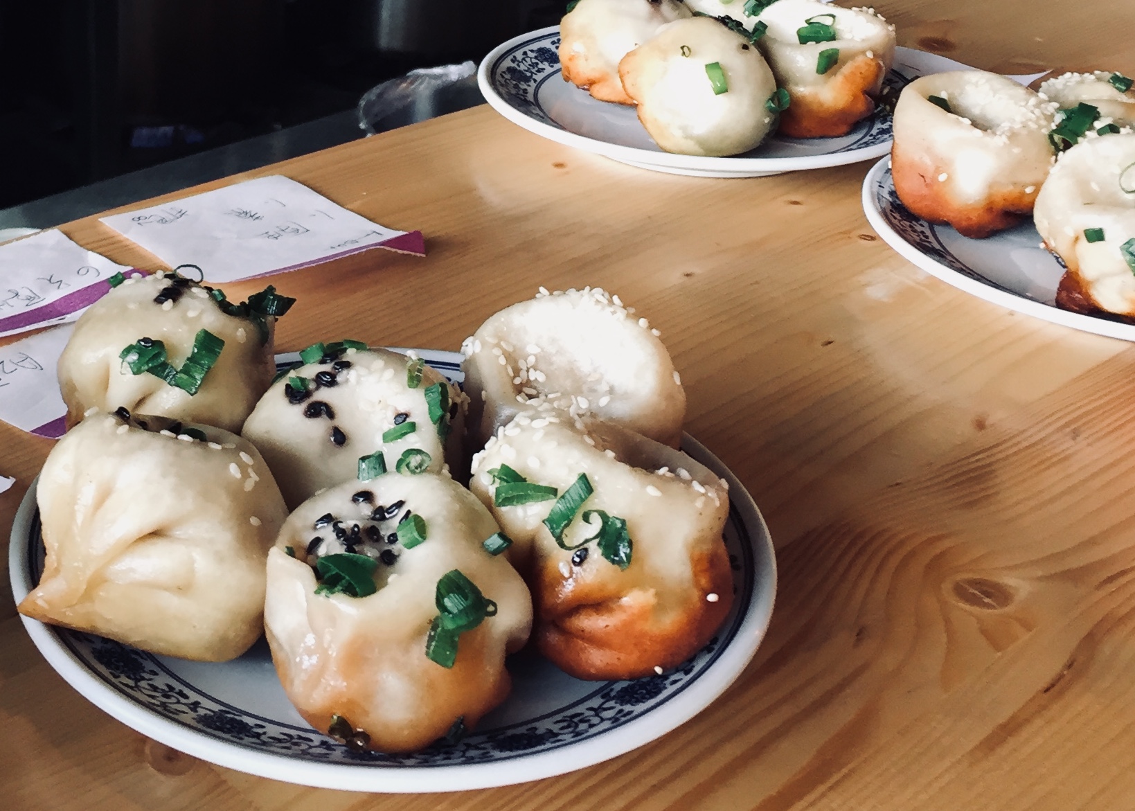 Nouilles chinoises un peu refaites à la françaises, mais les shengjian(s) au porc sont incroyables, comme ce qu’on mange en Chine !