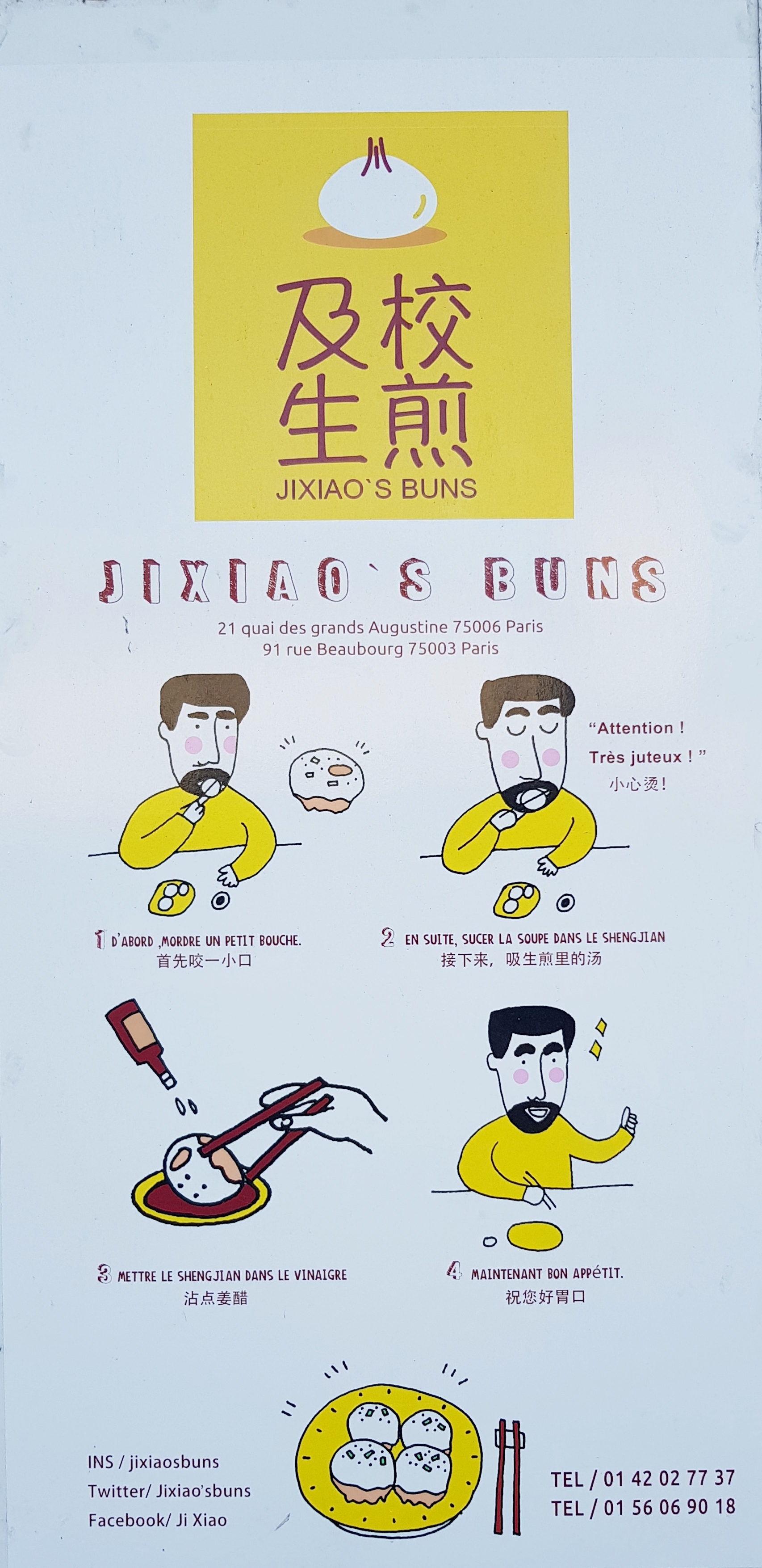 Dès que je le peux, je vais chez Jixiao's Buns et me régale avec leur recette de buns classiques au porc (pour un gros appétit, j'en prends 8 et ça me suffit amplement). Le service est rapide, le prix raisonnable, le goût.... excellent ! Une de mes adresses préférées à Paris.