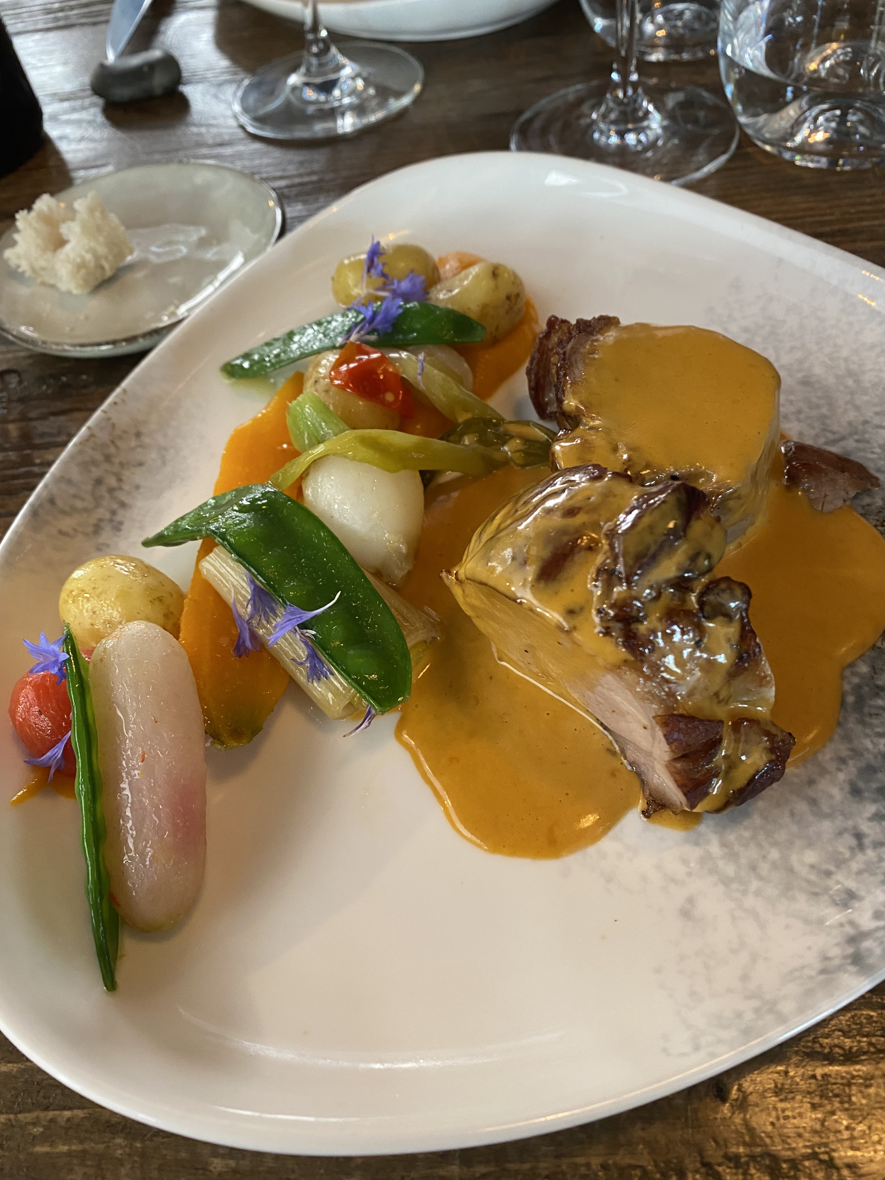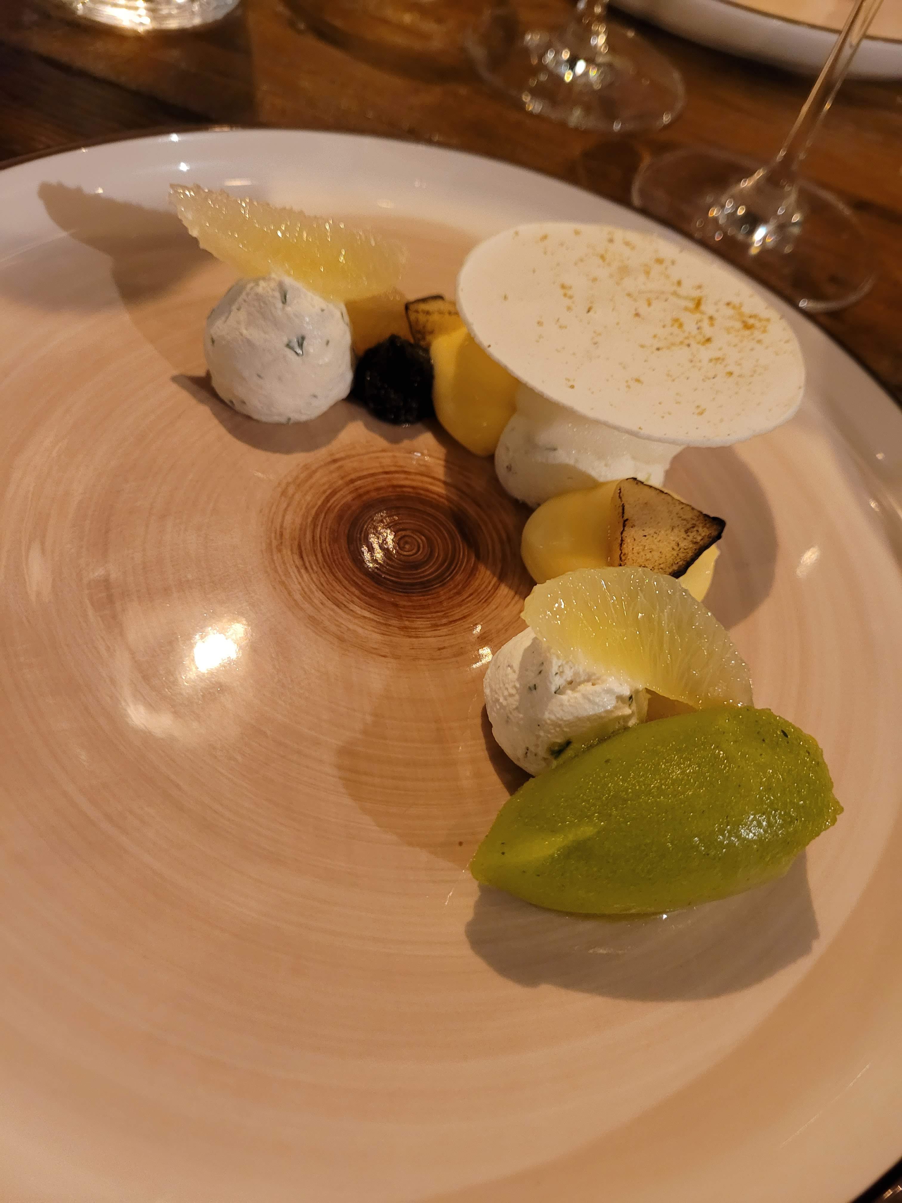 Première fois dans ce restaurant pour un dîner. Le repas commence très fort avec les amuses bouches aux inspirations italiennes, un sans faute, idem pour le pain, la focaccia maison ainsi que l'huile d'olive et le beurre au sapin fumé. La barre est mise très haute, le plat est lui aussi très juste. Nous avions donc de grandes attentes quant au dessert, malheureusement grosse déception. Une part de glace maison, la présentation ainsi que la proposition dénote de ce qui précédait. Pas de lien avec le reste du repas, produits frais certes mais en l'occurrence abricot pas de saison ce qui explique son absence de parfum dans la glace, idem pour la consistance de la glace, difficile à manger sans compter l'absence de relief dans l'assiette. Une boule de sorbet aux fruits de saison ou un granité au citron avec la même crème accompagnés d'une tuile ou d'un croquant, par exemple, cela aurait fait une grande différence. Après cette déception nous nous attendions à de petites mignardises avec le café afin de terminer le repas sur une meilleure note. Rien du tout. Cela reste surprenant surtout par rapport aux ambitions de ce restaurant ainsi qu'au début du repas où le contraste est flagrant. Malgré cette fin de repas décevante je ne doute pas que les patrons sauront rectifier ses maladresses aux vues de ce que nous avons pu voir en début du repas. Nous reviendrons sans doute à l'avenir afin de confirmer notre avis. Félicitations tout de même pour ce bel établissement.