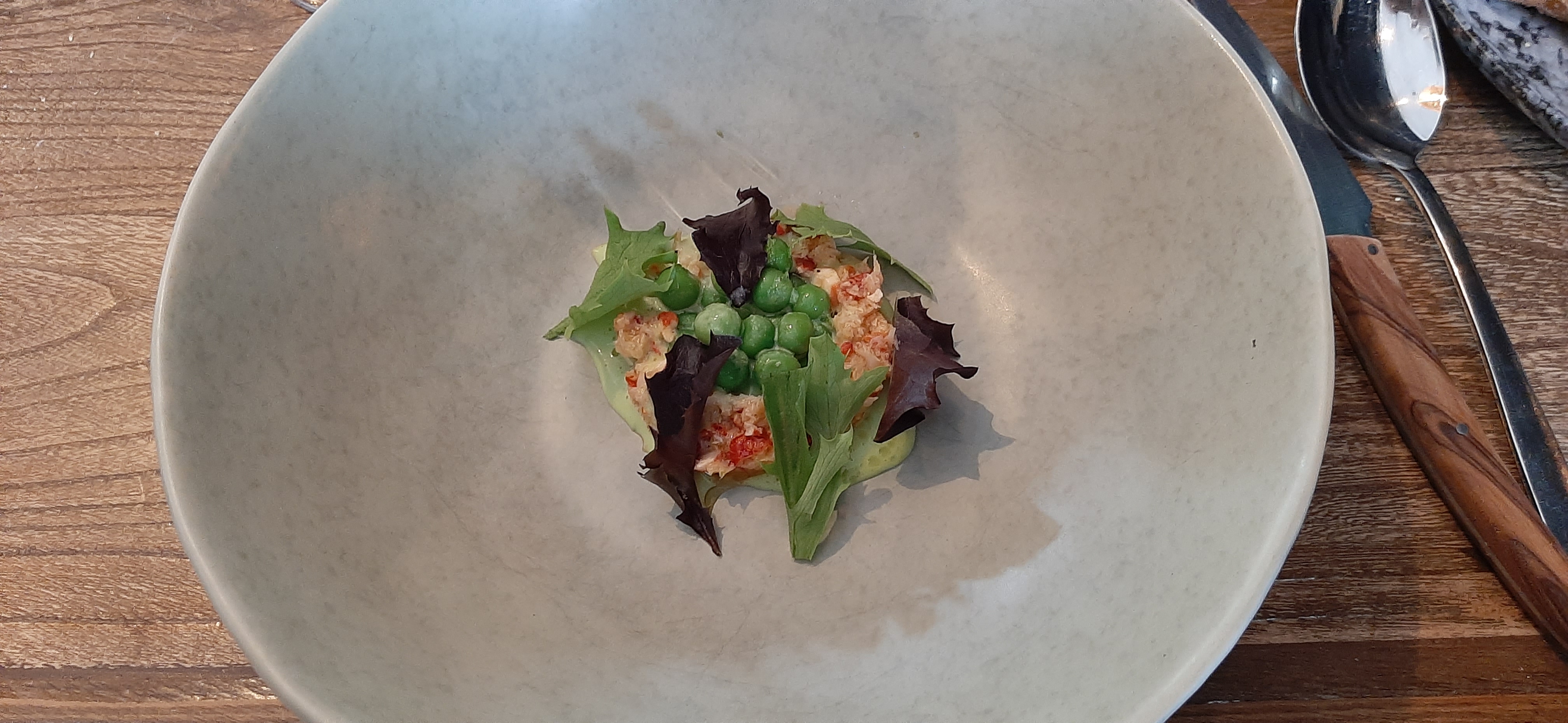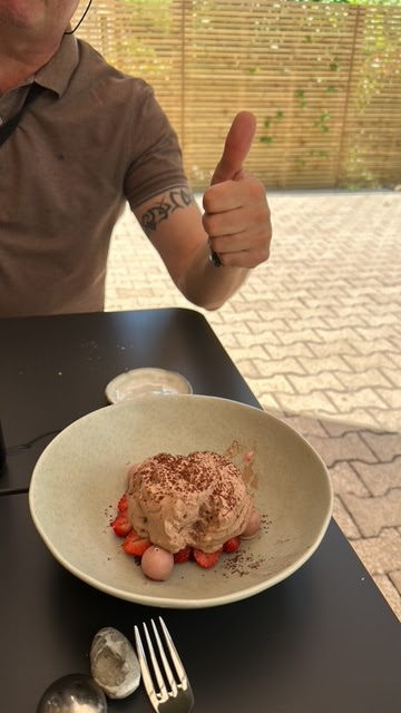 Nous étions ici samedi avec 4 personnes pour déjeuner, accueil sympathique, quartier agréable où aller. Nous nous sommes assis en terrasse, il faisait beau (25°C) et Une atmosphère chaleureuse a été créée avec des toiles d'ombrage. En été, les arbres sont en pleine feuille pour une ombre naturelle. Terrasse fraîche et pouvant être considérée comme agréable pour la région. J'ai opté pour 5 plats, ce qui était parfait. Beau vin, un apéritif de la région, des plats frais, une belle vaisselle, de belles saveurs et un bon équilibre. Quel régal lorsque la compagnie offre une atmosphère agréable et que le service est également de premier ordre. Merci JK!