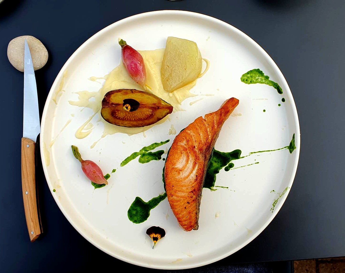 Beaucoup d’étoilés devraient s’en inspirer. Un lieu charmant et intime, un service impeccable avec un personnel fort sympathique. Mais en ce qui concerne l’assiette ? Un panel de saveurs, des produits fins et délicieux, une originalité exceptionnelle….bref, à déguster sans modération ! À faire et refaire et surtout à découvrir pour ceux qui n’ont pas eu la chance d’aller y émerveiller leurs papilles.