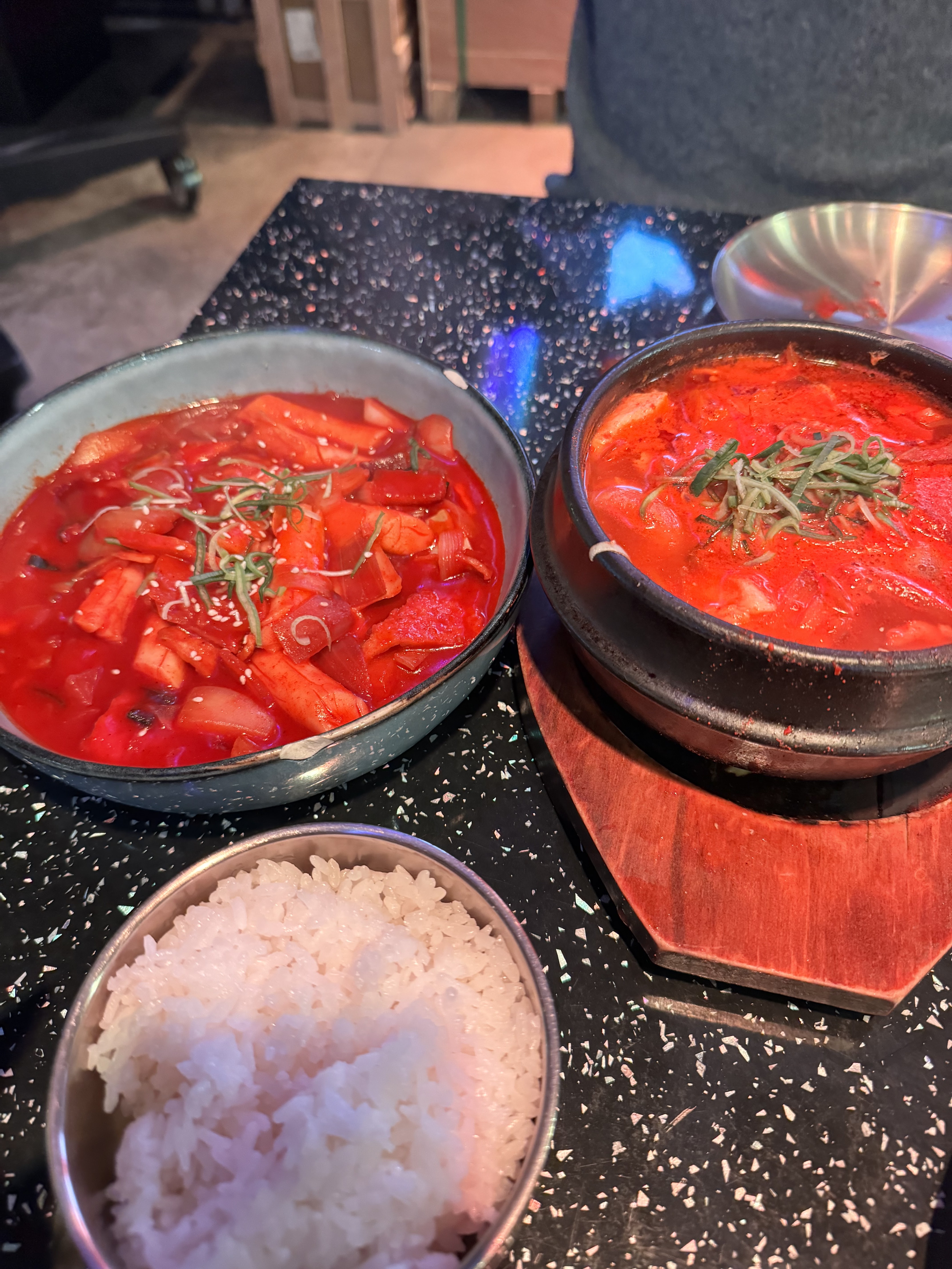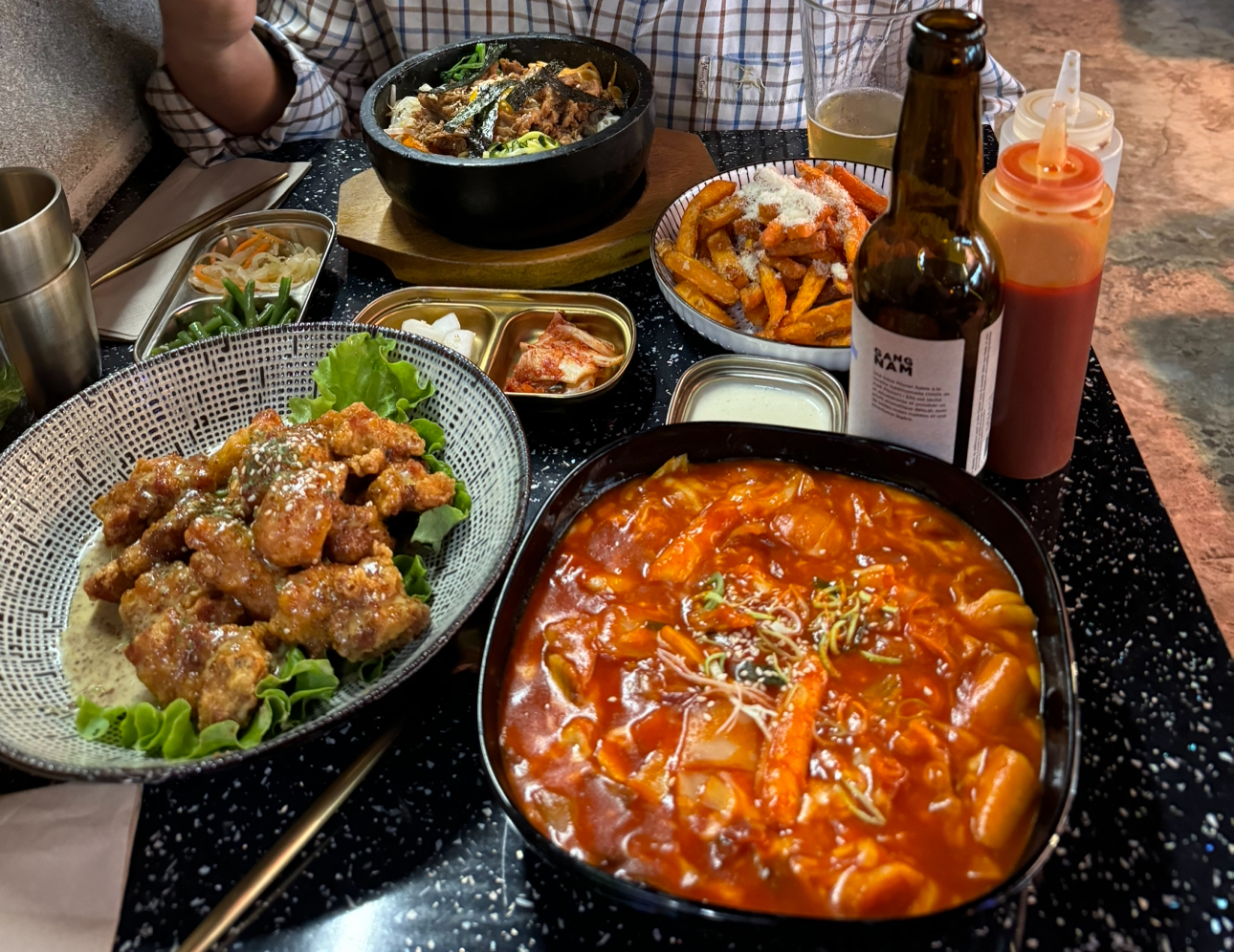 Assez deçue de la qualité du service la table arrivée plusieurs minutes apres nous a été mieux servi. Le plat est arrivé nous n’avions ni assiette pour le barbecue ni pince ni carafe d’eau tandis que la table d’à côté qui allait attendre encore un moment si. Le service est très mal organisé et nous attendons toujours longtemps a chaque demande. Le poulet fri etait cependant délicieux ainsi que le barbecue mais le teobokki est à fuir car nous avons eu très mal au ventre après. Nous ne revieondrons sûrement pas mais au moins on a essayé.
