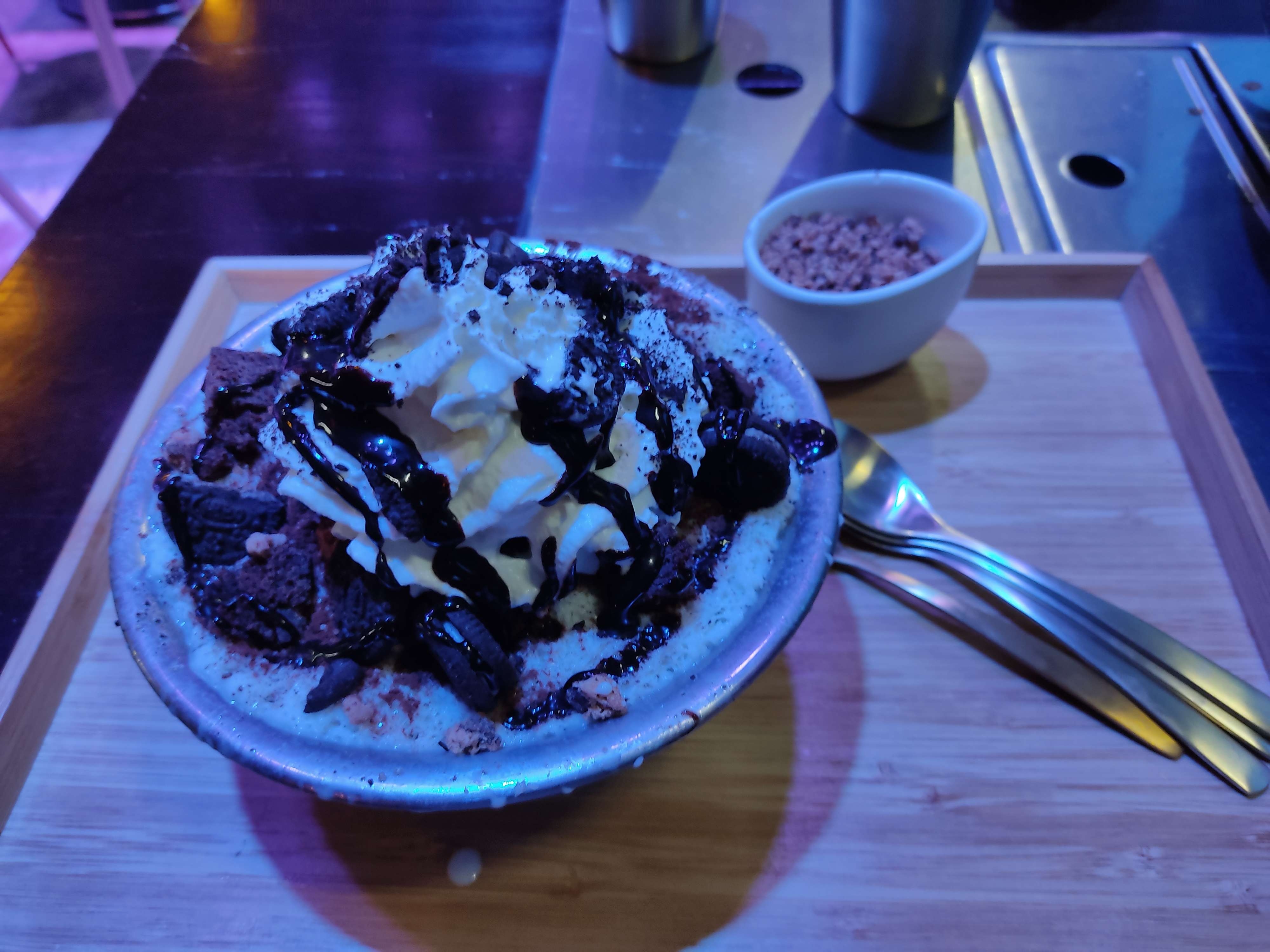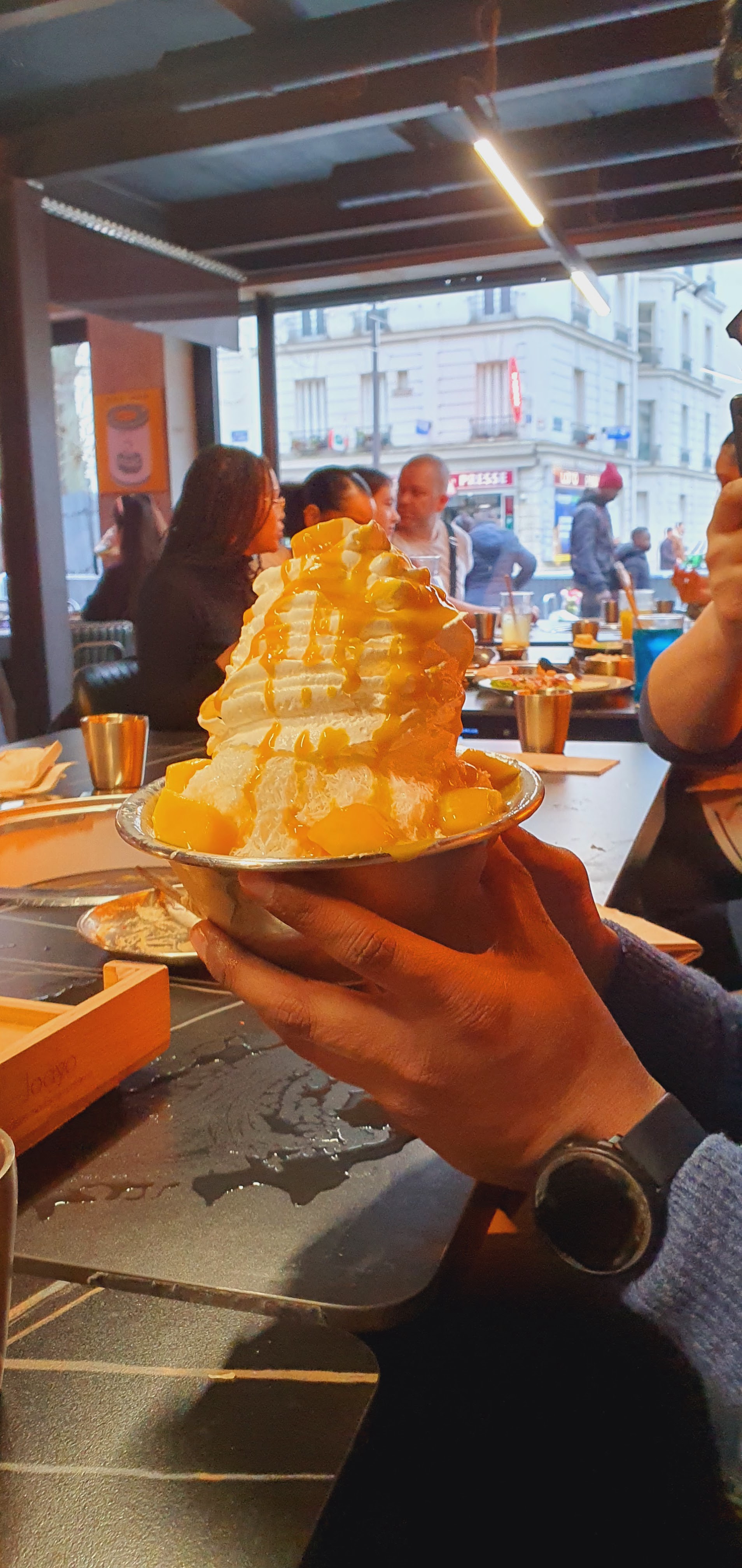 Découvert ce restaurant par hasard en visite sur Paris, une belle surprise . Nous avons adoré notre soirée, très bien accueilli et conseillés par les serveuses dans la salle en haut , le service impeccable , la quantité rapport qualité prix rien à dire , on a extrêmement bien mangé tellement copieux ( pu même ramener les restes ) , les plats épicés ou non selon la demande ( pour ma part épicée j ai adoré) , le dessert à la glace pilée au goût oreo et kitkat comment dire un véritable régal qui a fait l unanimité. L ambiance avec écran géant et clip qui attire . La propreté du lieu comme des toilettes à disposition. A refaire et à conseiller 😊