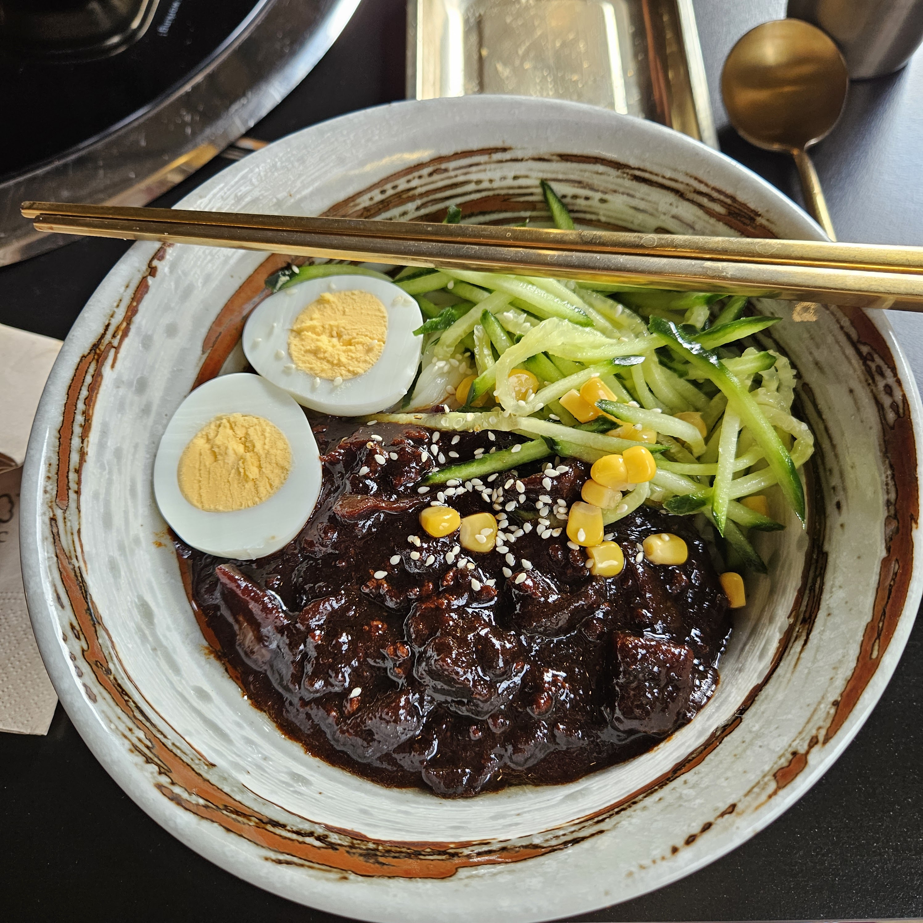 Expérience un peu décevante.. Restaurant bruyant , les serveurs ont l’air d’être debordés Il faut commander avec une tablette et chercher un serveur pour qu’il valide la commande. Les entrées et les plats arrivent au même temps. C’était la première fois qu’on goutait le Jajangmyeon et on l’a trouvé un peu fade