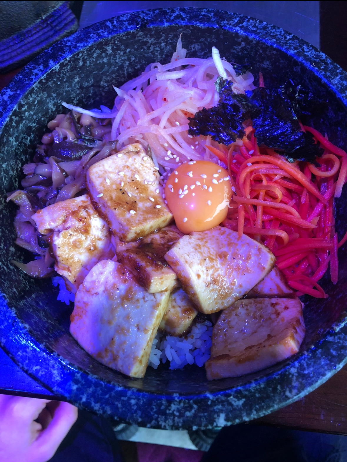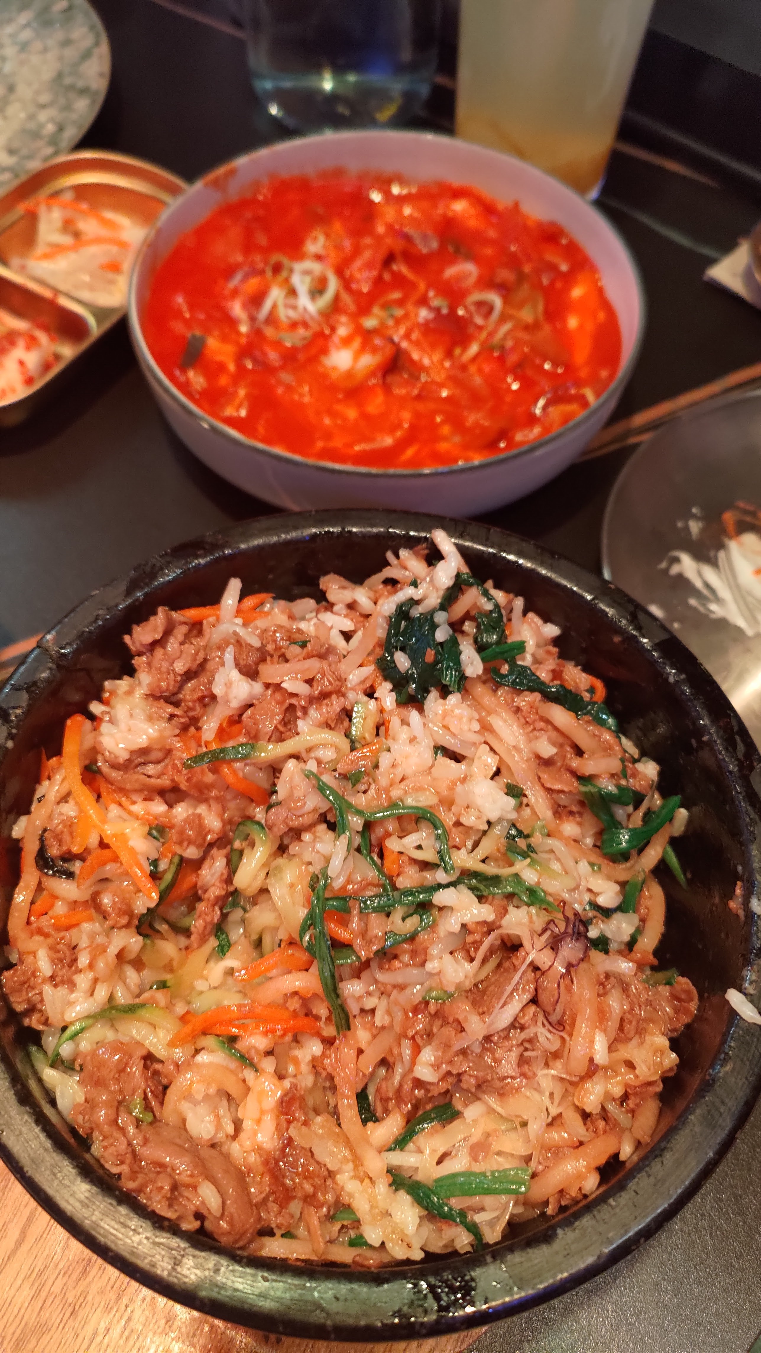 Je déconseille le bibimbap au calamar qui n’avait pas de goût…par contre, apparemment celui au bœuf est délicieux. Les galettes au chou et nouilles sont pas mal également :)