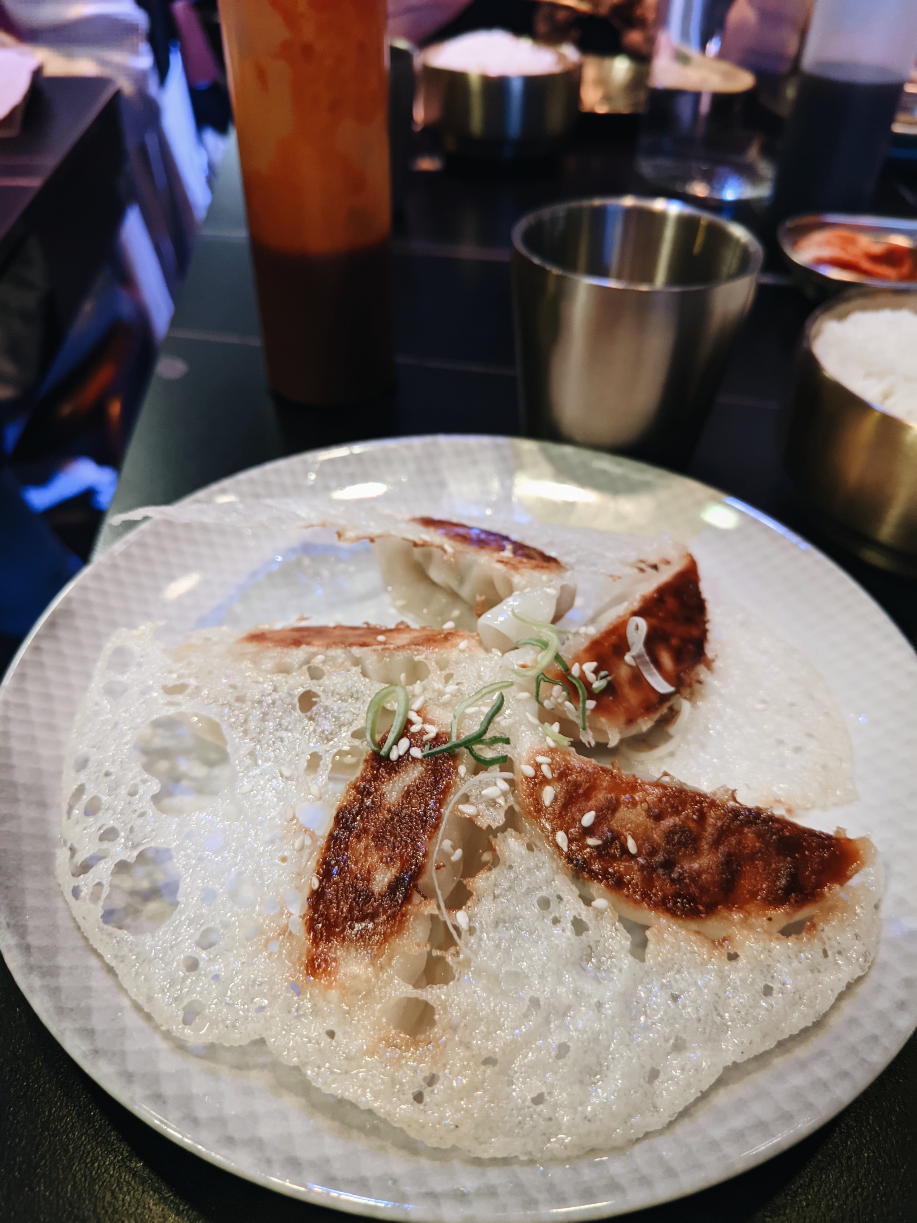 Expérience parfaite. Première fois que nous nous rendons dans un restaurant coréen. Malgré l’heure tardive, le personnel nous a accepté sans réservation et nous a installé en haut. Nous avions la salle du haut pour nous. Le serveur vulgarise à merveille, il a été disponible tout le long du service. Les locaux sont très propres, le design moderne avec de la K-Pop en fond sonore (sur grand écran) mais qui nous permet tout de même de nous entendre. Les plats sont incroyables notamment l’entrée : poulet à l’aïoli, les portions extrêmement généreuses. Nous avons toutes pris le reste à emporter. En bref parfait pour une soirée, je recommande .