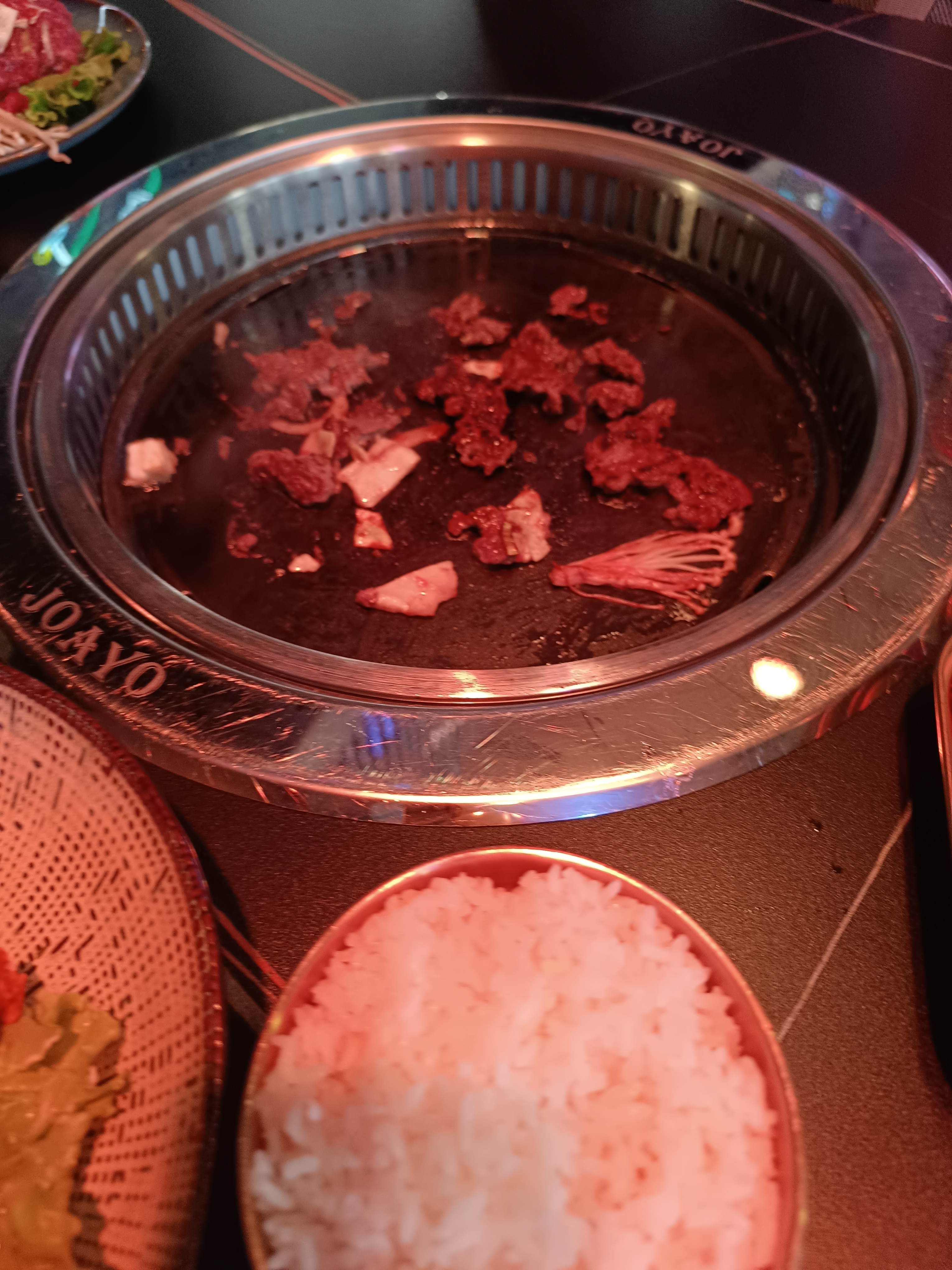 Nous sommes venus à Joayo13 pour fêter un peu tardivement mon anniversaire. Nous avions donc réservé une table de 8-9 via The Fork, avec une promo -20 ou -30% sur la carte. Nous avons commandé pas mal de plats différents afin de pouvoir tout goûter. Assez fan du barbecue coréen de chez Joayo Alésia, j'ai commandé plusieurs viandes en ne sachant pas qu'il ne s'agissait pas des mêmes enseignes. Ou en tout cas si c'est la même, je ne comprends pas la dégradation dans la qualité de la viande. Le bœuf était bon et correct. Bien mariné, qualité acceptable. Le poulet était pas mal aussi ; je n'en prends d'habitude jamais car il est souvent de mauvaise qualité mais cette fois-ci je l'ai trouvé bon. Par contre le porc... C'est une viande que je prends dans tous les barbecues coréens auxquels je vais mais là, nous sommes 3 à nous être posés la question de quelle viande il s'agissait car elle n'avait pas du tout le goût de porc. Grosse déception. Les gyozas étaient cependant bons, et les banchans (même si en petite quantité) étaient pas mal. La note est plutôt douce à la fin grâce à la réduction. Niveau service, j'ai trouvé le personnel sur place froid et expéditif, alors que la personne que j'avais eue au téléphone pour déplacer ma réservation était super sympathique. Vous commandez sur des tablettes et les plats arrivent ensuite, pas forcément dans l'ordre auquel vous vous attendiez. L'ambiance sur place est particulière, il faut en être conscient. C'est très bruyant, ambiance karaoké, avec de la musique kpop qui passe en fond très sonore. Pas trop idéal pour un anniversaire car nous ne nous entendions pas très bien. Pas sûre d'y revenir.