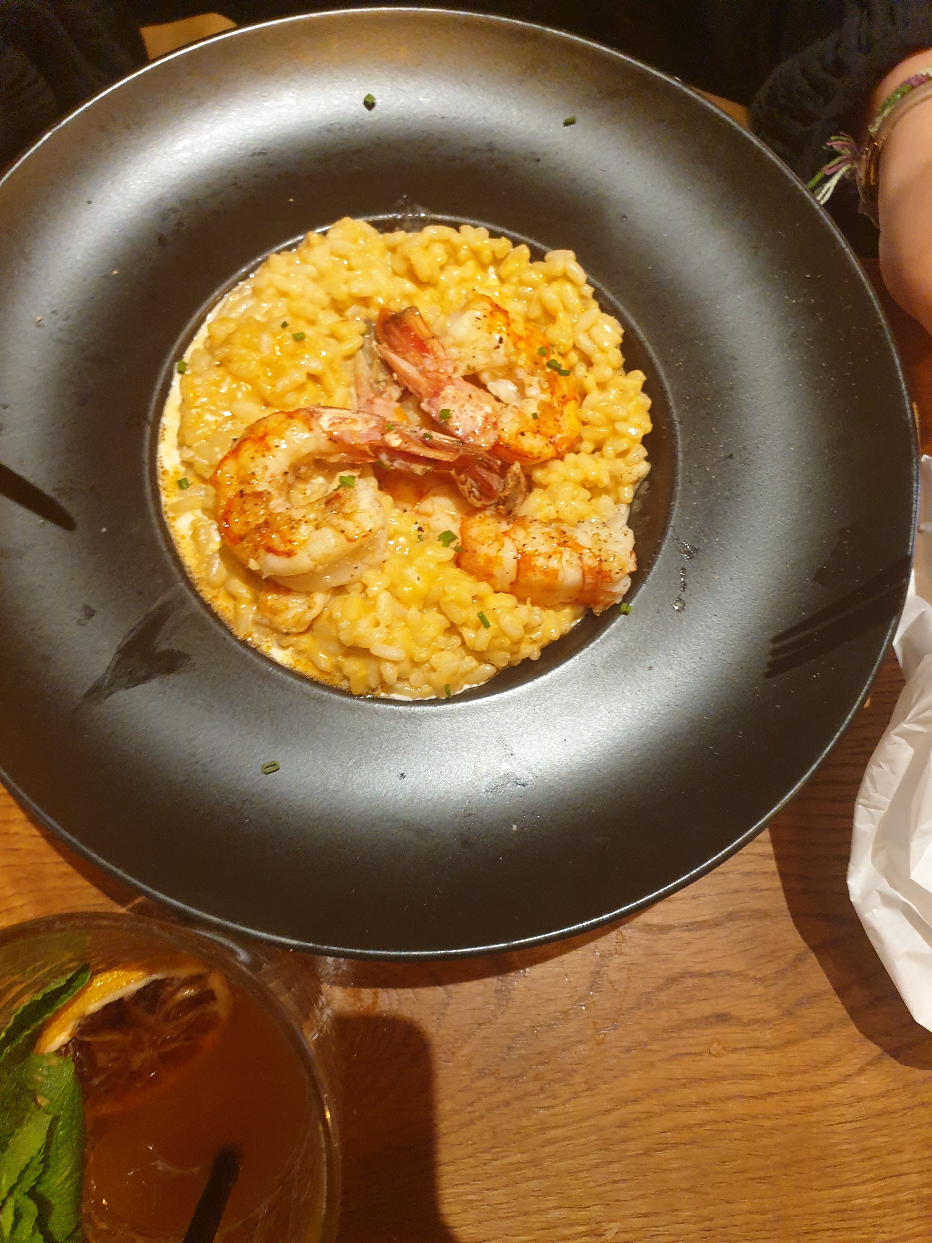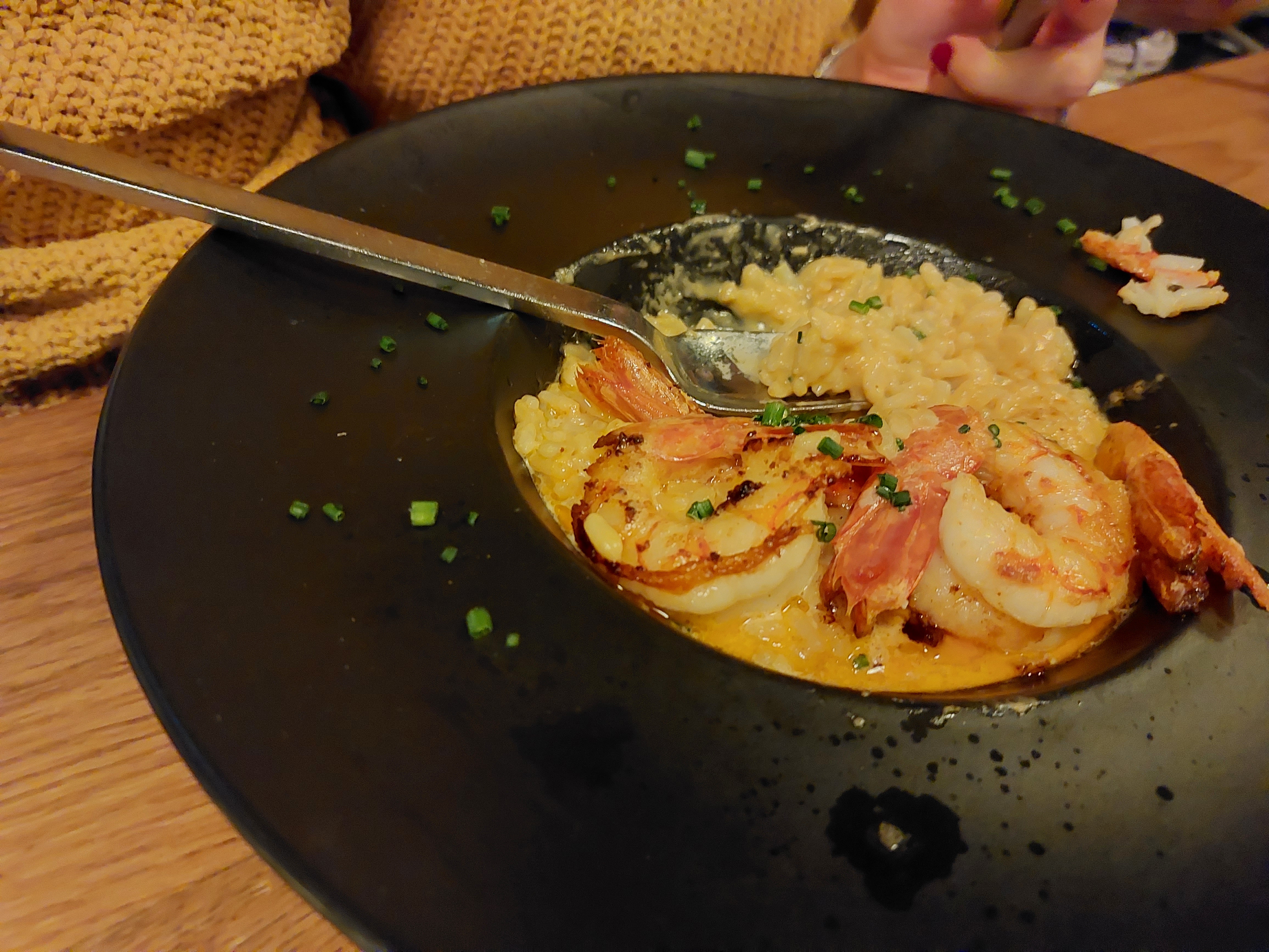 J'ai pris le risotto aux gambas. Alors c'était bon mais rien d'exceptionnel, mais surtout, payer 26€ pour 4 crevettes, c'est abusé !!! 4 crevettes !!!! Vous pourriez être un peu plus généreux, car ça fait cher le riz. Et en plus, le besoin minimum en protéine d'un humain n'est même pas comblé. Heureusement qu'on avait un super serveur ! (le brun aux cheveux bouclés), qui nous a même gentiment offert des roses :) Très serviable, avec une petite touche d'humour. Merci à toi ! (et désolée on a complètement zappé de te laisser un pourboire, on y a pensé que plus tard) L'ambiance du resto est sympa. Musique pas trop forte. Chaises confortables !