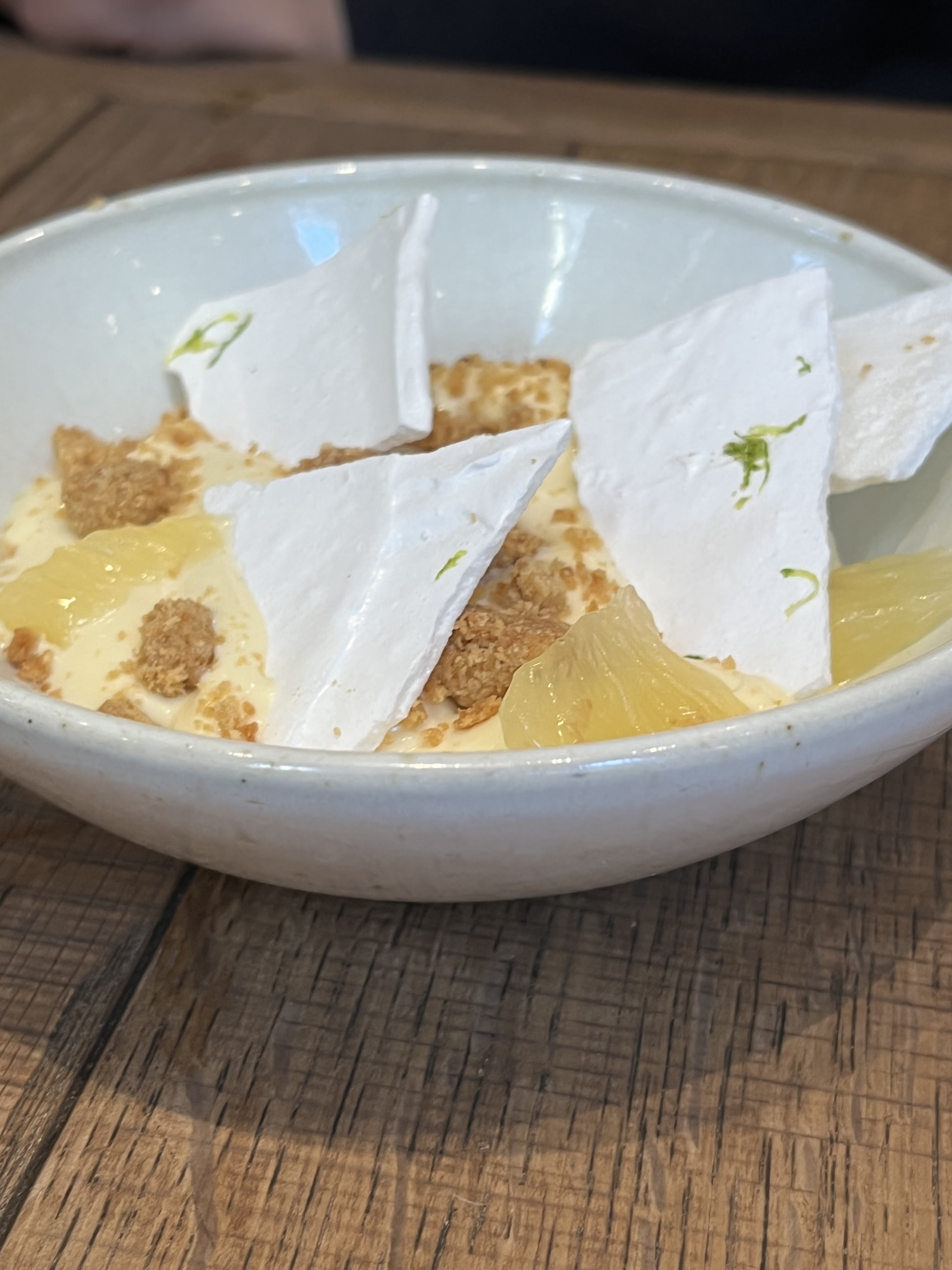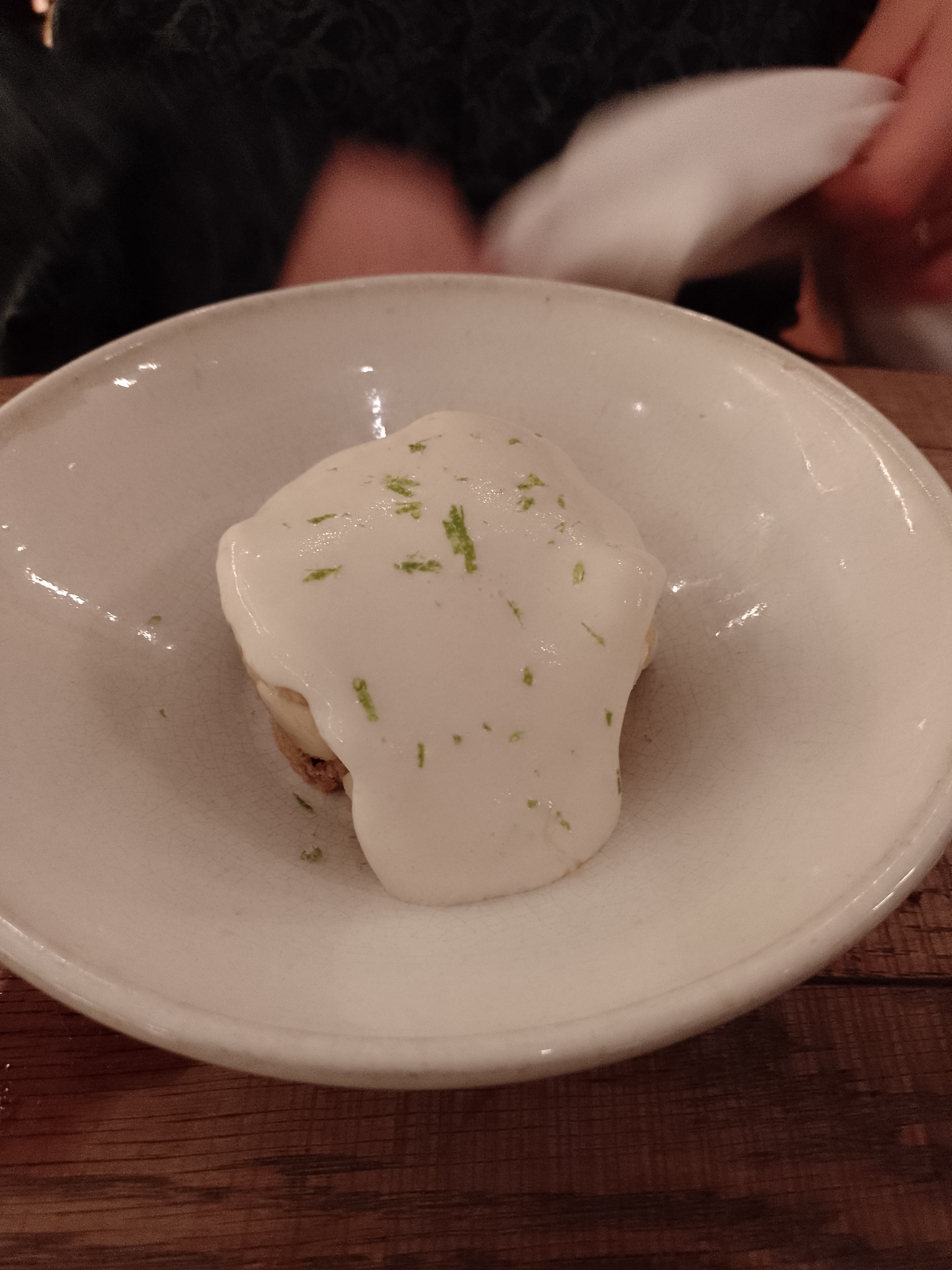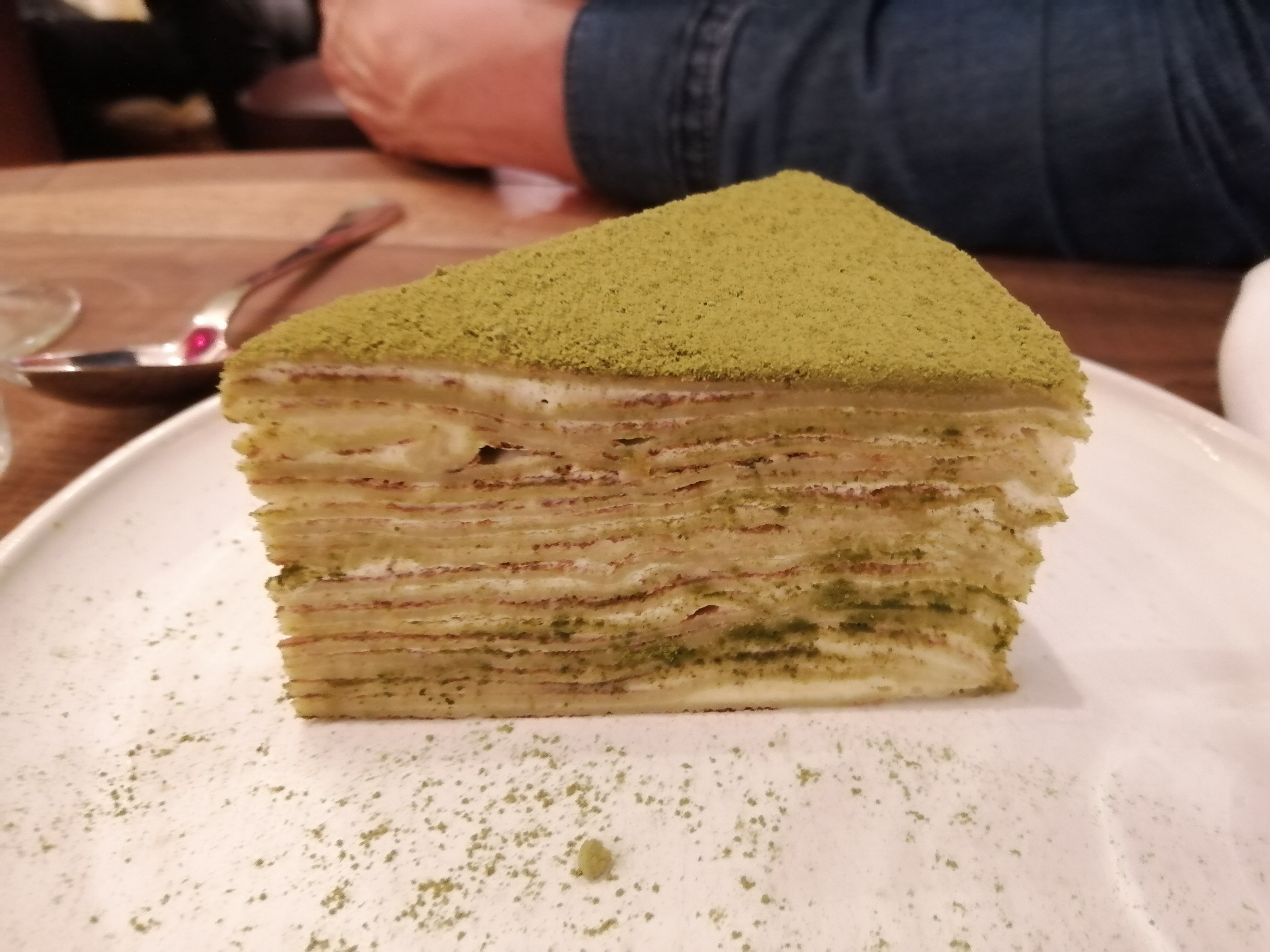 nous sommes venues pour goûter le dessert le matcha milles accompagné d’une crème de yuzu on s’en faisait une joie. On aurait du être alerté par le tapas apéro le tempura de merlu qui n’en était pas une elle était grasse le poisson à chair ferme ne se séparait pas donc impossible de manger la pâte et le poisson ensemble. Première erreur c’est un beignet de poisson pas un tempura ce n’est pas la bonne pâte et vraiment trop huileux Mais ensuite les entrées sont très bonnes mention spéciale aux champignons de saison avec œuf confit et foie gras un délice qui coûte la modique somme de 25 euros quand même mais quand on aime on ne compte pas n’est ce pas Ensuite le risotto à l’encre de seiche est bien sans être fou Le service est super la rêveuse était dynamique disponible à l’écoute toujours souriante un plaisir c’était presque le plus dur de devoir lui dire ce qui n’allait pas et pourquoi Arrivons au cœur du problème le matcha milles crêpes certainement un de mes desserts favoris je maîtrise donc bien le sujet et la celui de madame Darroze est une insulte il n’a pas le goût de matcha pas celui de crêpe ni de vanille la seule chose bonne c’est le condiment de yuzu. La texture du gâteau est dur comme si on avait figé les crêpes et l René dans de la gélatine la poudre verte qui est posée dessus n’a pas le goût de matcha et la crème entre les crêpes est fade insipide le dessert n’a pas de goût et une texture en bouche désagréable c’est terrible et si décevant encore une fois c’est quand même 12 euros la part à ce prix on goûte can’t de servir Au vu de notre déception la serveuse a tenté de compenser en nous apportons un autre dessert même si j’avais dit ne rien vouliez d’autres et pas de chance c’était une pavlova qui avait l’air bonne mais n’aimant pas la meringue c’était raté Pour conclure un restaurant cher pas à la hauteur au niveau culinaire surtout sur les plats en lien avec le Japon tempura et milles crêpes les deux seuls de la carte mais un service au top