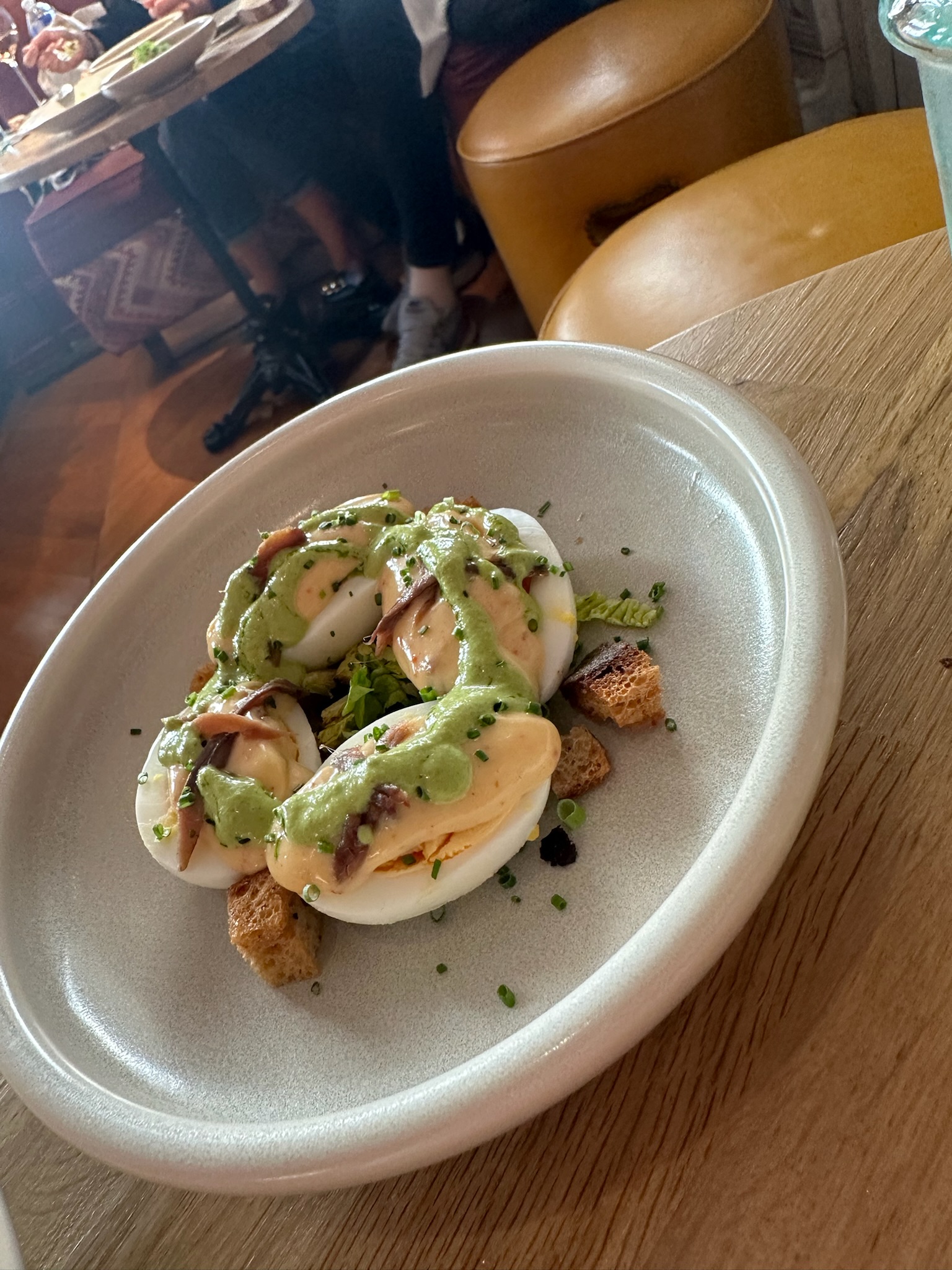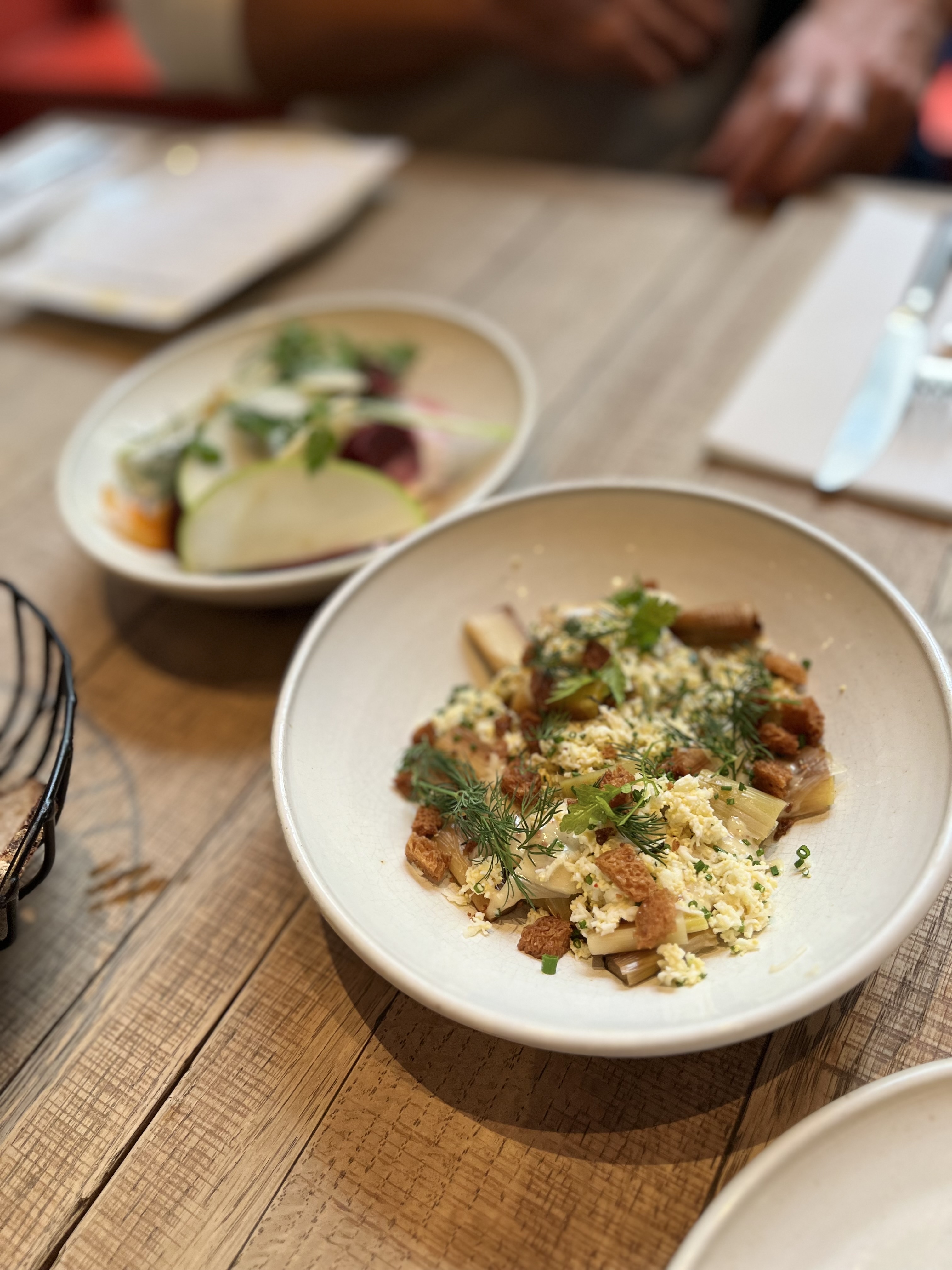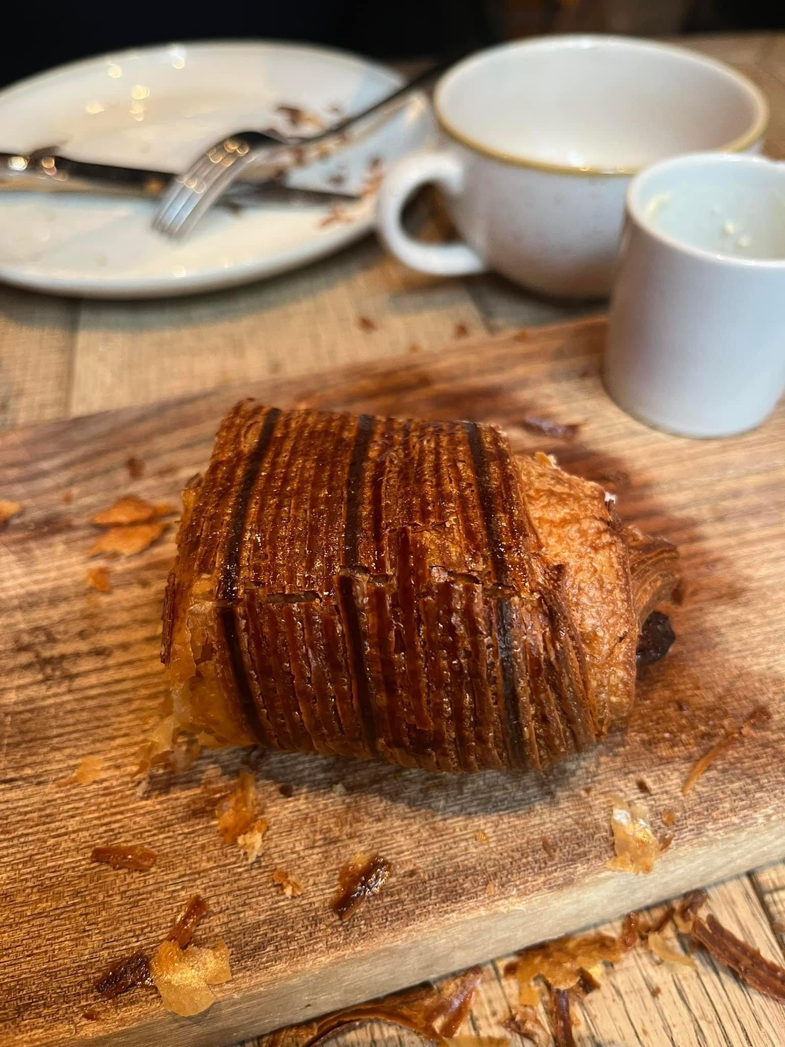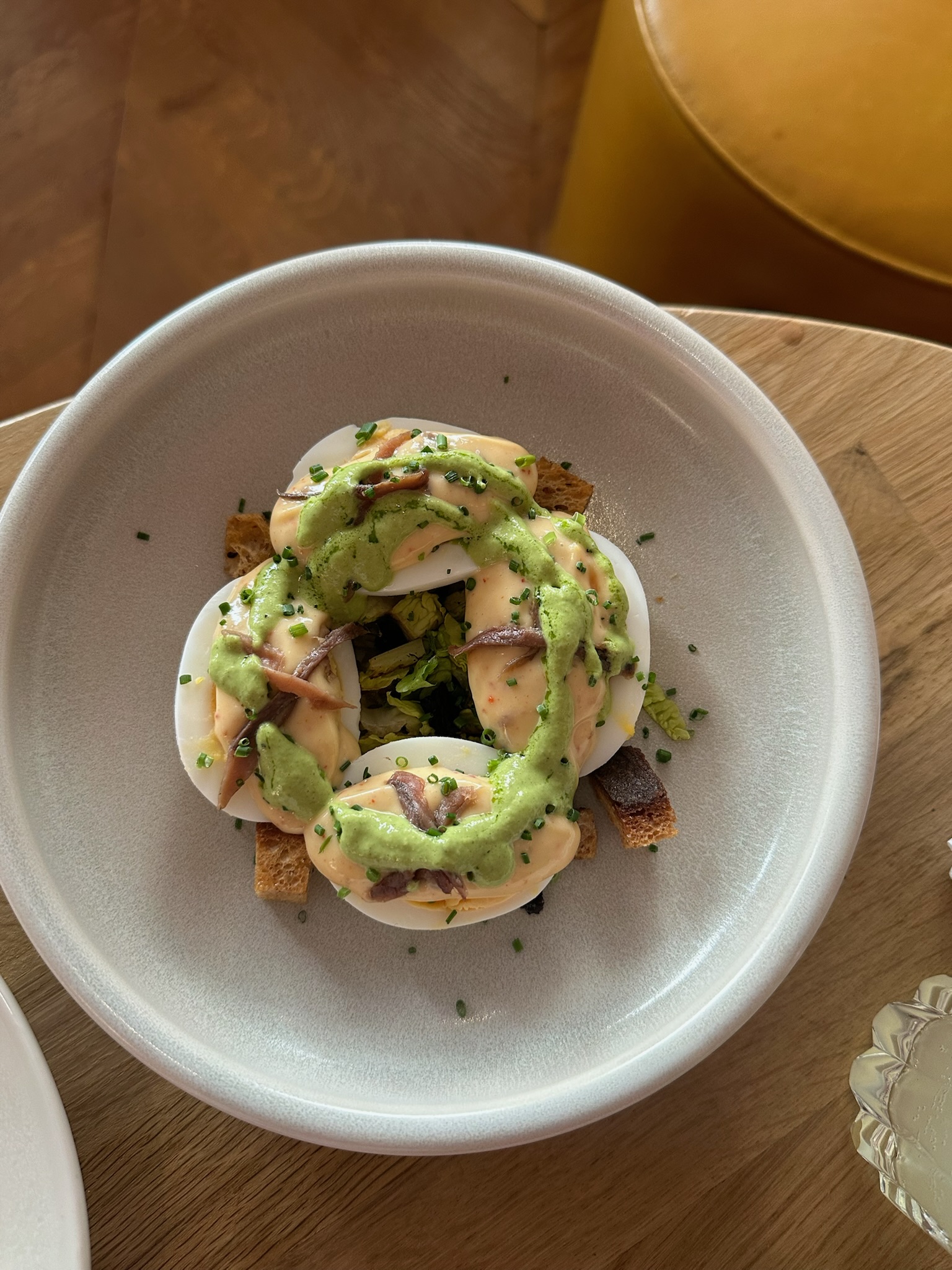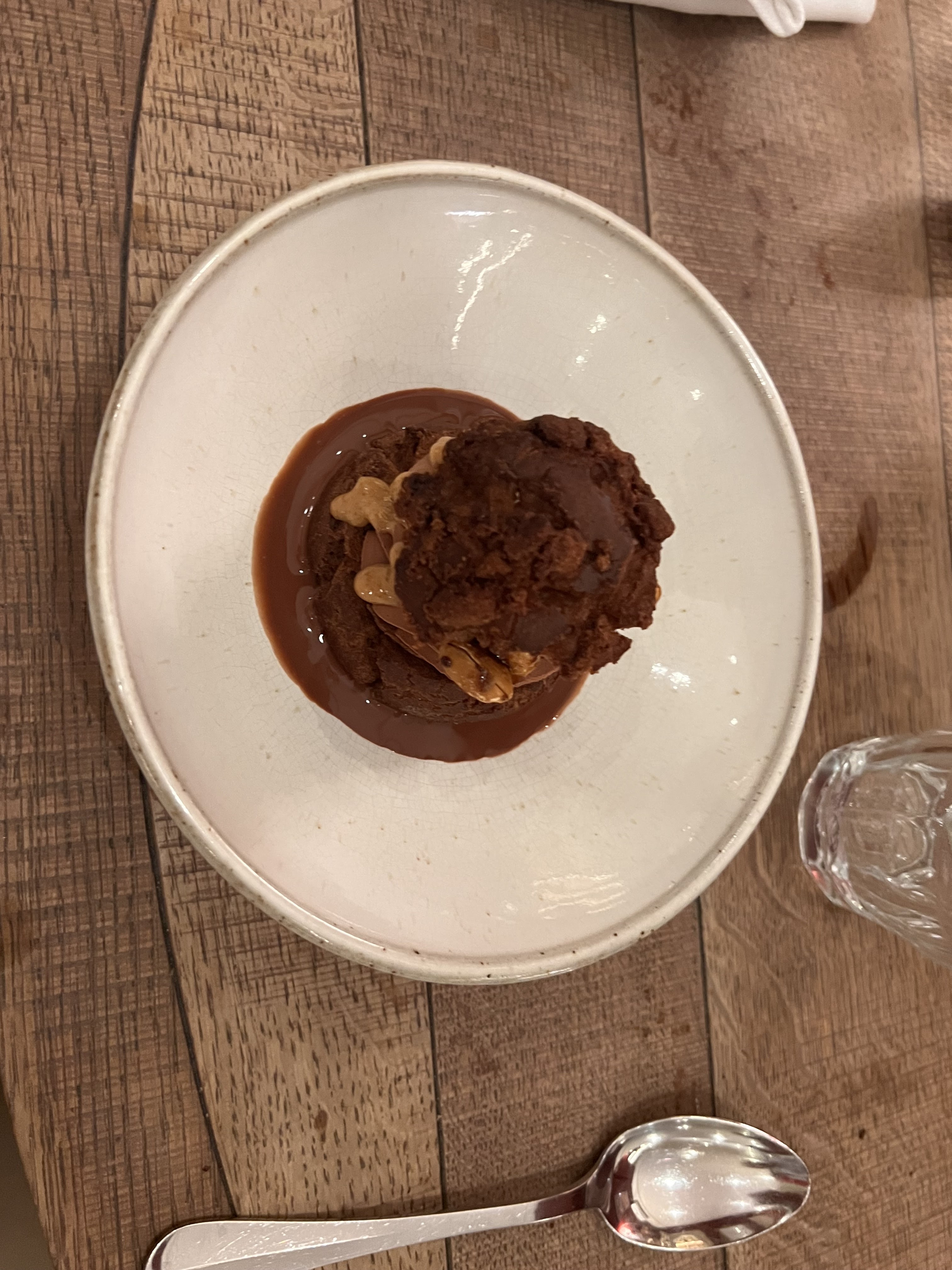 Nous sommes venus pour le brunch (48€ la formule). L’endroit est très beau, nous sommes bien installés et le service rapide est apprécié. Nous avons commencé par le pain au chocolat et banana bread à partager, qui étaient gourmands. Puis la chicken pie et la sucrine, bien assaisonnés également. Viennent ensuite les plats (œufs Bénédicte) et pour finir, la gaufre et son colis de chocolat. Tout était très bon et copieux ! En revanche je trouve dommage que les plats et desserts soient aussi simples. Pour une cheffe de cette renommée (avec le prix qui s’en ressent) j’aurais attendu plus d’originalité et d’effort sur le dressage.