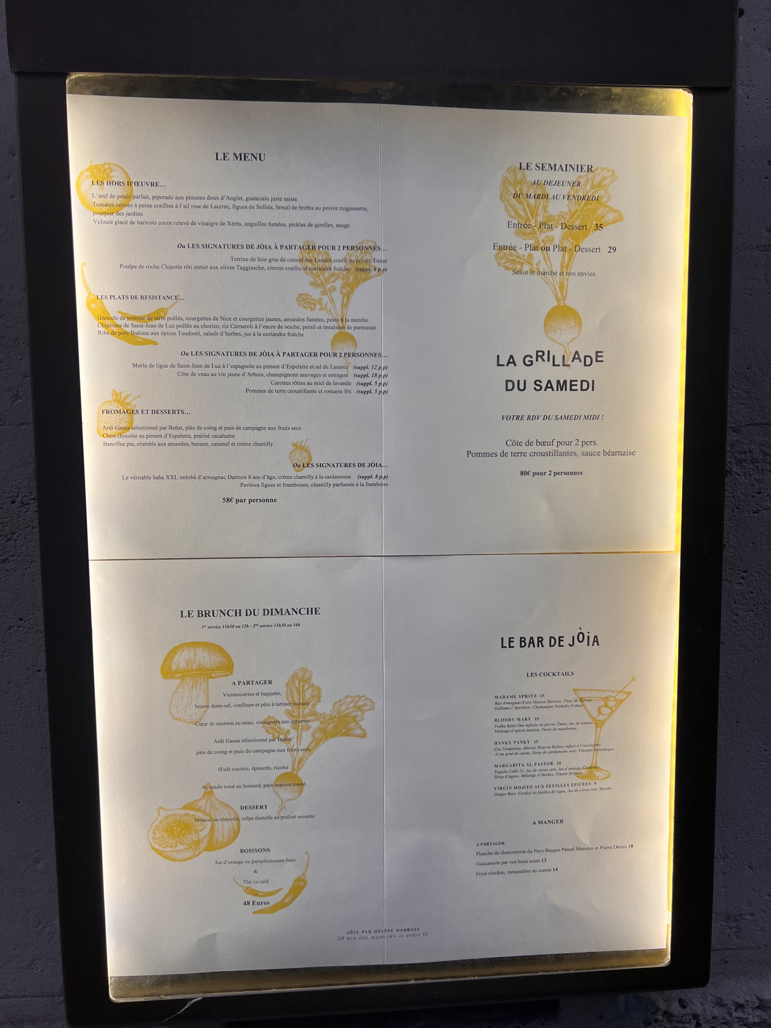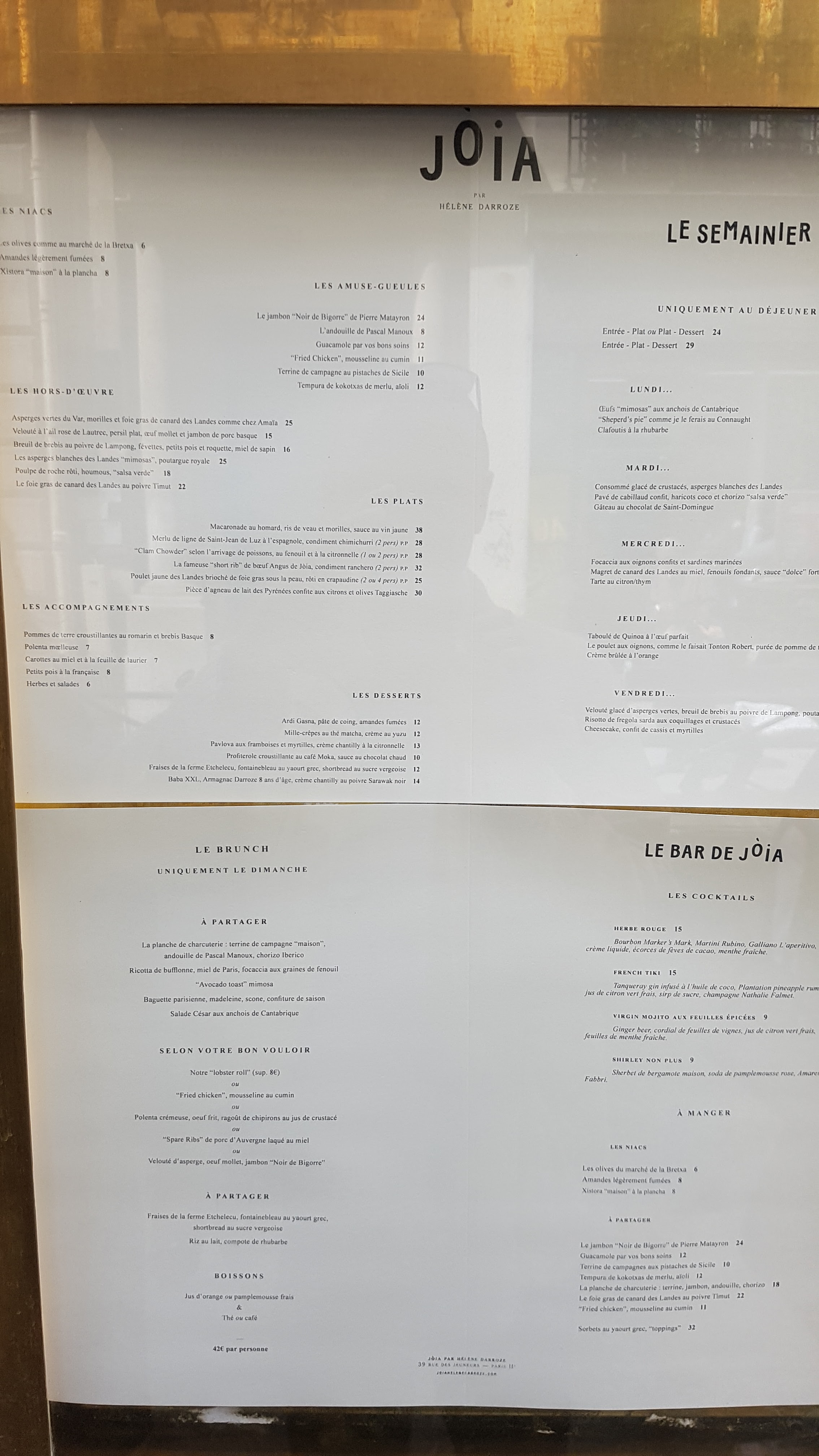Première fois chez Joia avec un brunch. C'était bon mais un peu décevant. Nous n'avons pas eu de beurre, je l'ai remarqué trop tard quand les tables d'à côté en ont eu mais nous avions déjà finis le sucré. D'ailleurs on nous sert le tout sans nous donner d'assiette en gros on mangeait à même la table, on avait du coup plein de miette partout et évidemment les serveurs ne viennent pas nettoyer ça avec un ramasse miette ou plus logique nous proposer d'eux même une assiette pour chacun d'entre nous. Serait ce pour éviter de faire de la vaisselle ou bien pas assez de matériel ?.... De plus, la carte du brunch ne correspondait pas à la plupart des plats. C'était écrit marmelade aux agrumes mais nous avions eu une confiture aux fruits rouges et sur la ligne des desserts portait à confusion car il y avait 3 lignes de dessert mais en réalité c'était juste un dessert. Si c'était un seul et même dessert pourquoi avoir sauté une ligne comme si c'était des plats dissociés ? 🤔 au final, c'était que 2 lignes pour l'appellation de ce dessert car la 3e ligne était en trop, une erreur d'impression d'après les dire de la serveuse donc il n'y avait pas du tout de savarin imbibé d'armagnac. Le dessert était un mélange de ces 3 lignes du coup mais sans le savarin. La soupe au chocolat avait le goût d'armagnac. Bref c'est pas très gastro et luxe de faire ce genre d'erreur et de ne pas en avertir en amont le client. Pour le thé, nous en avions commandé 3. On reçois une théière pour 2 et la 3e on nous la servie directement dans la tasse sans théière... ne pas avoir assez de matériel dans un restaurant de ce standing ça fait moyen OU par économie ne donner qu'une tasse par personne et une théière pour 2 ça fait radin aussi... Néanmoins le personnel était souriant et agréable. C'était bon mais pas exceptionnel donc déçue, et ça fait cher au final pour un brunch qui n'est pas exceptionnel