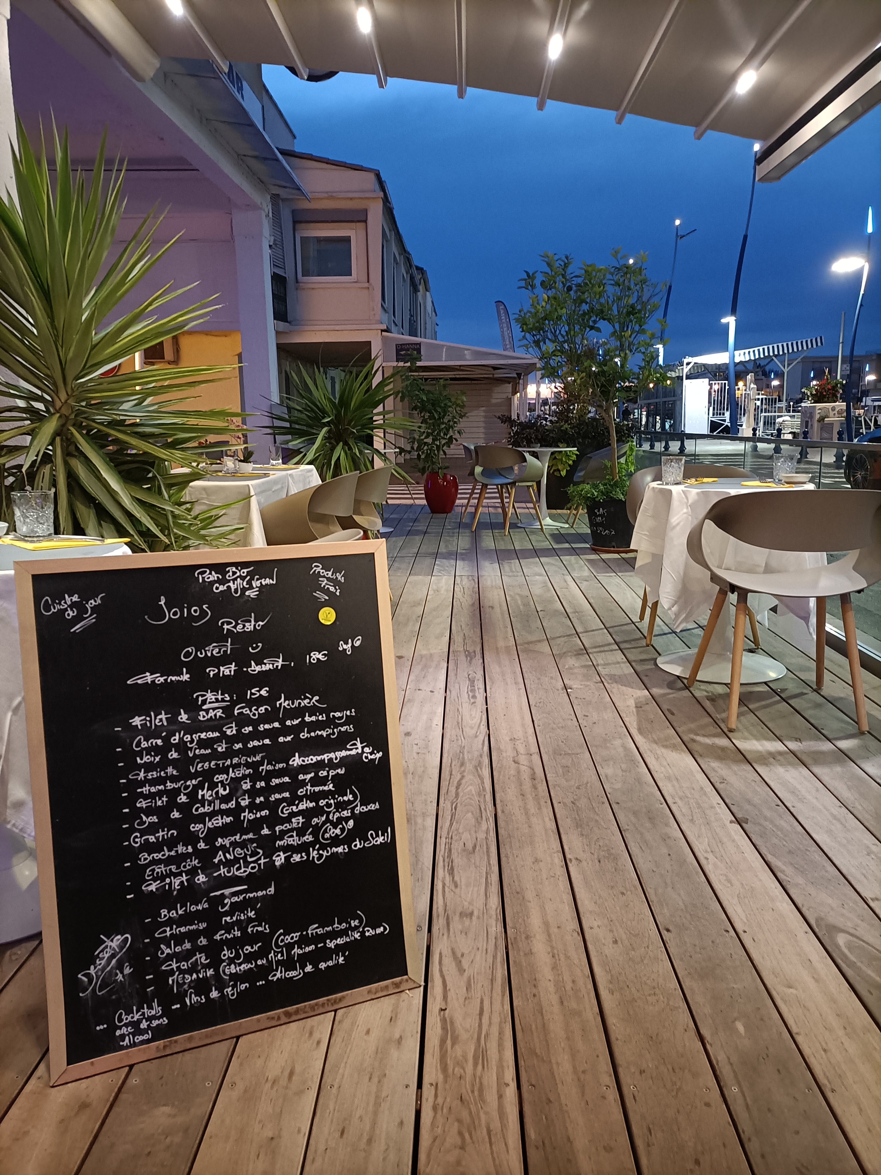 Une nouvelle adresse à Palavas pour ce restaurant qui a ouvert ses portes en juillet 2021. En plus du restaurant, encore en mutation avec sa salle intérieure en travaux, l'hôtel et le bar viennent compléter un concept en pleine évolution. Pour ce qui est du restaurant, une belle découverte au rapport qualité/prix imbattable pour des produits frais (15€ le plat !). La décoration est moderne dans une ambiance lounge très adaptée à l'arrière saison. Le service est agréable et les attentions de l'équipe, que je vous laisse découvrir, sont là (nous avions réservé pour un anniversaire). La carte assure à chacun de trouver son bonheur entre les poissons issus de la pêche du jour, les viandes et même le plat végétarien. Le seul point d'amélioration serait la longueur du service (40/45min pour 2 plats) mais le cuisiner etait seul et tout est préparé à la commande. Le prix à payer du frais et d'une équipe en construction. Rien de rédhibitoire ! Pour un emplacement au cœur de la zone touristique de Palavas où la qualité des produits est souvent délaissée pour optimiser les profits de la saison, le Joios fait figure d'exception. Un bel endroit à découvrir avec juste un peu de patience pour cette adresse qui monte à Palavas.