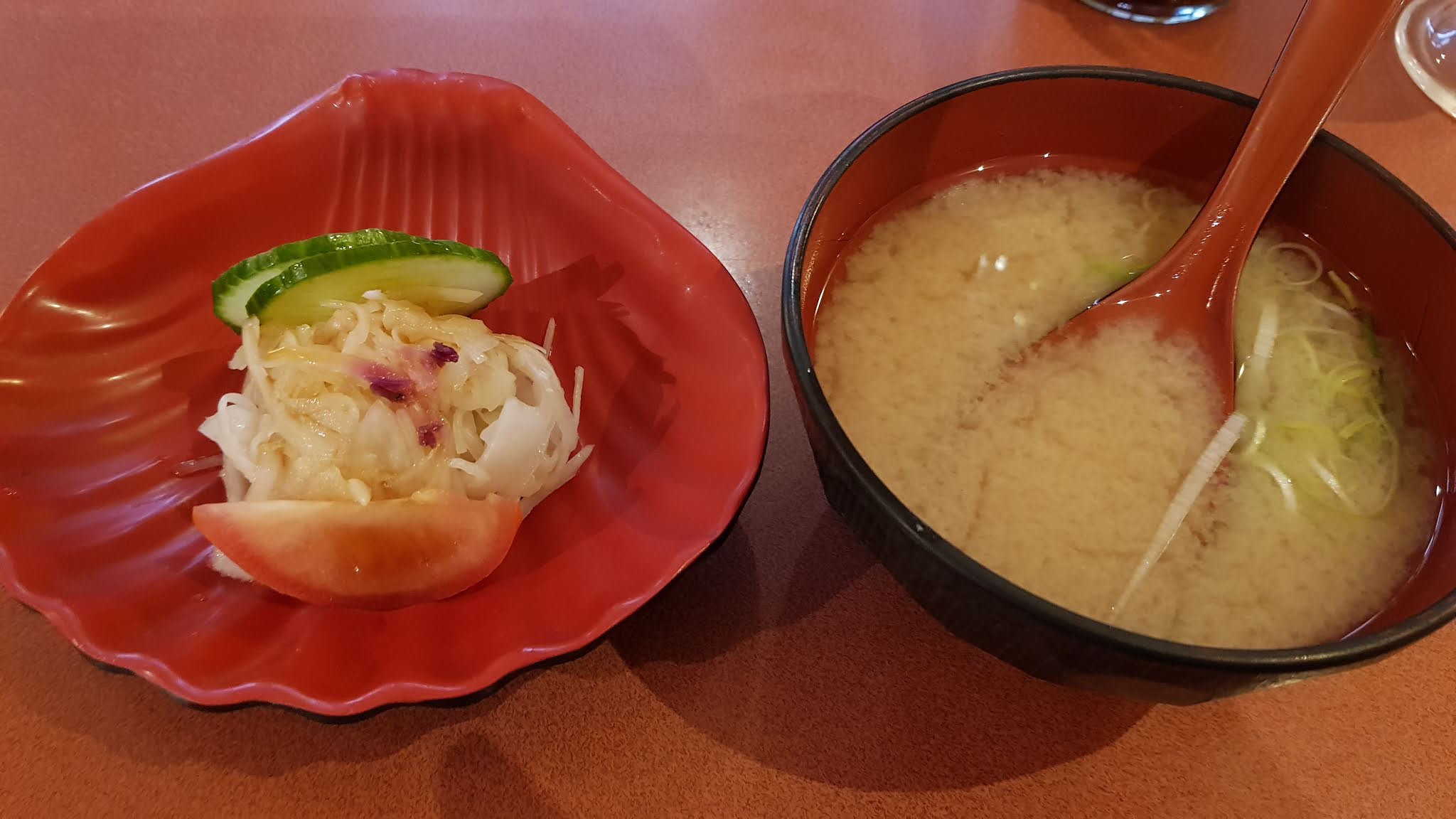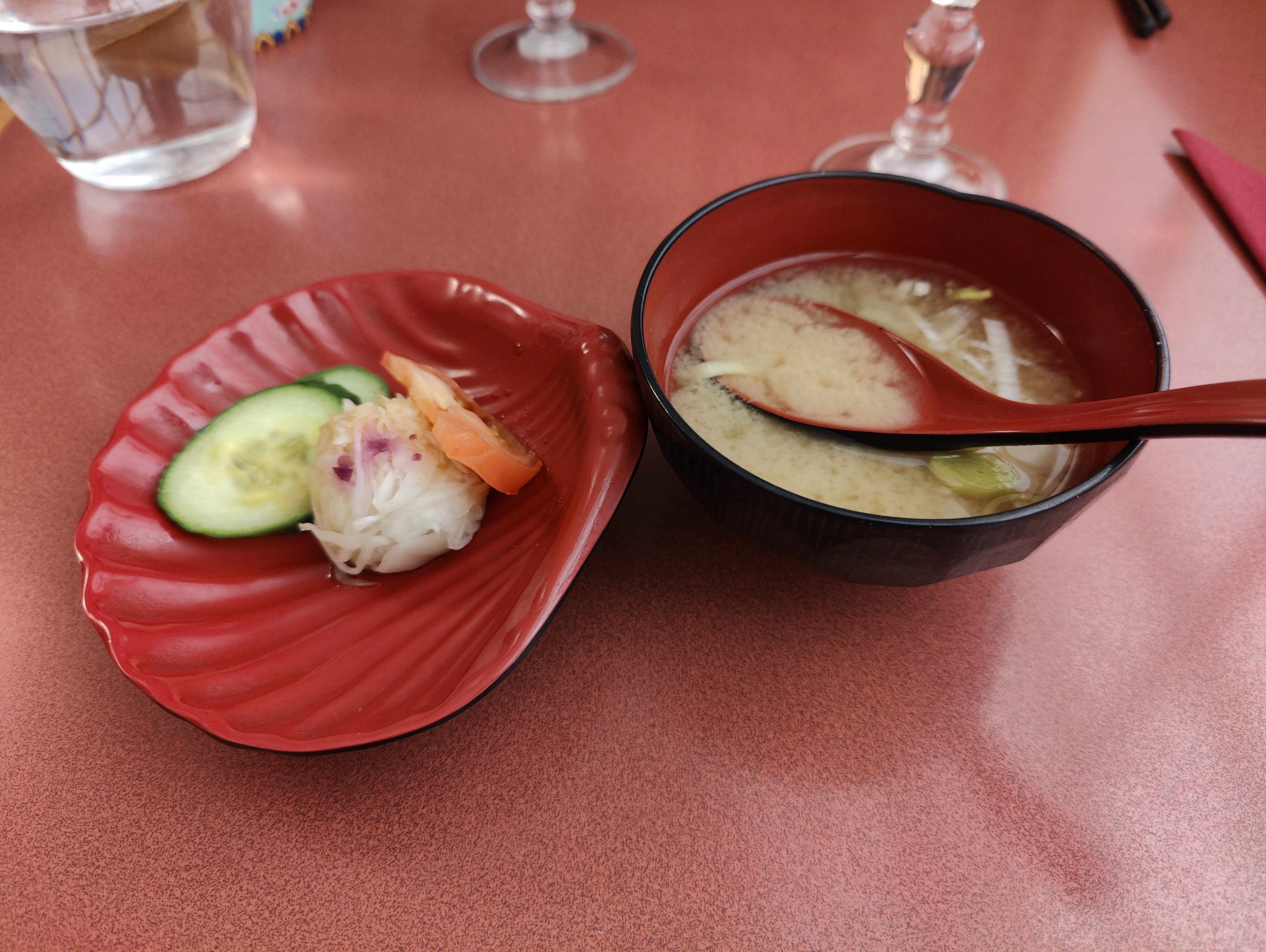 J'ai commandé un bento que j'ai apprécié notamment pour la diversité des mets. Avant, une soupe miso et une coupelle de légumes étaient servies. Petite faute de goût, le quartier de tomate fraiche début avril. Sous nos latitudes, les tomates fraiches ne se mangent que de juillet à septembre. En dehors, c'est une hérésie. Pour le reste, j'ai dégusté avec plaisir les plats.