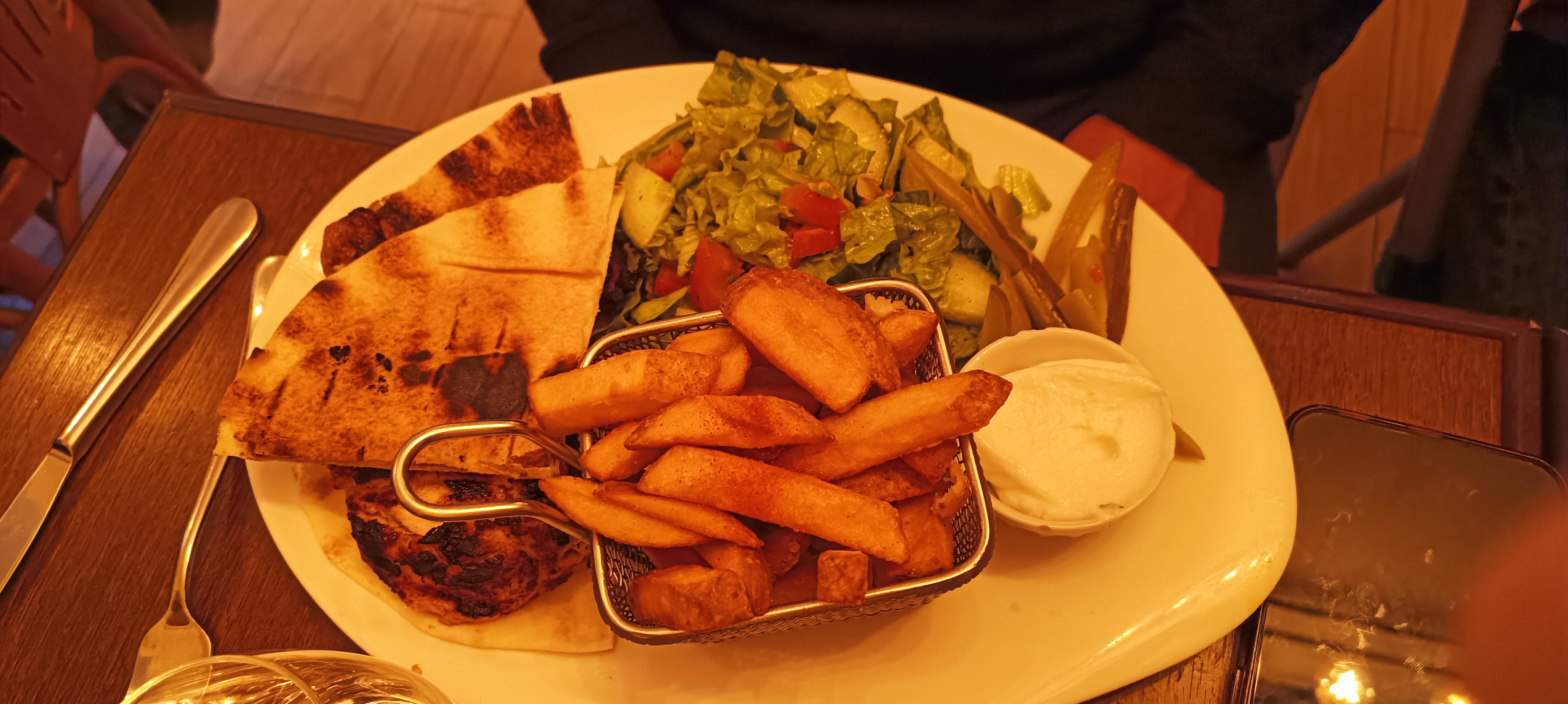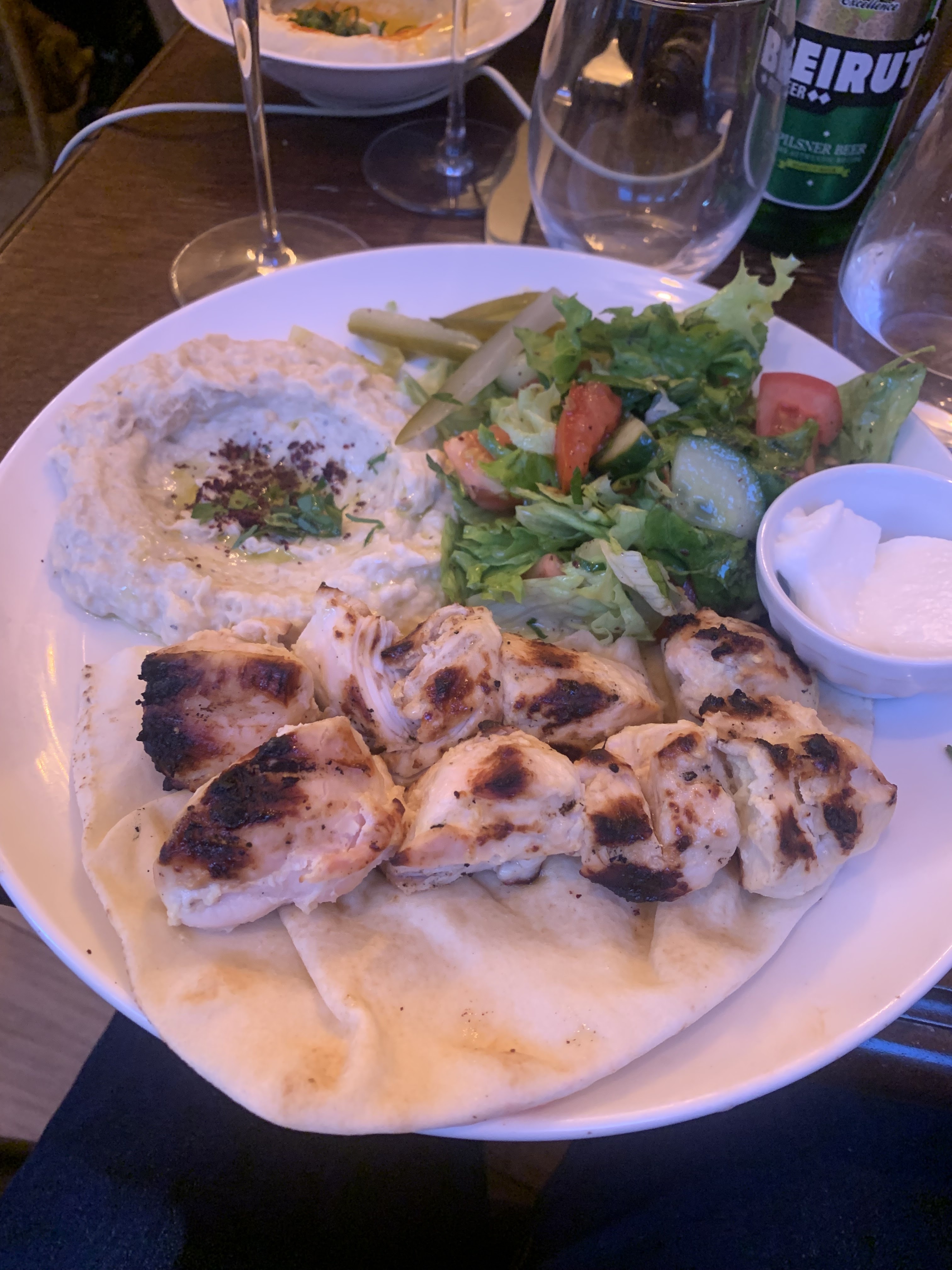 Très bonne découverte, c'est un bon restaurant libanais que j'ai découvert un peu au hasard en cherchant une bonne adresse dans le quartier Le service est très rapide Les assiettes sont copieuses et quali', on est autant dans la quantité que la qualité. La salade de poulet était aussi chargée ! Le seul reproche que j'ai à faire, c'est l'espacement entre les tables, on est un beaucoup trop serrés